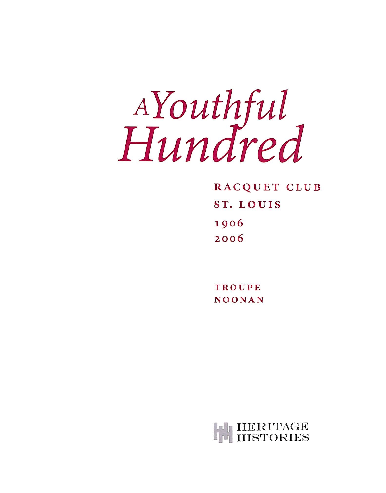 Published to commemorate their centennial, A Youthful Hundred: Racquet Club St Louis 1906-2006 chronicles the first 100 years of the Racquet Club of Saint Louis (RCSL), a historic St. Louis institution known for its elegant clubhouse (built 1906-1907) and its role in the city's social life. It covers the club's founding and formative decades, discussing its architectural significance and cultural importance to the city during the last 100 years. Includes many stories, some photos of members, lists of club members in 2006, club staff, champions, and former club presidents.