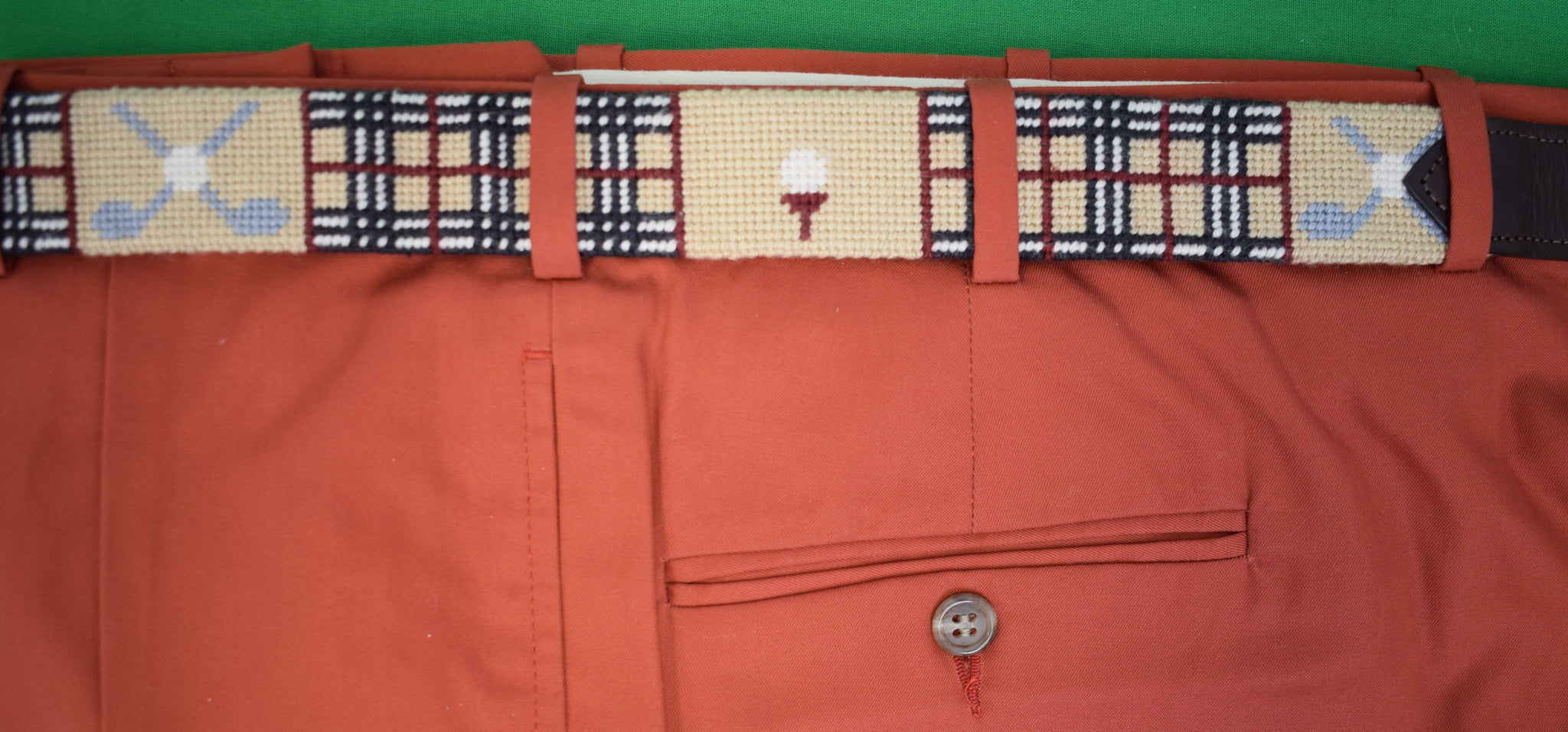 Hand Needlepoint Belt w/ Scotch Plaid Golf Motif Sz 46 (LNWOT)