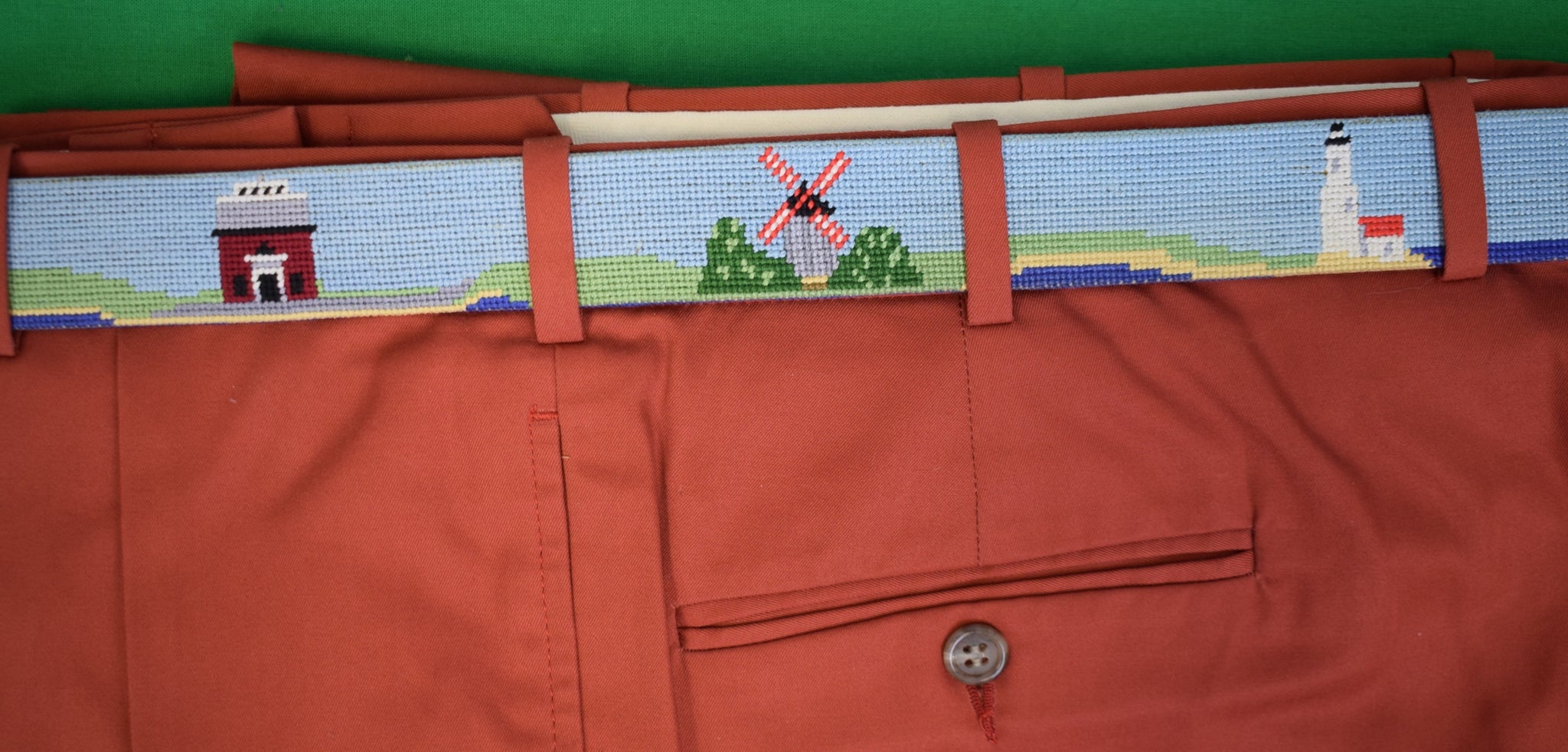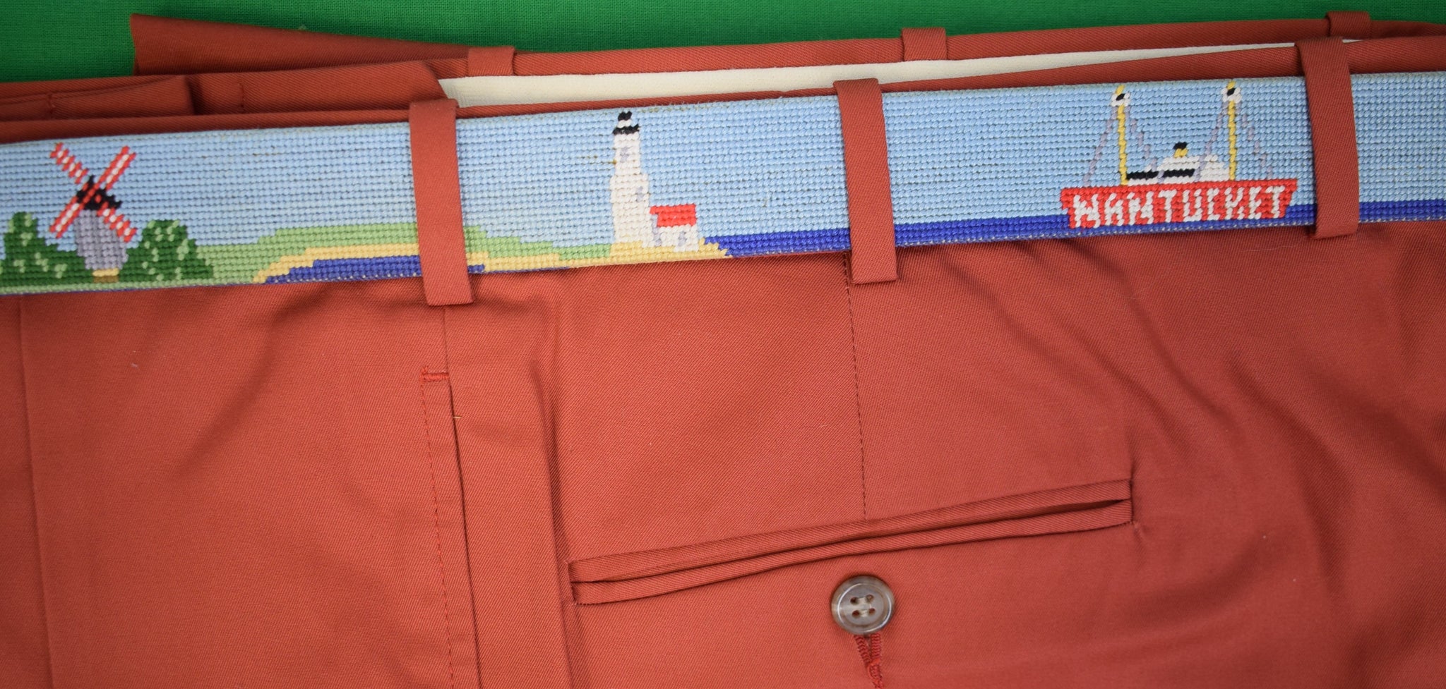 Hand-Needlepoint Nantucket Island w/ 7 Icons x Smathers & Branson Belt Sz 42