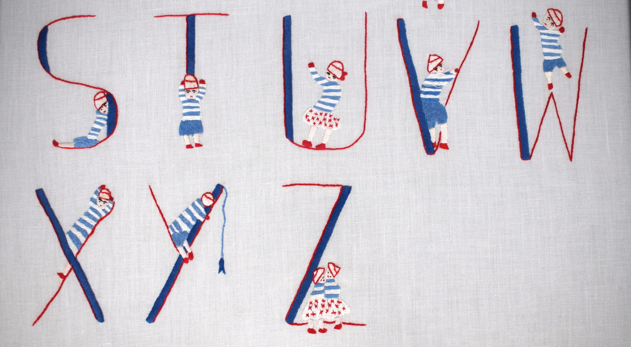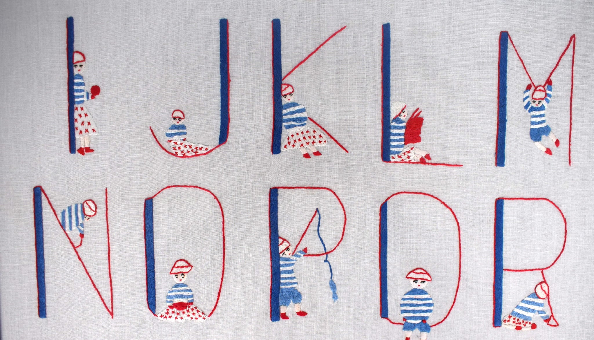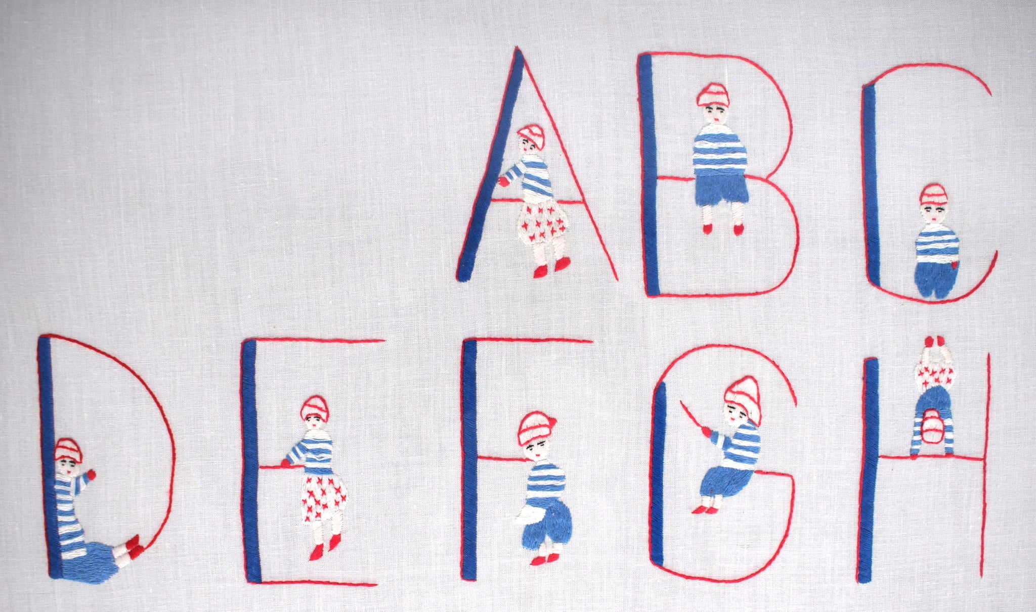 "Hand-Stitched/ Embroidered Red/ White & Blue Alphabet Linen Children's Sampler"