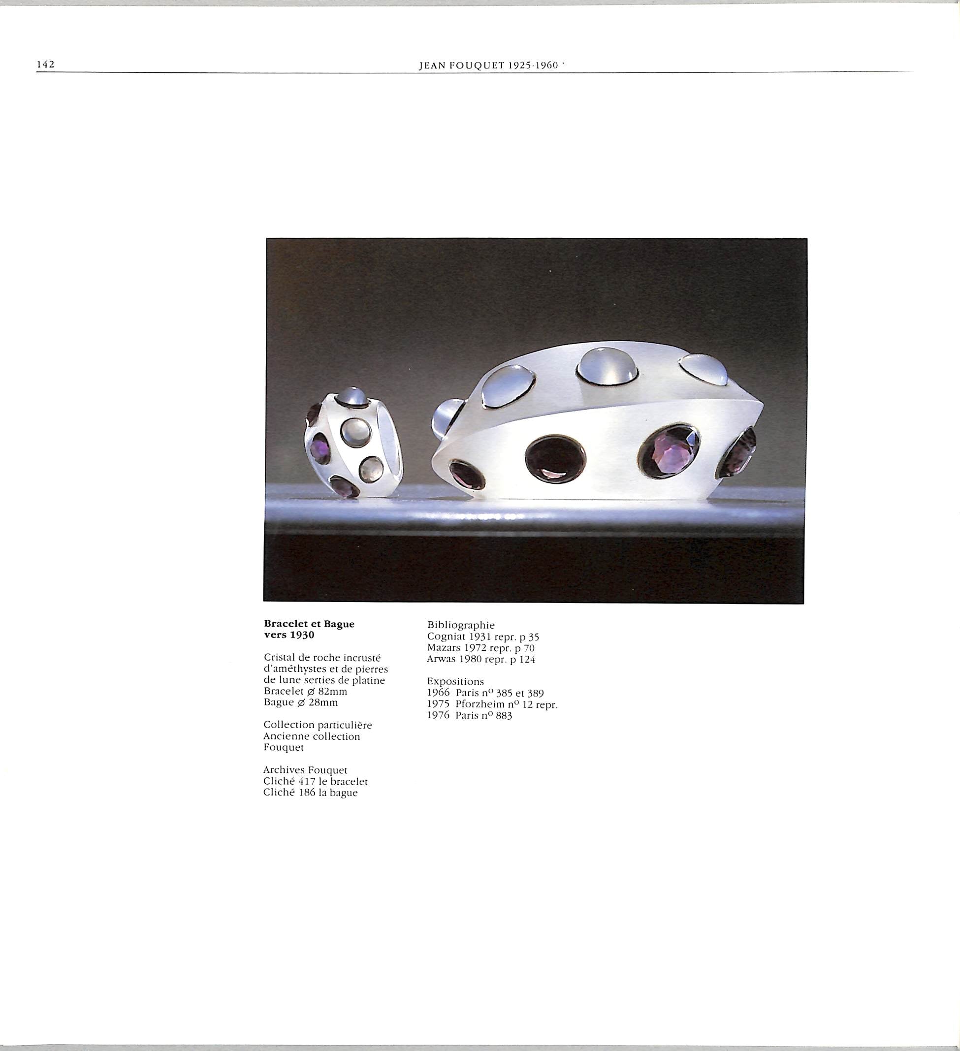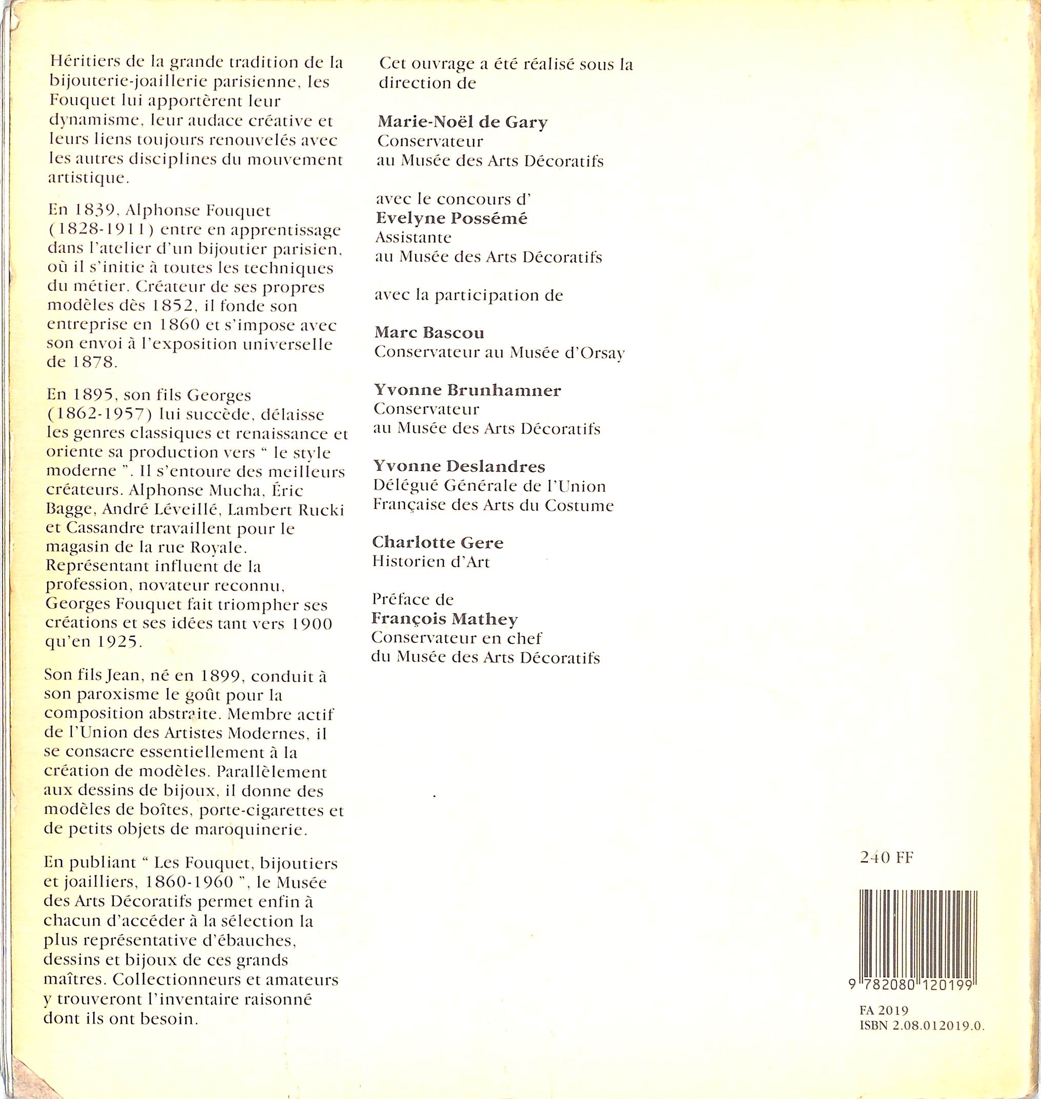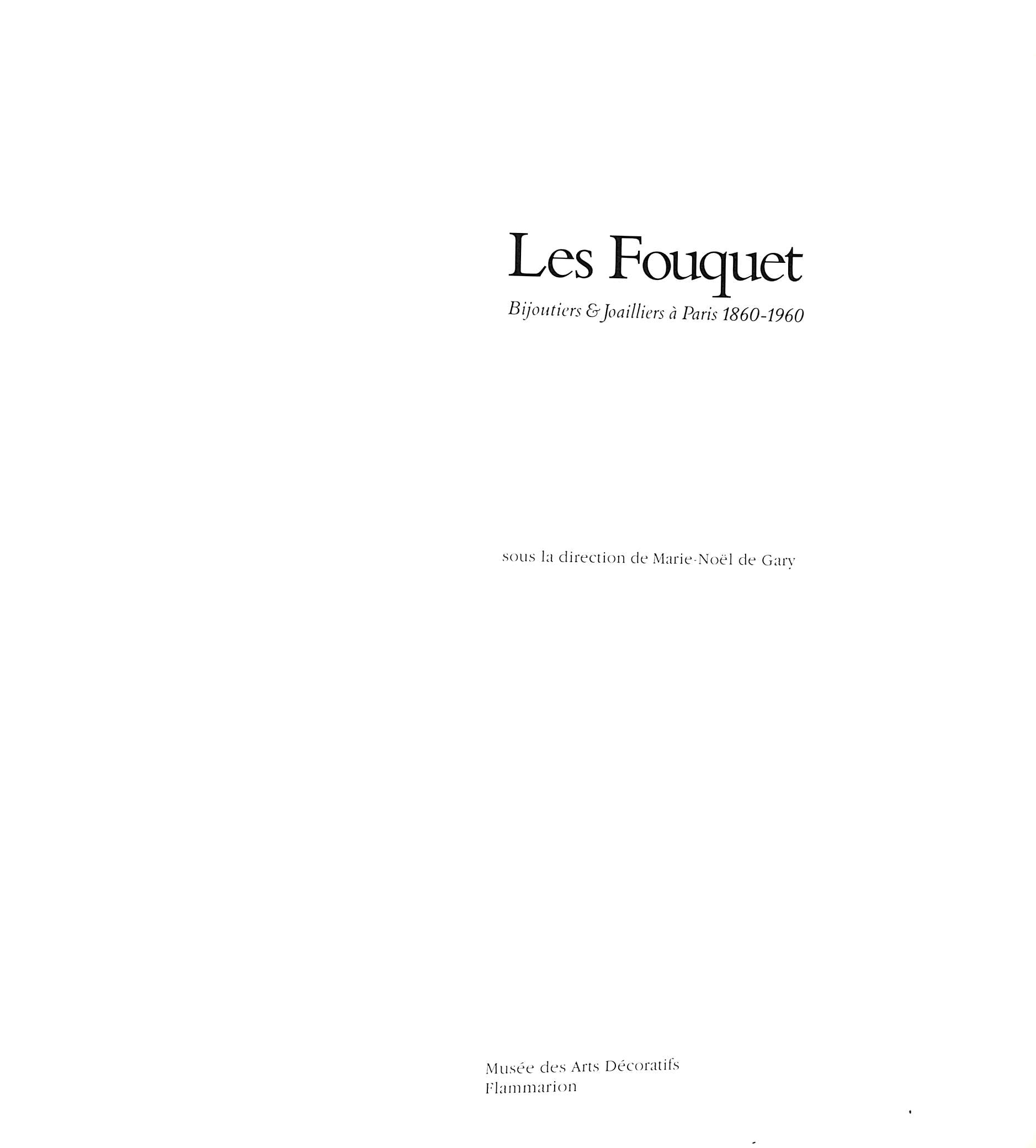 This catalog was prepared to accompany the exhibition in Paris at the Musee des arts decoratifs in 1983. Marie-Noel de Gary curated the exhibition and along with Evelyne Posseme wrote the catalog essays and entries. Separate chapters on each of the Fouquets: Alphonse Fouquet director Maison Fouquet 1860-1895; Georges Fouquet director Maison Fouquet 1895-1936; and Jean Fouquet active in Maison Fouquet from 1925-1960. Illustrated in color and black & white with photographs and drawings.