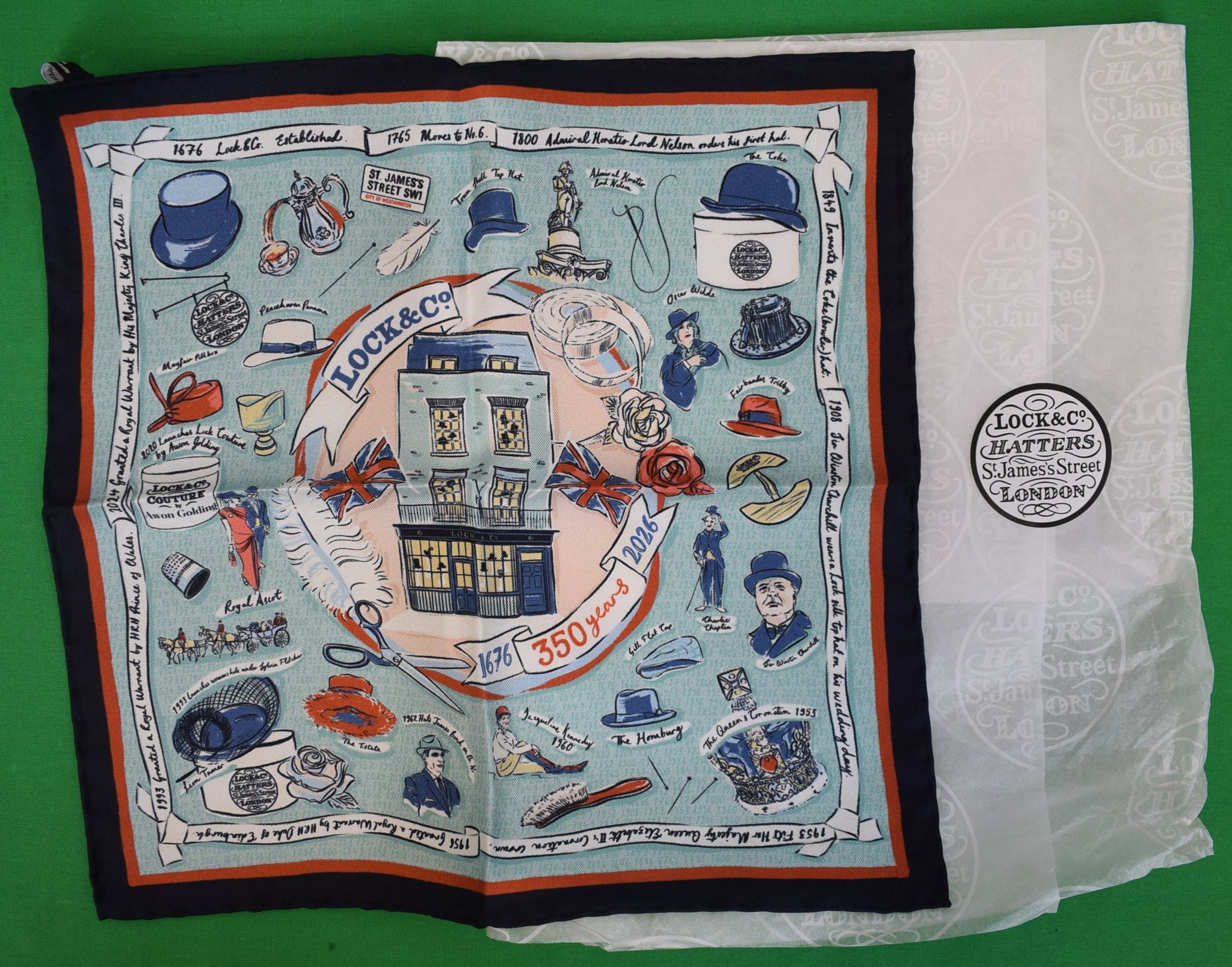 Each design brings together some of the most significant moments from our 350-year history of hat-making, illustrated alongside iconic clients and the familiar tools of the trade that define Lock & Co. The pocket square presents the detailed storytelling in a 30 × 30 cm format.
