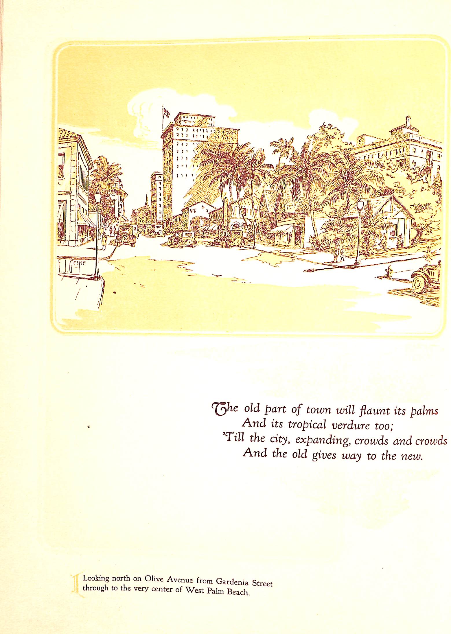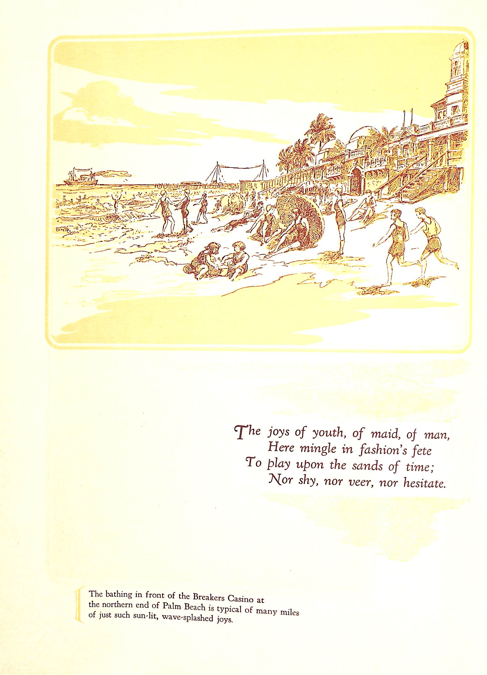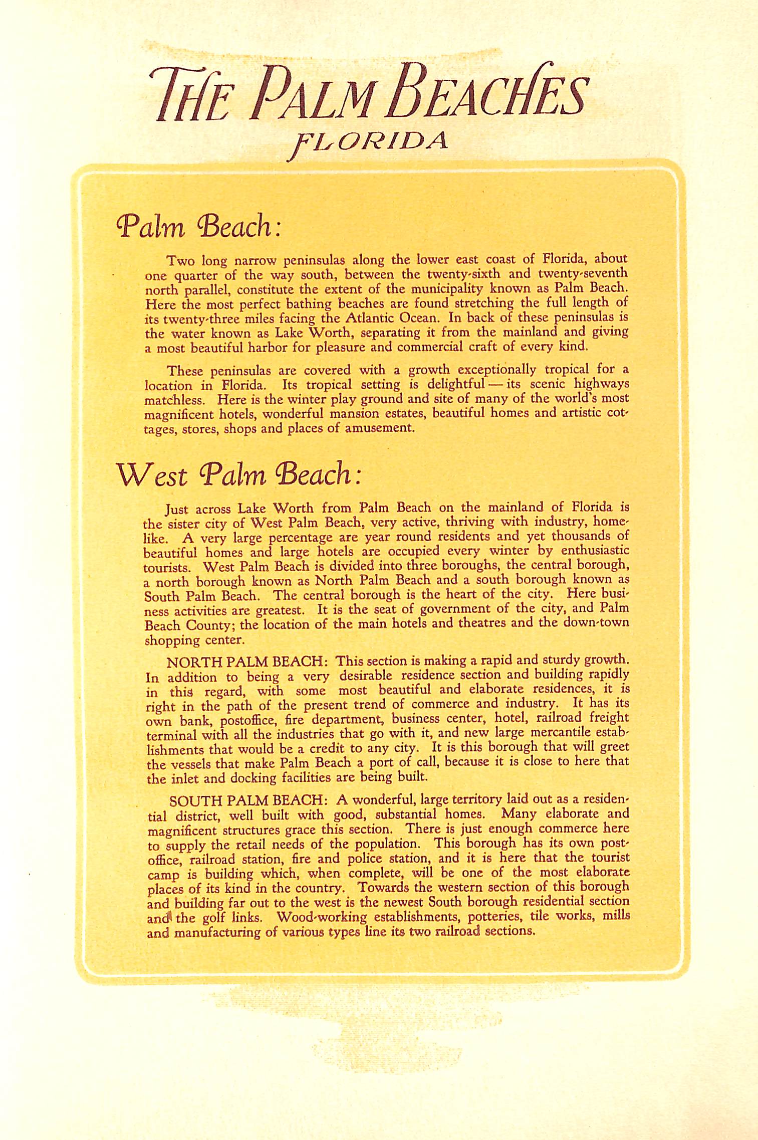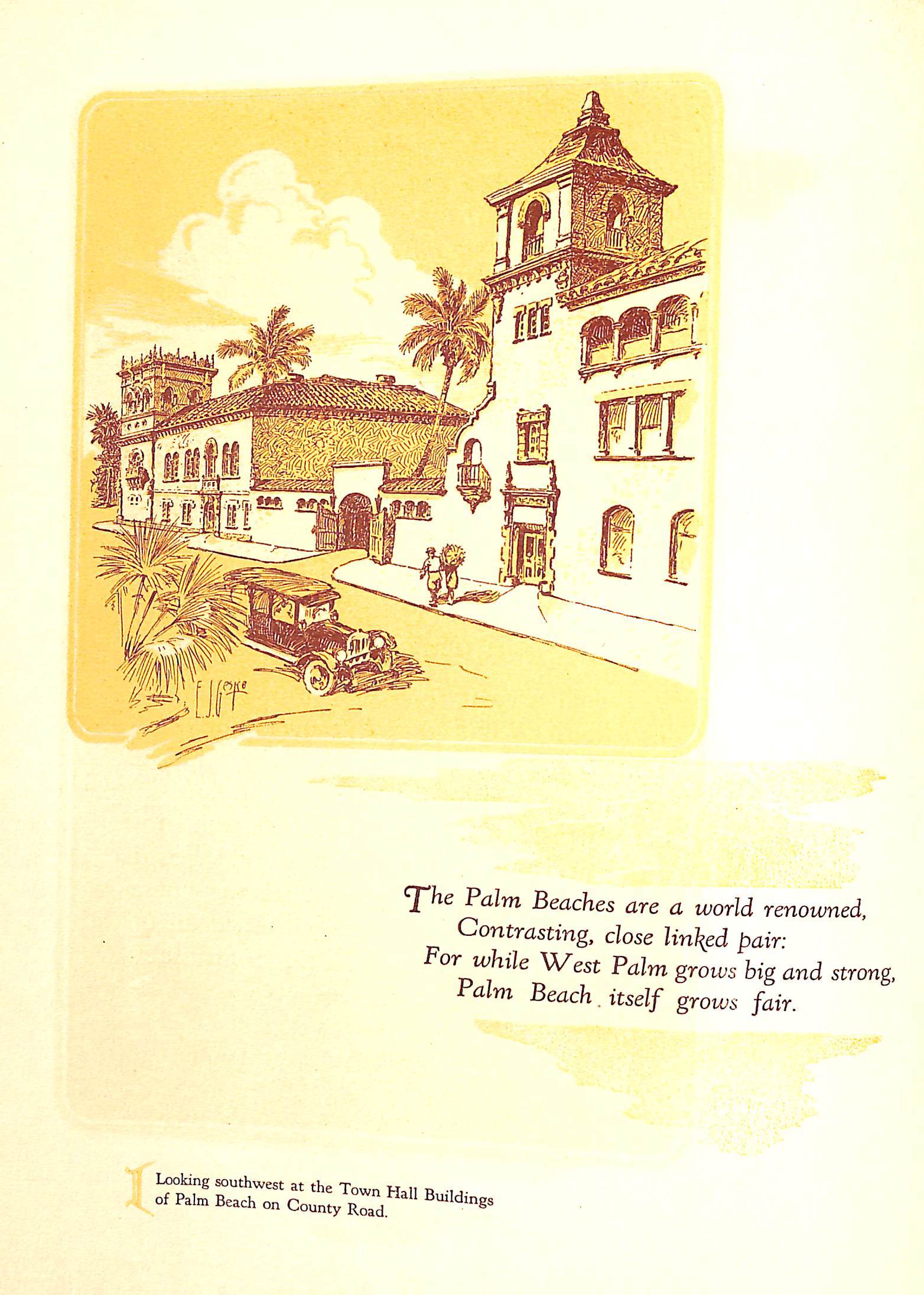 Published in 1926, this lavishly illustrated art booklet offers a detailed view of the areas of North, South, West, and Palm Beach. Each page offers an elaborate illustration accompanied by detailed description of the most iconic buildings, estates, beaches and boroughs of the Palm Beaches. Illustrations include Worth Avenue and Via Mizner, the Breakers Casino and beach, Alba the Magnificent, the Everglades Club, Clematis Street, and Woodlawn Cemetery.