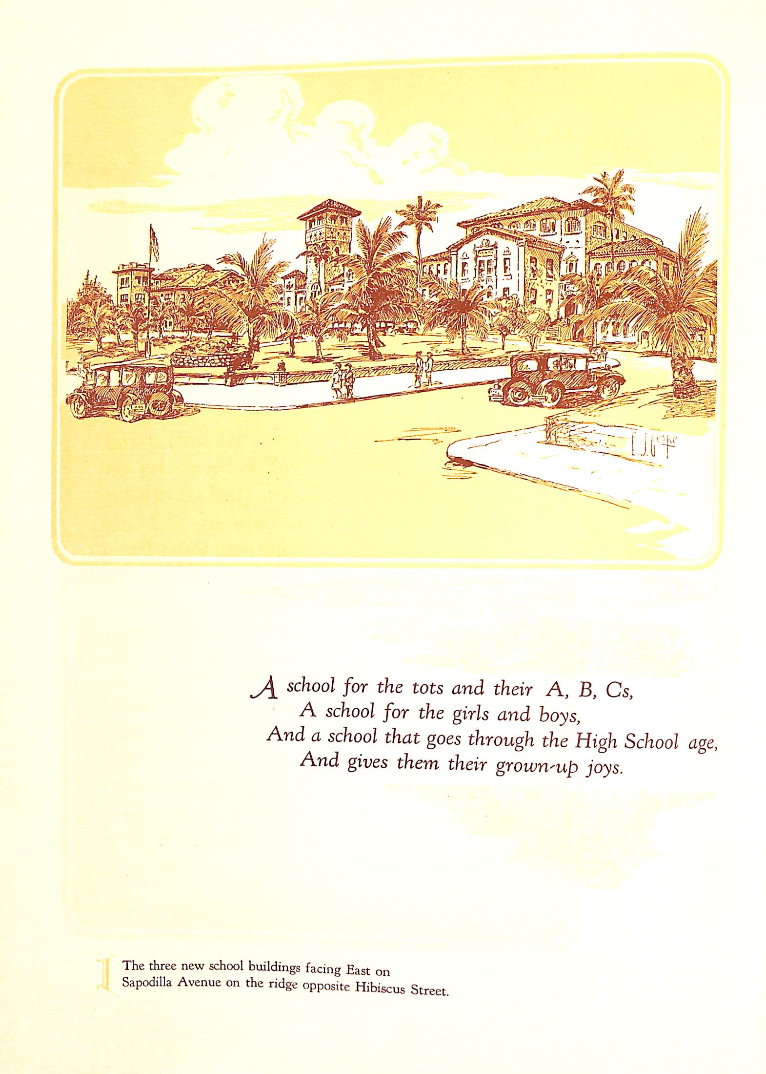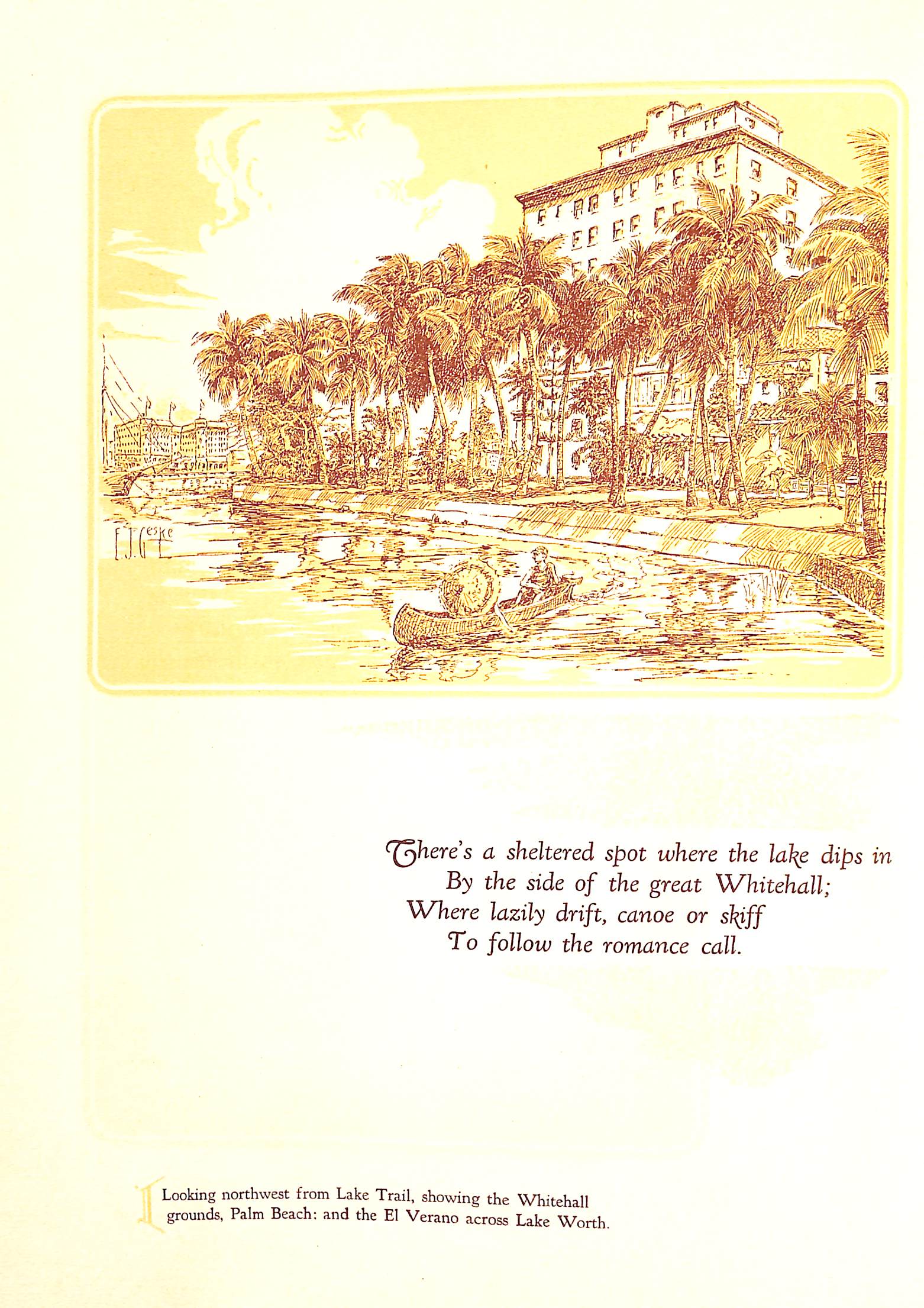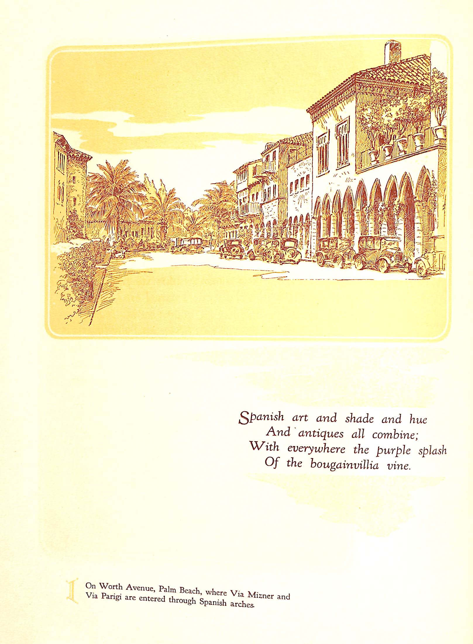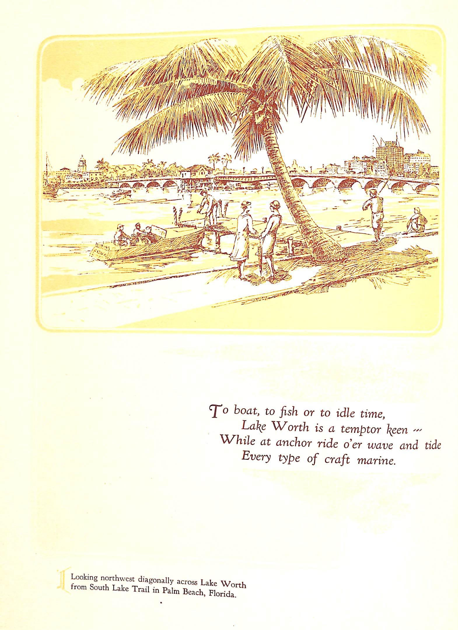 Published in 1926, this lavishly illustrated art booklet offers a detailed view of the areas of North, South, West, and Palm Beach. Each page offers an elaborate illustration accompanied by detailed description of the most iconic buildings, estates, beaches and boroughs of the Palm Beaches. Illustrations include Worth Avenue and Via Mizner, the Breakers Casino and beach, Alba the Magnificent, the Everglades Club, Clematis Street, and Woodlawn Cemetery.