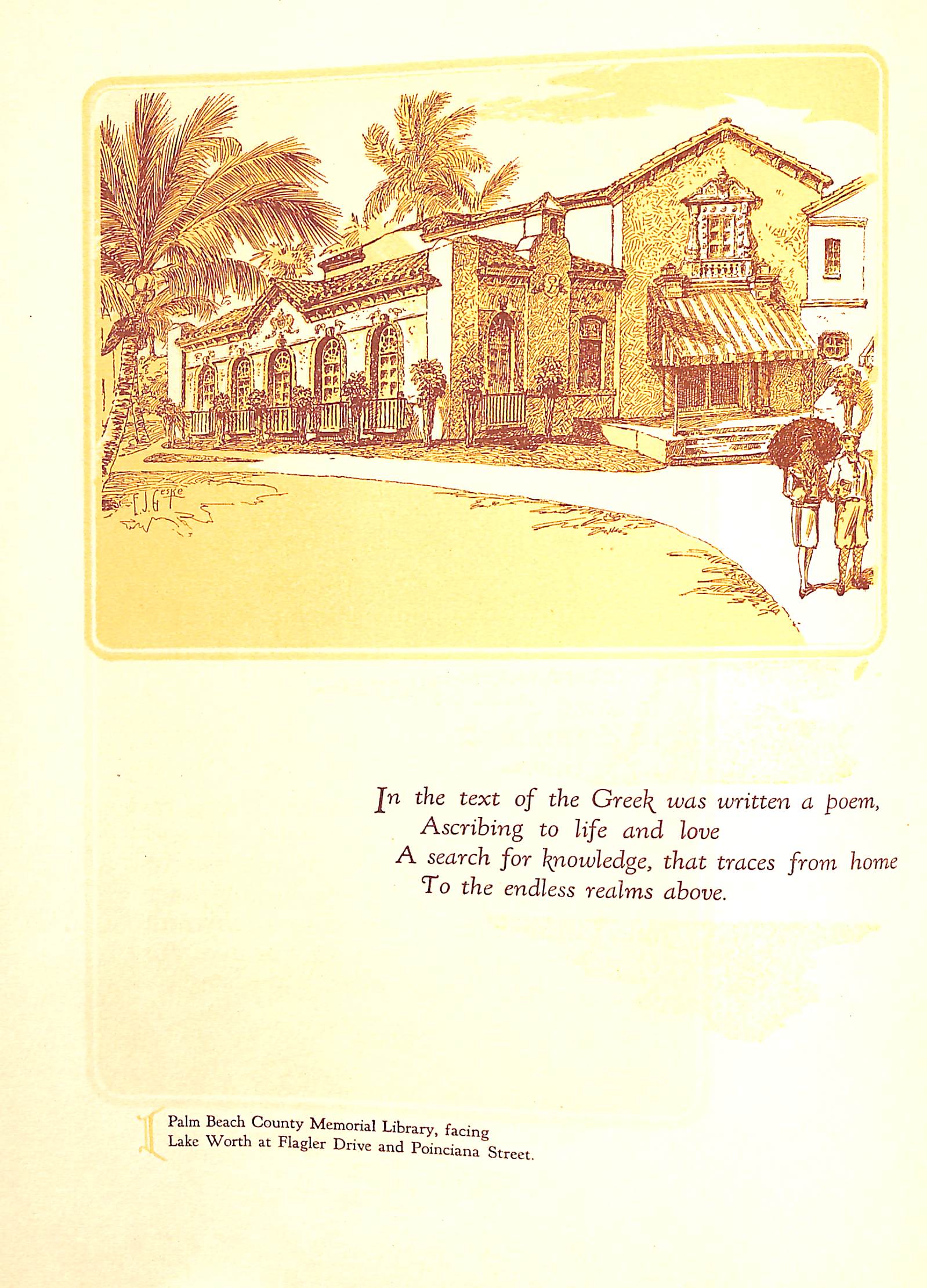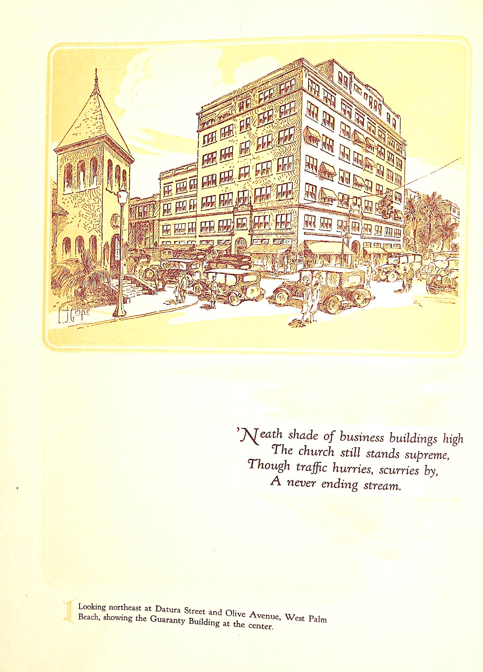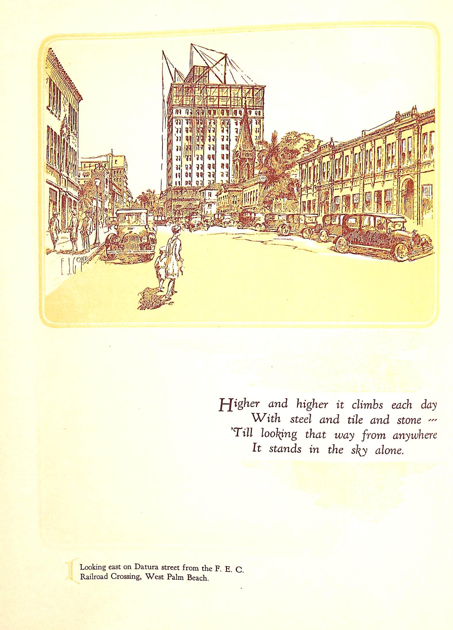 First edition of this beautiful presentation of the area and most iconic buildings of Palm Beach. Quarto, original wrappers with gilt titles and tooling to the spine, watercolor inlay of downtown West Palm Beach to the front panel, illustrated title page with tissue guard, copiously illustrated by E. J. Geske. In near fine condition.