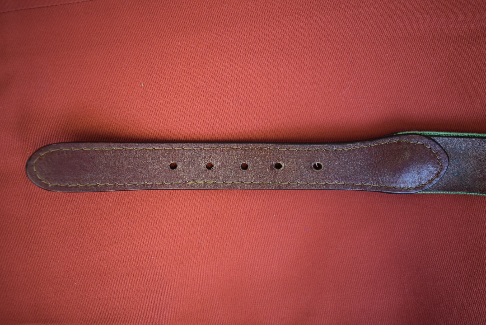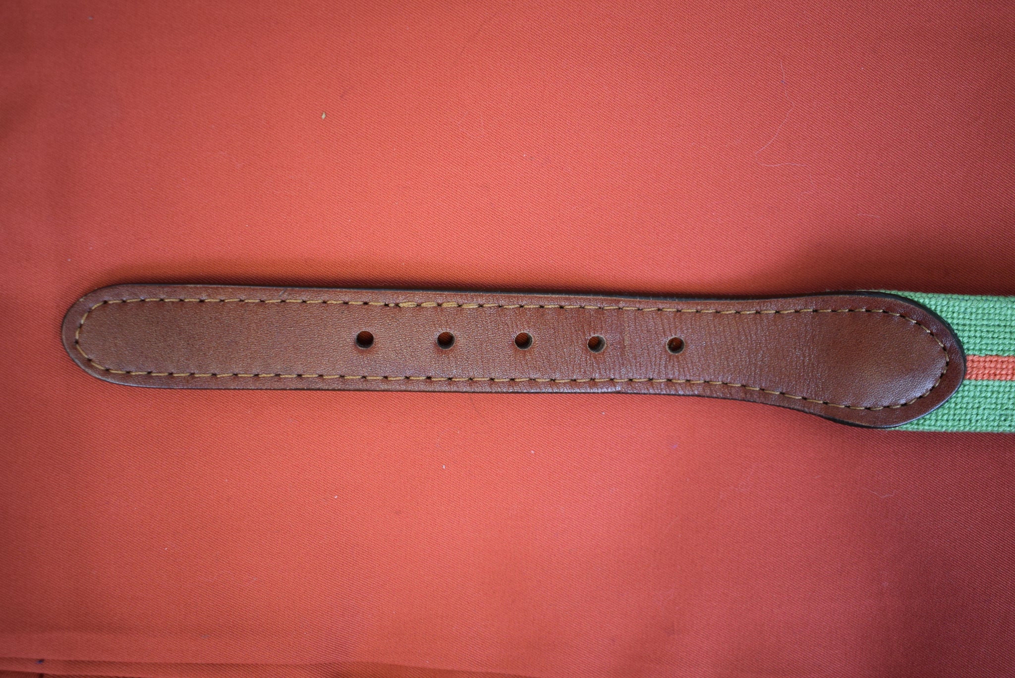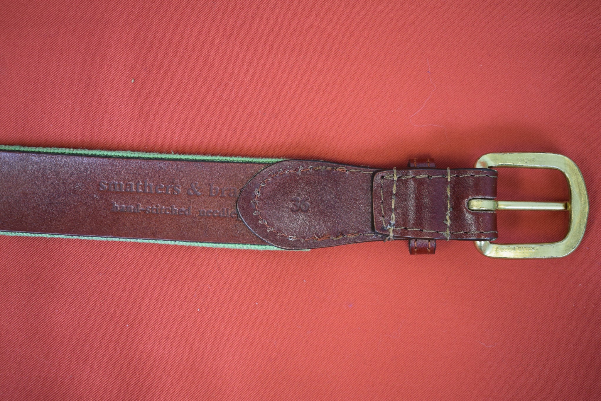 "S&B Hand Needlepoint Seafoam Green w/ Coral Red Stripe Belt" Sz: 36