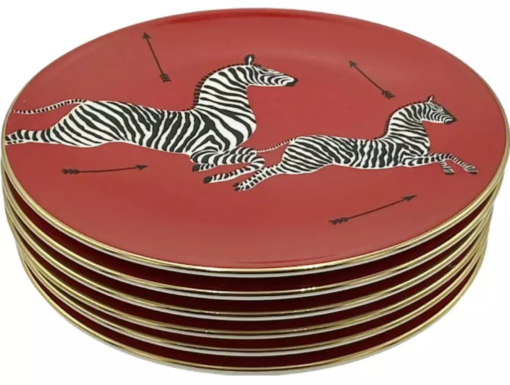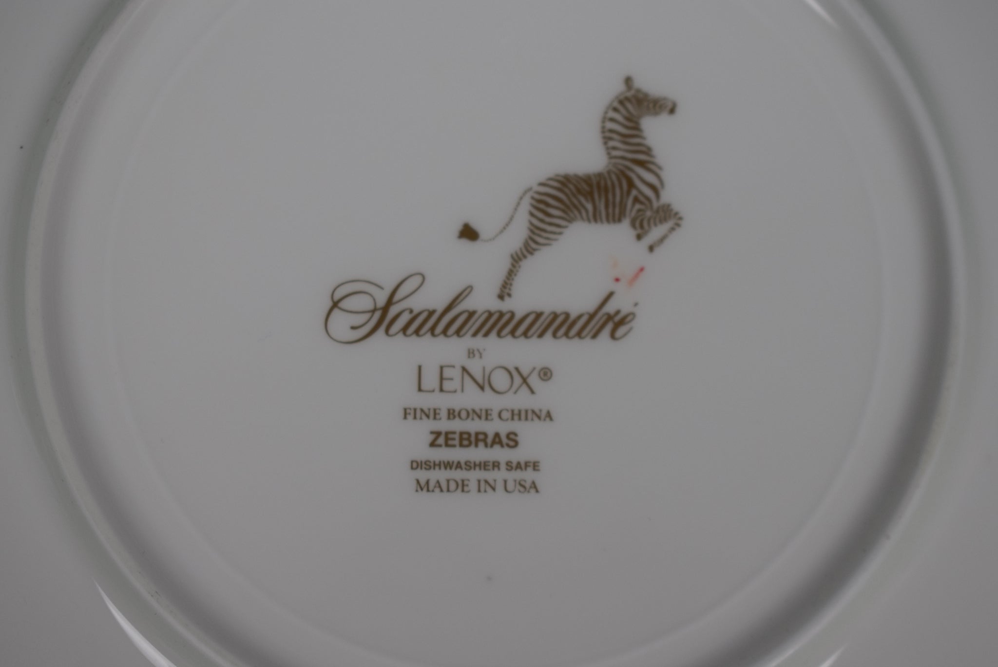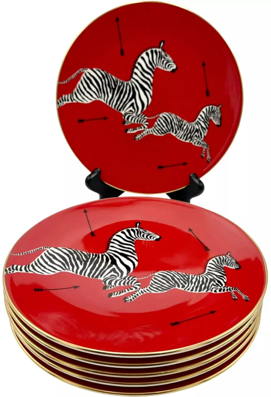 Scalamandré's iconic zebra-inspired designs stand out in bold black and white against dramatic red details on fine bone china. Rimmed in gold, contemporary and striking, Zebras dinnerware brings decorator inspired art to your table. Lenox Zebras by Scalamandré is not safe for use in the microwave. Dishwasher safe.