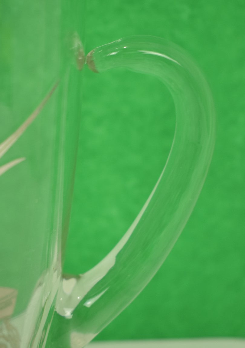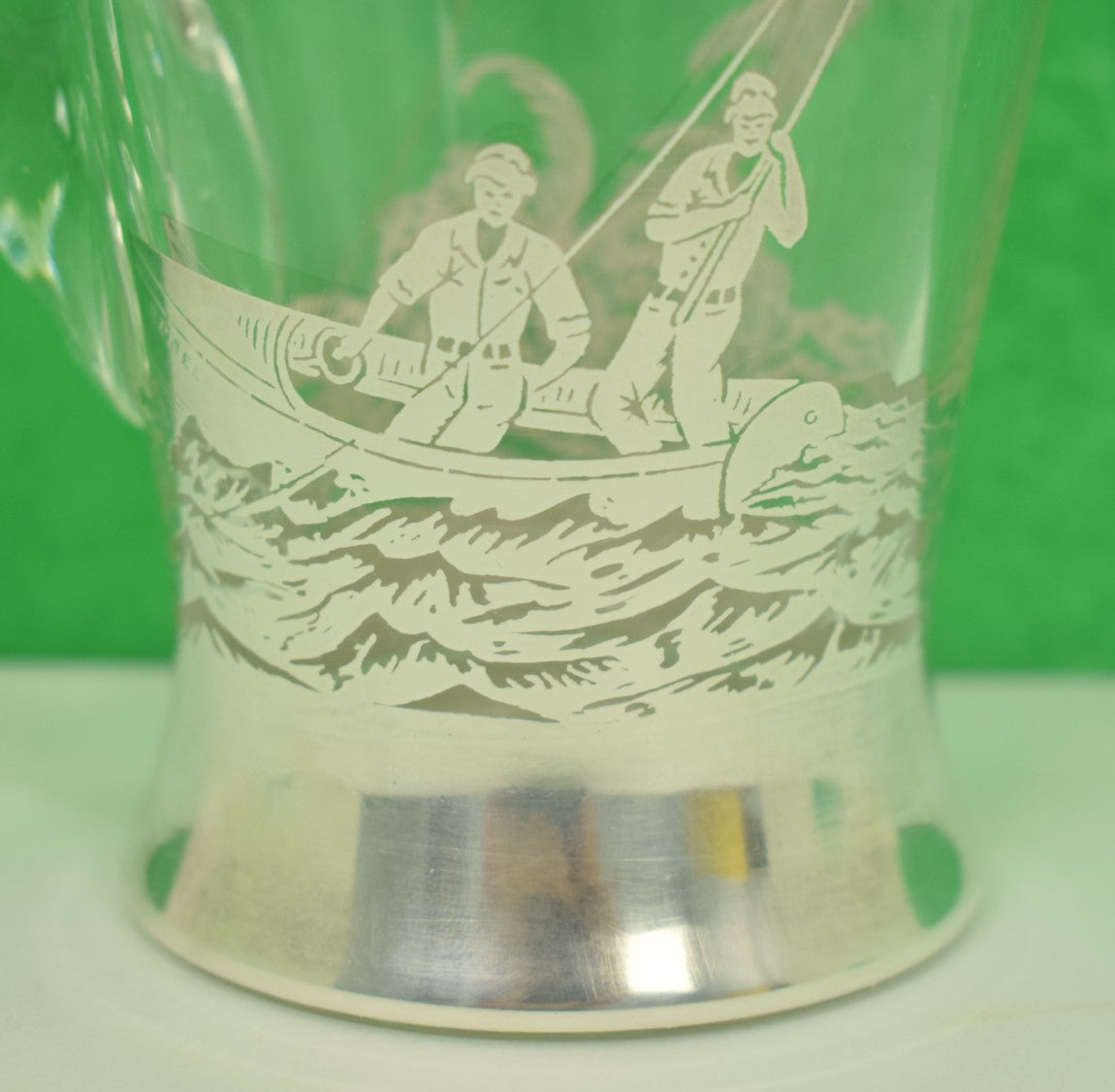 Vintage mid-20th century clear glass cocktail pitcher with pinched ice-dam lip decorated by Rockwell Silver Co. using a silver deposit technique and having a silver rim above a large leaping sailfish to one side. The other side with fishermen in a small boat sitting atop waves rising from the fully silvered base. The bow of the boat pierced with the word Spree.
