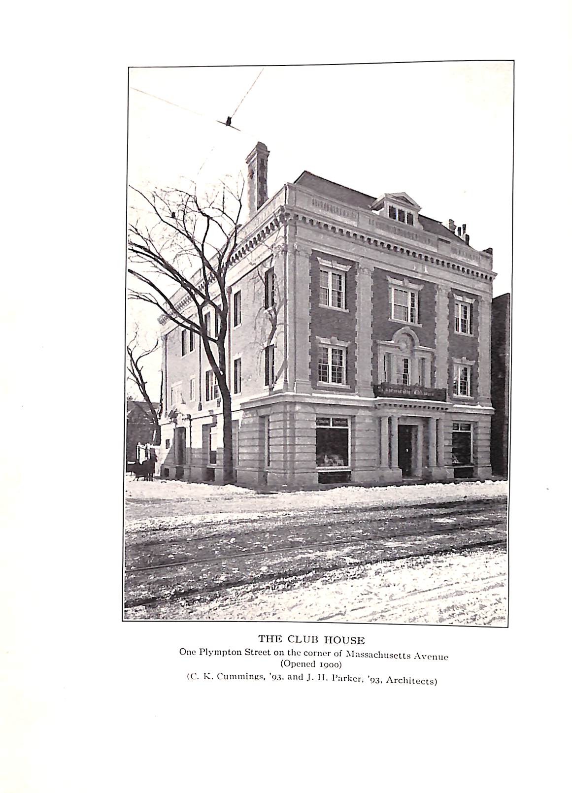 In April 1899, the club purchased the property from the Helen Niles estate, at the corner of Plympton Street and Massachusetts Avenue in Cambridge. There, construction began on a new clubhouse in May 1900. In September 1900, the club moved to its present clubhouse at 1 Plympton Street. The club occupied the top two stories of the brick and stone building and rented the first floor to a music store and a tailor's shop.