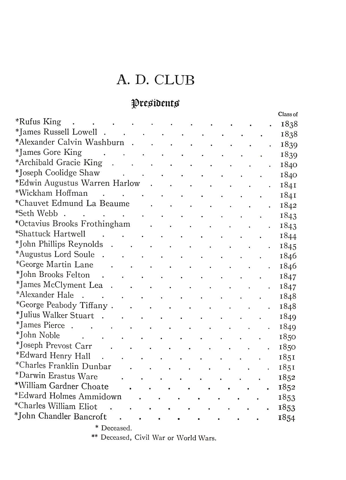 The A.D. Club originated at Harvard University in Cambridge, Massachusetts in 1836 as Alpha Delta Phi fraternity. It was founded by editors of the college's monthly literary magazine. It was considered an honorary chapter, with its members having honorary membership to other chapters, because Harvard did not allow secret societies on campus at that time. Its founding members were John Bacon, William Augustus Davis, John Fenwick Eustis, Horatio Emmons Hale, Charles Hayward, Samuel Tenney Hildreth, Charles Stearns Wheeler, and Henry Williams.