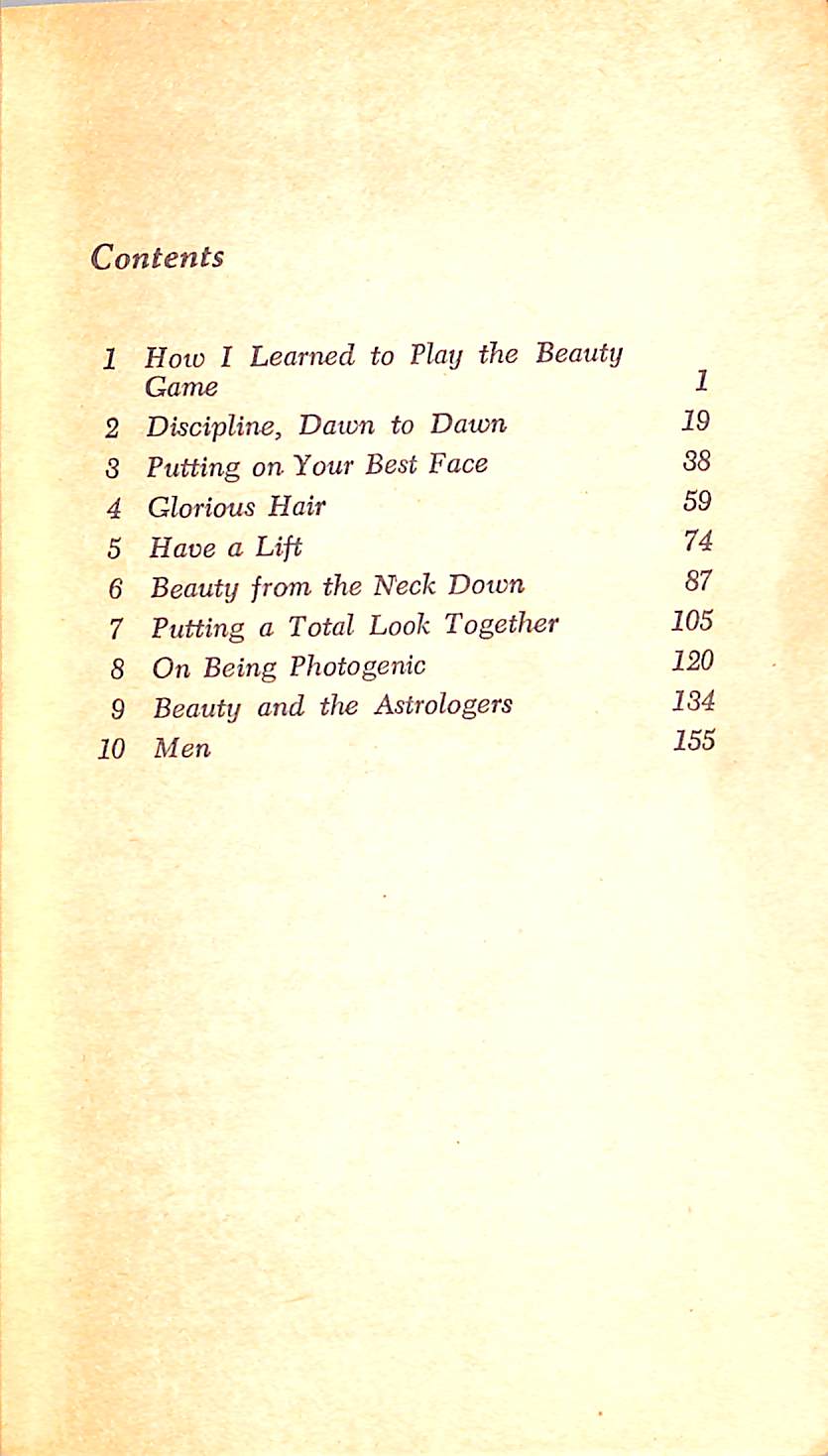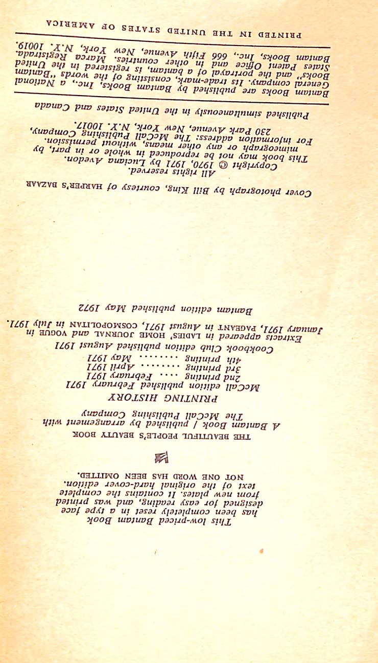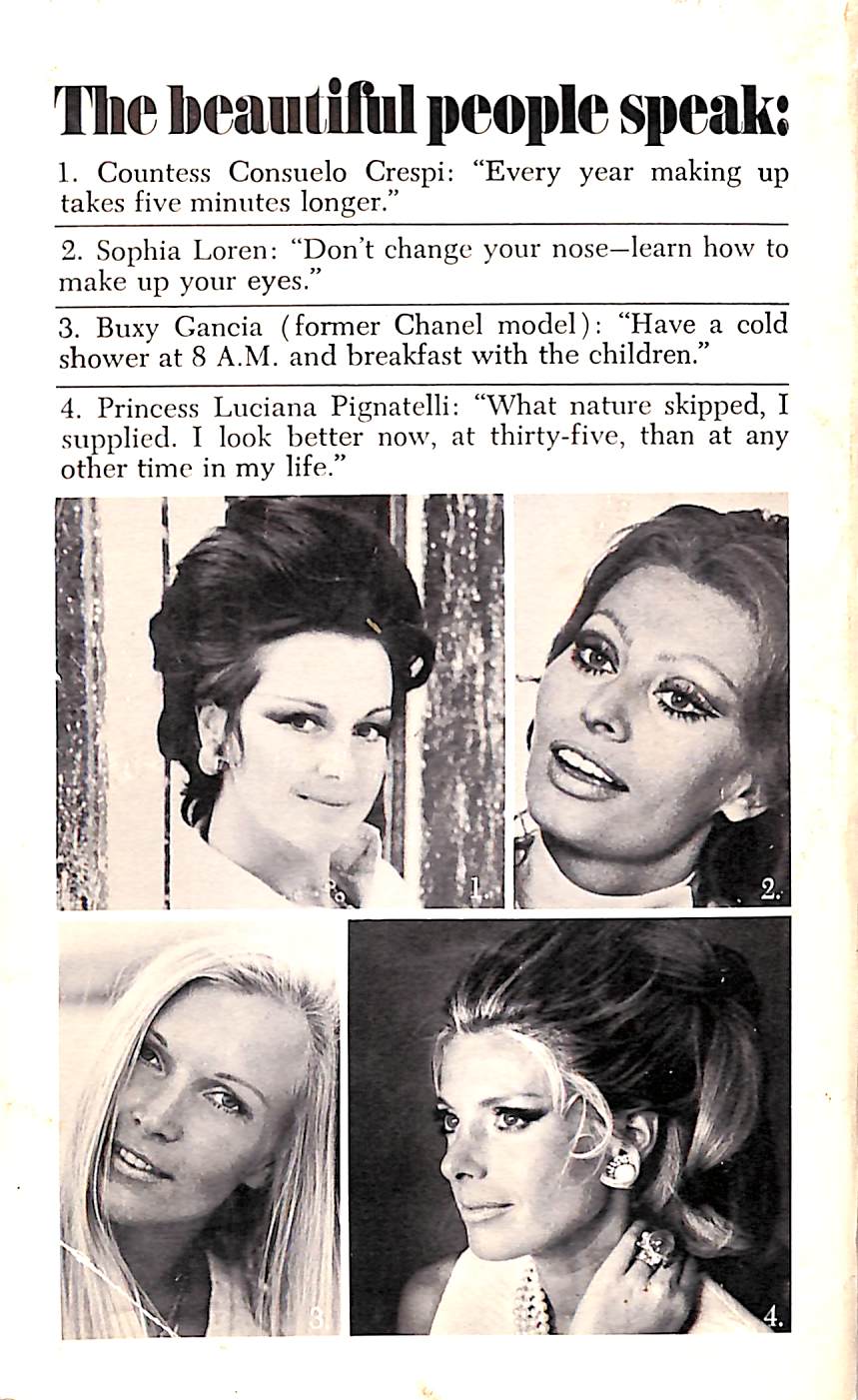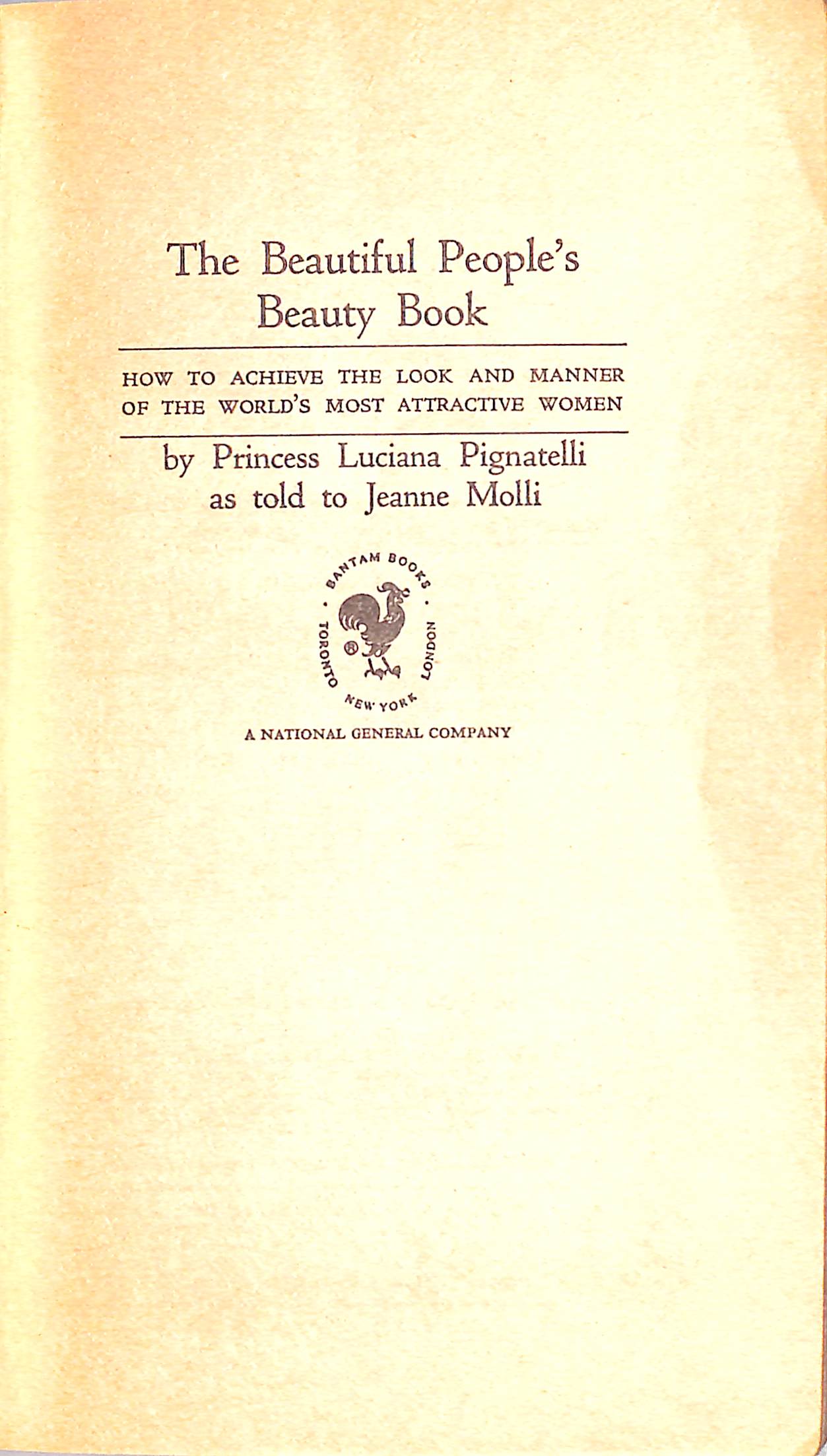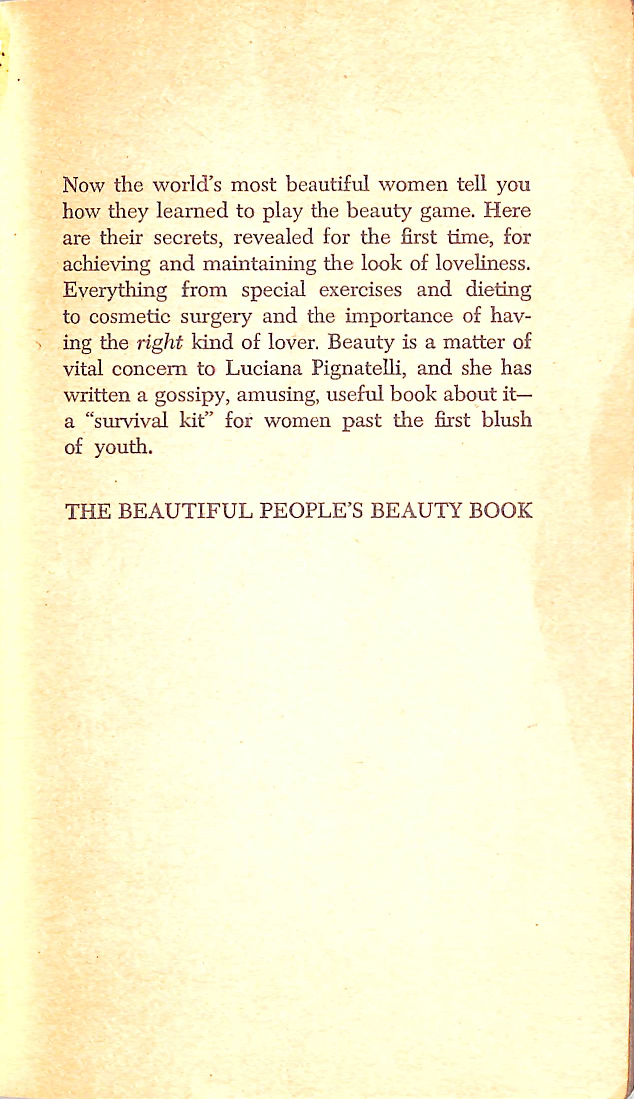 They say that when in Rome do as the Romans do. Pignatelli, a leading member of Rome’s midcentury glitterati, makes the case that one should do as the Romans do even when not in Rome. In this jet set beauty book, she mixes her own advice with that of friends such as Marella Agnelli, Valentino, Sophia Loren, Consuelo Crispi, Talitha Getty, Emilio Pucci, and Princess Ira von Furstenberg. In addition to the expected chapters on plastic surgery, diet, make-up, and fashion, there is one on how astrology can be utilized to improve one’s appearance.