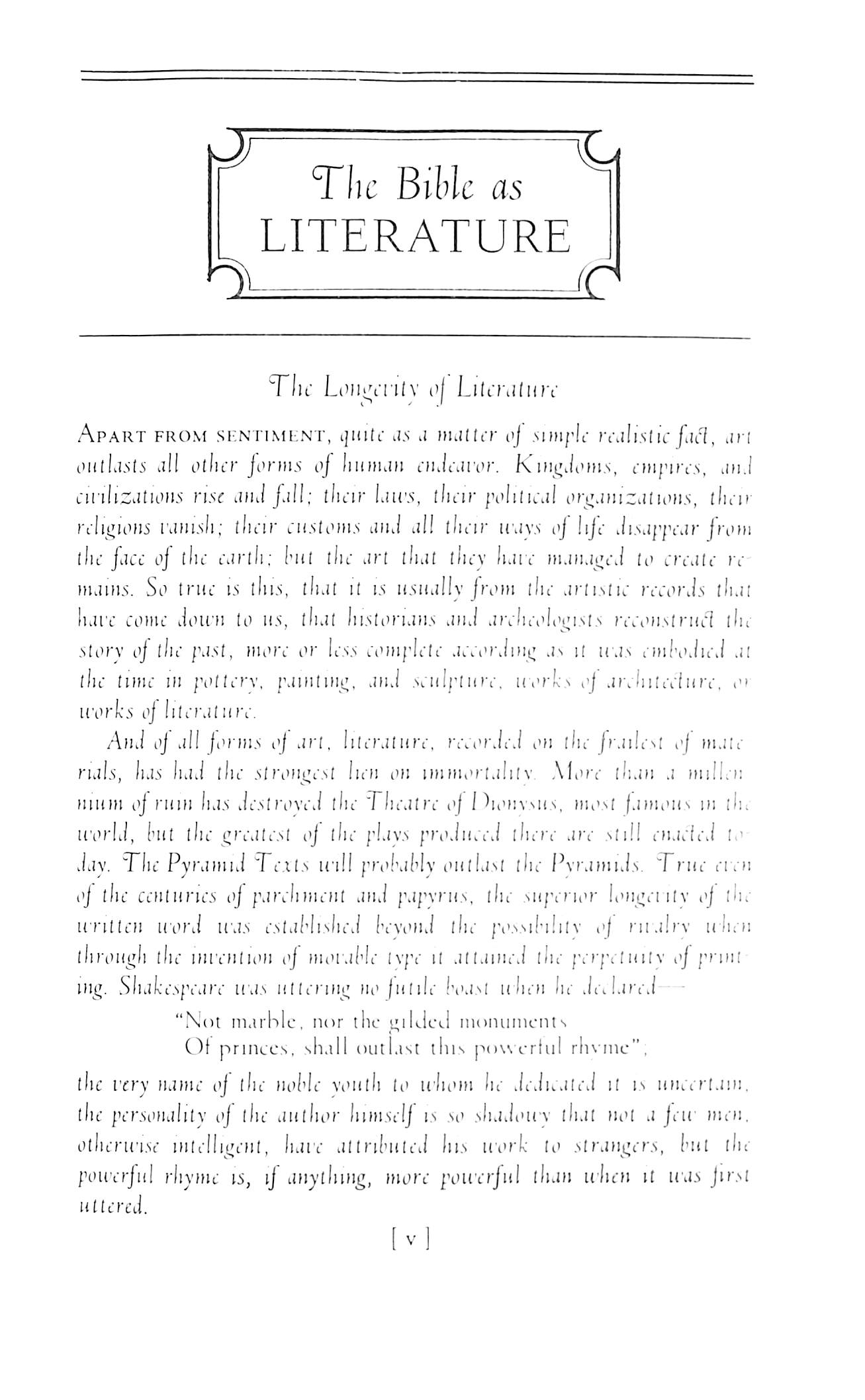 Designed to be read as living literature The Old and The New Testaments in The King James Version