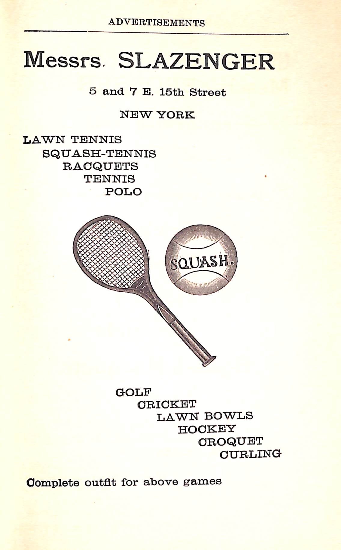 The Game of Squash, by Eustace Miles, M.A. New York, J.F Taylor & Co. 1st US edition. small 8vo (16x11 cm). XX, 131pp, plus advertisements (sports equipment). With the very unusual, suede leather cover, with title in relief. Photographic plates and text illustrations throughout. Eustace Hamilton Miles (1868-1948) was one of the greatest amateur racket sports champions of the early 20th century. During his peak, he held championship titles in all the various court games, most notably Racquets (1902) and Real Tennis (9 times between 1899 and 1910; winner of the silver medal at the Olympic Games of 1908). Although for squash at that early time there were no official championships in the UK, he would certainly have ranked amongst the top players of the era at that game too. But in squash, he will probably be best remembered as the author of the first ever book on the game. Published in 1901, it predates the next book in the squash bibliography by no less than 25 years. At the time this book came out, squash was still very much regarded as a mere pastime for schoolboys, for whom it was considered useful practice for the more serious sport of Racquets. There were no standard squash rules laid down yet, nor was there a standard size for courts. Very often it was still being played outdoors, under haphazard circumstances. Miles too, although providing plans for an enclosed indoor court in the book, suggests that even a simple outdoor court with only one wall can provide a good game; and that rain pipes, windows etc. could be used to add extra scoring opportunities. So, the book provides a unique insight into the game when squash was still in its formative stages. This is the rare US 1st edition, which was published in the same year as the UK edition. The author was living in the US at the time the book was published, so it’s unclear which book came out first. The covers of both books are very different: this US book has the remarkable suede leather cover, with the title in relief. In accordance with its early publication date, and the fact that relatively few people played the game at the time, the book is RARE indeed. It is seldom that a copy comes onto the market, and we know of several collectors who have been trying to acquire a copy, some for more than 20 years. It is THE most sought-after book in the squash bibliography. A great chance to acquire this rare piece of squash history!
