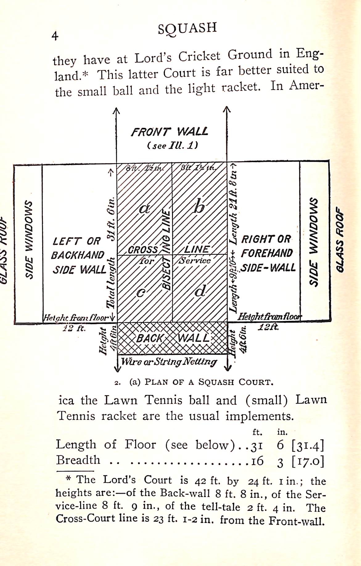 Racquets is usually played on a roofed court 80 feet long and 40 feet wide with walls 40 feet high. The players stand facing one of the narrow walls known as the front wall and hit the ball with a gut‐strung bat or racket at each other by rebound off the front, as in squash or handball.