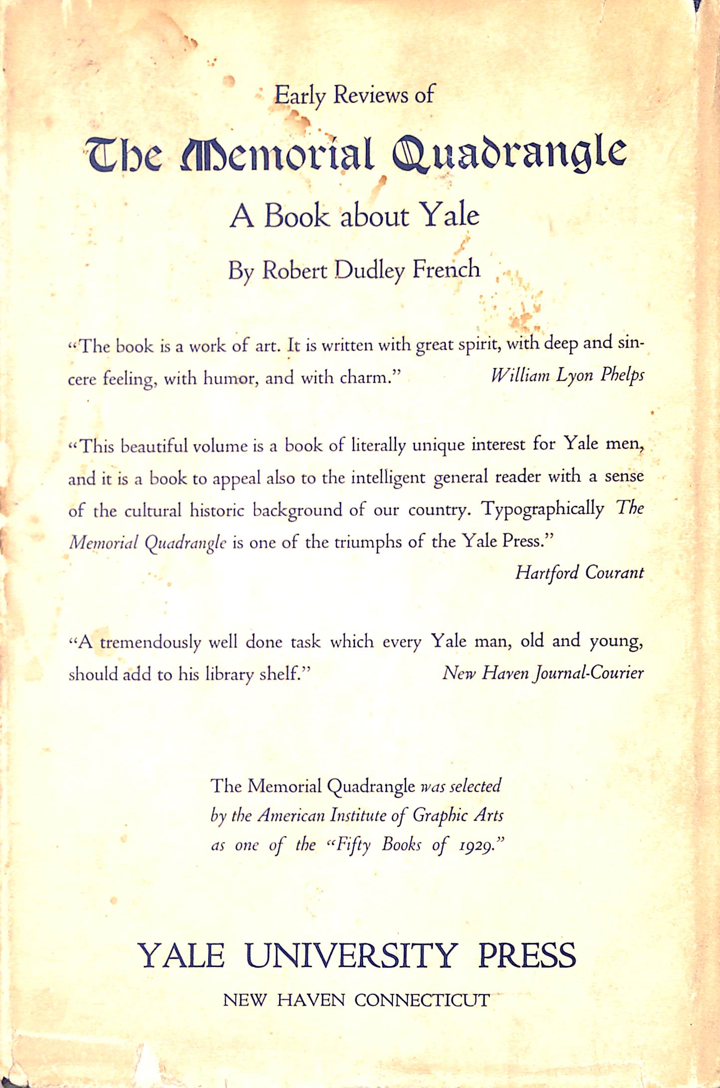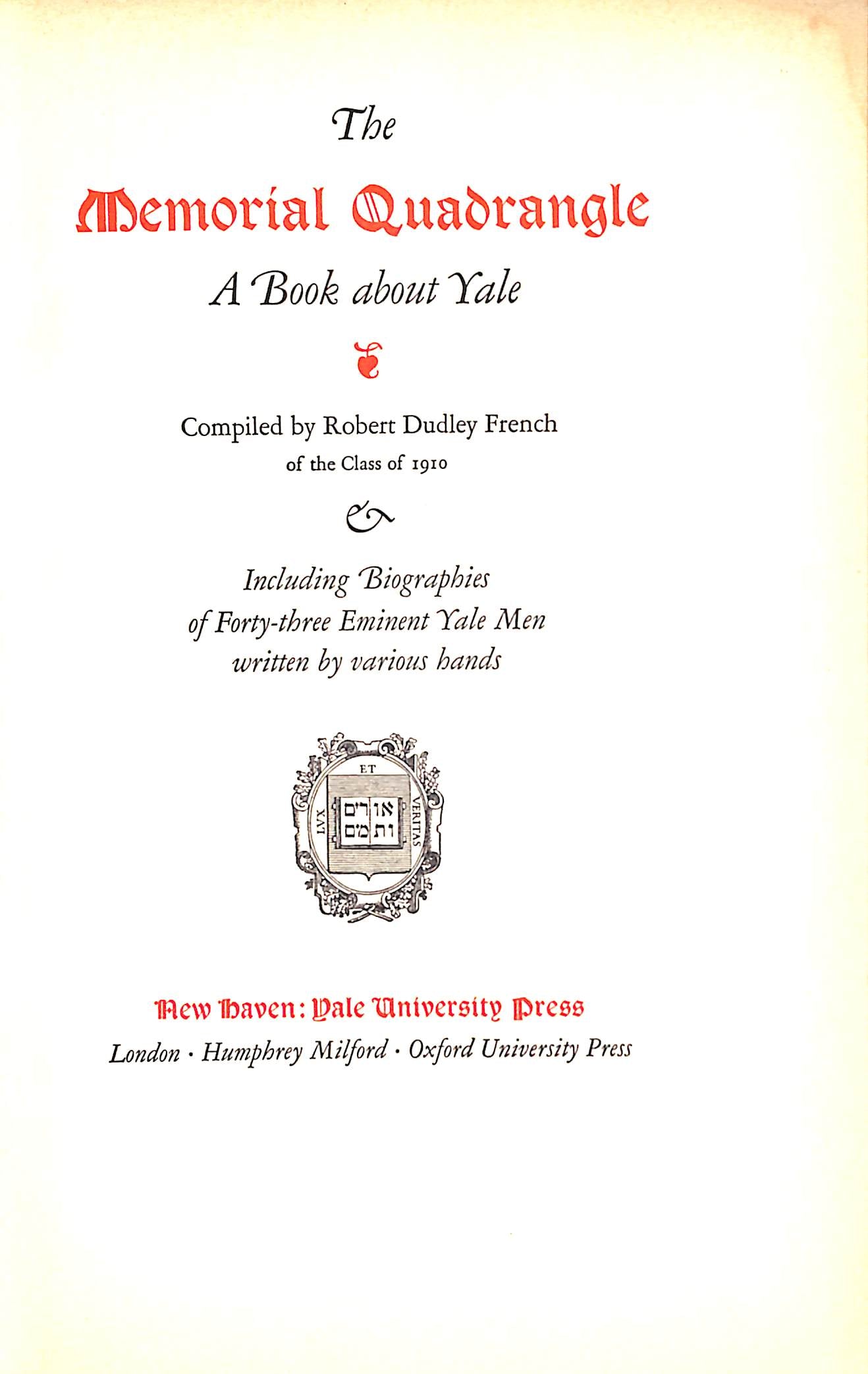 The Memorial Quadrangle: A Book About Yale, compiled by Robert Dudley French and published by Yale University Press in 1930, is a historical book celebrating Yale University's iconic quadrangle, detailing its architecture, history, and significance, compiled by French, a Yale professor and Master of Jonathan Edwards College, offering insights into Yale life through this central campus landmark.