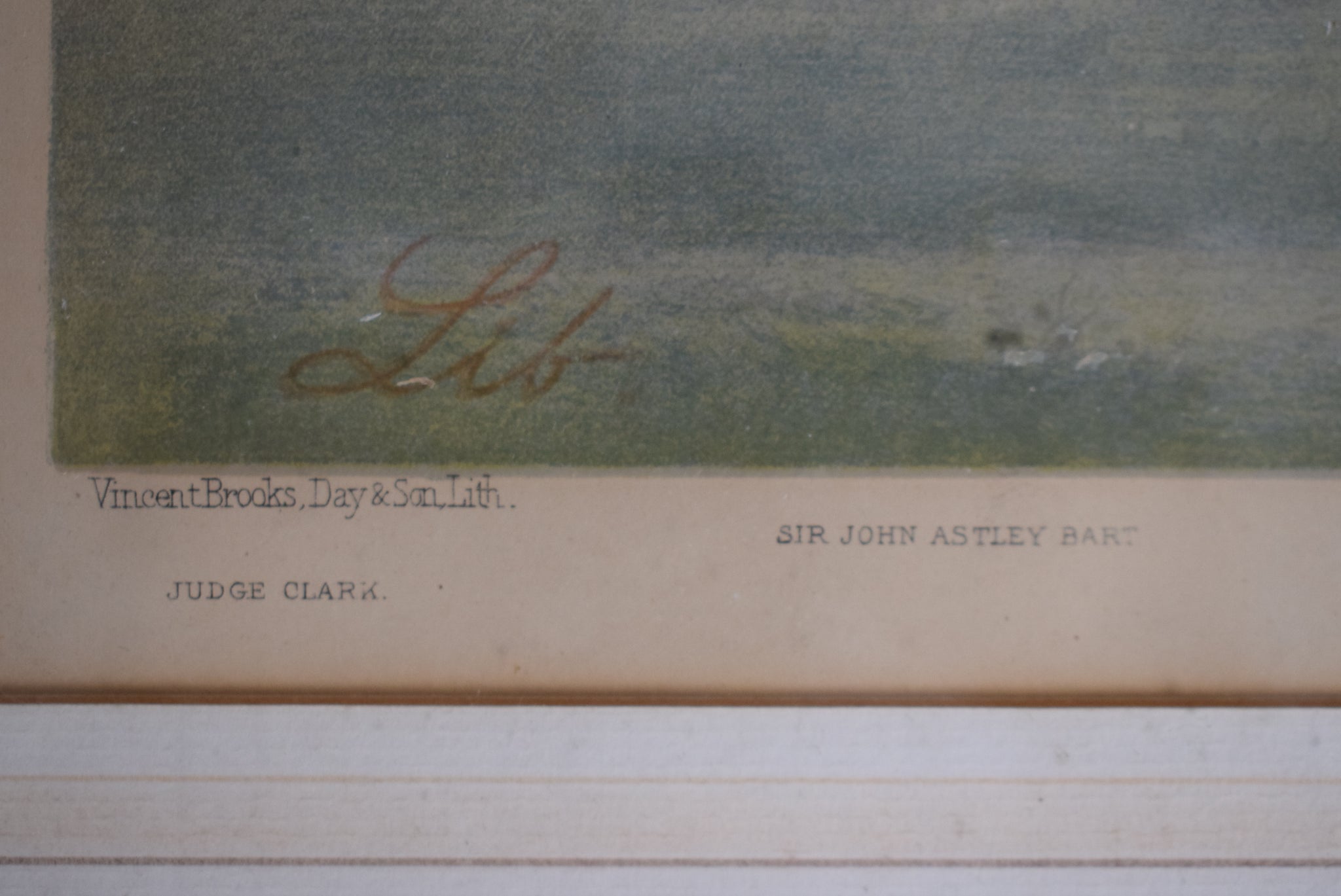 This Vanity Fair caricature probably depicts the climax of an imaginary race at Newmarket. Sir John 'The Mate' Astley, Bart. (1828-1894) was a Steward of The Jockey Club who, having been educated at Eton and sent-down from Oxford, had an illustrious military career before devoting his time to horseracing. He was responsible for the development of the new stand at the end of the Rowley Mile at Newmarket. 'Judge' John Francis Clark (1816-1898) was an invigilator at race-meetings and also an architect responsible for various sporting stands. The jockeys listed represent a group of the leading jockeys of the day. Many of the subjects appear in other Vanity Fair illustrations.
