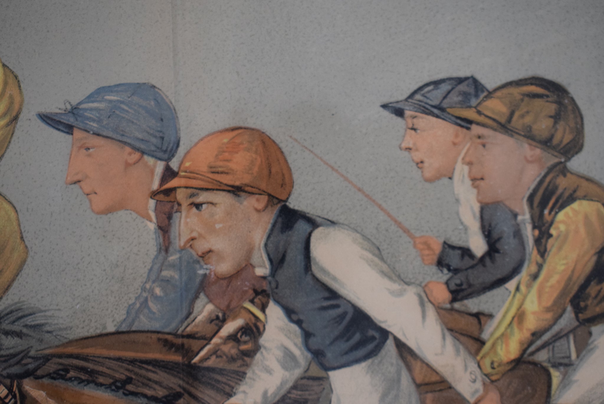 Caricature of a group of jockeys and on horseback: John Osborne, Tom Cannon, John Watts, Fred Webb, Fred Barrett, George Barrett, William "Jack" Robinson and Fred Rickaby. Together with Judge Clark and Sir John Astley, Bart.