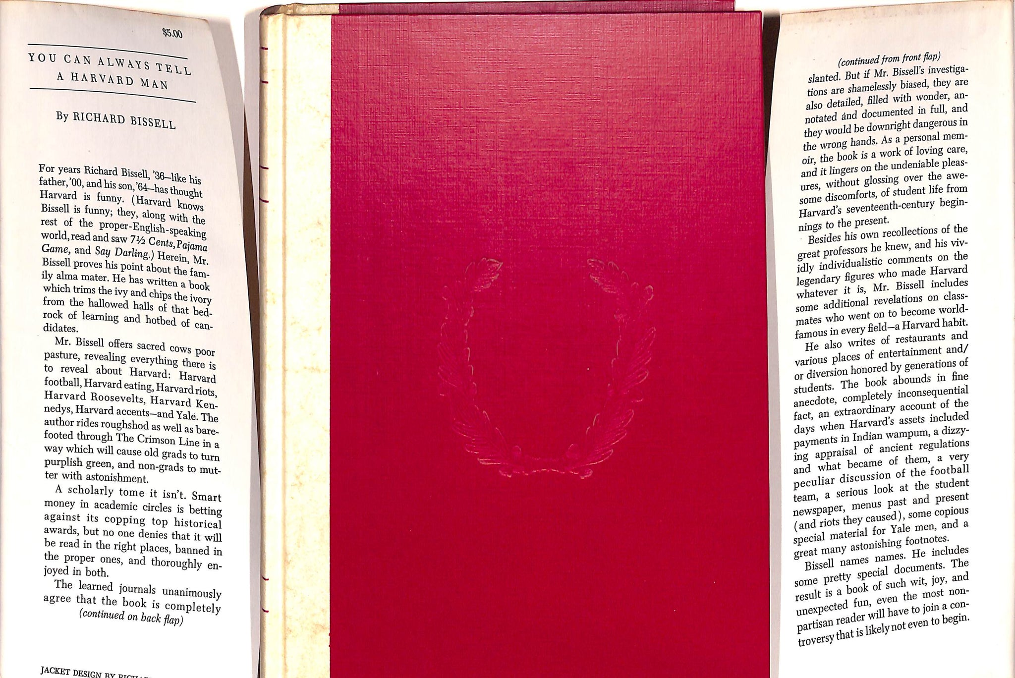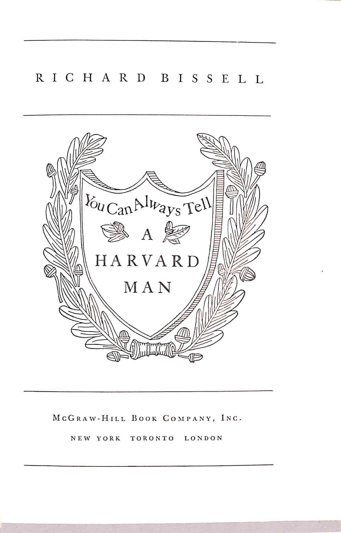 You Can Always Tell a Harvard Man is a humorous 1962 memoir by Richard Pike Bissell, an alumnus of Harvard University (Class of '36) who recounts his funny and insightful experiences at the Ivy League institution, filled with anecdotes and observations about its history and culture. The book is a collection of witty recollections and historical tidbits about Harvard, written by the author of A Stretch on the River.