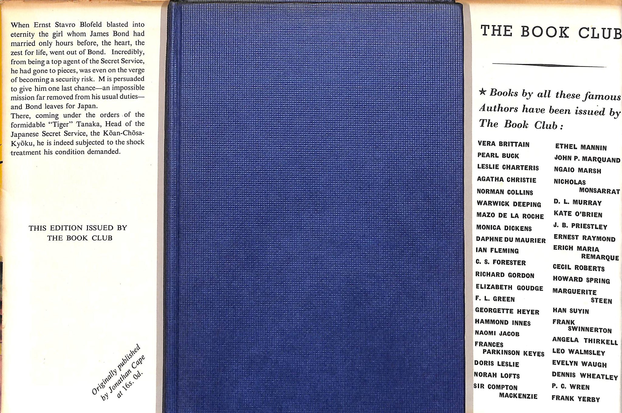 The first Book Club edition of this novel, published in the same year as the true first Jonathan Cape edition. An immense success, this novel sold out quickly after its publication. In Ian Fleming's popular James Bond series, the last to be published within the author's lifetime. Continuing from the murder of Tracy Bond at the end of On Her Majesty's Secret Service, the story is set in Japan and deals with Bond's personal struggles, as well as examining the decline of British power and influence following the Second World War.