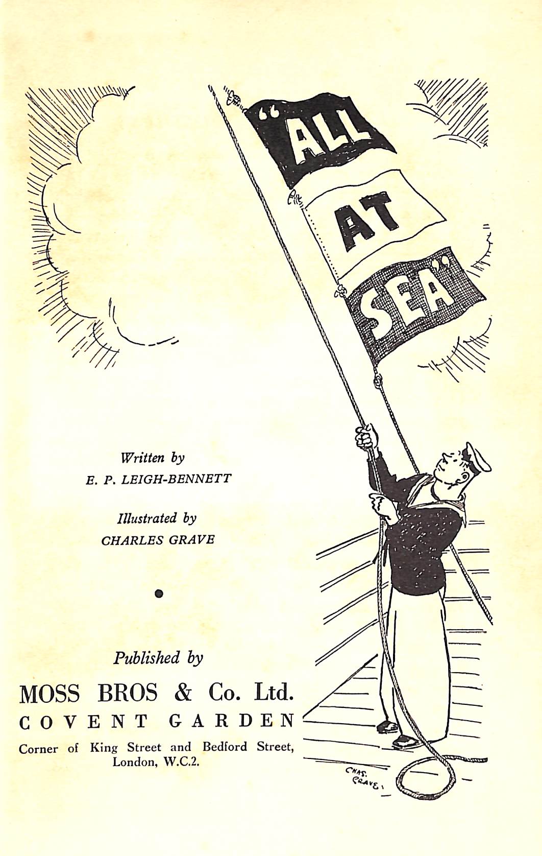 "All At Sea" by E.P. Leigh-Bennett refers to a classic maritime book, likely a collection of sea stories or sketches, published by Moss Bros & Co. Ltd. in London around 1938 (a reprint of an earlier edition), featuring illustrations by Charles Grave, offering nostalgic insights into life at sea from the early 20th century.