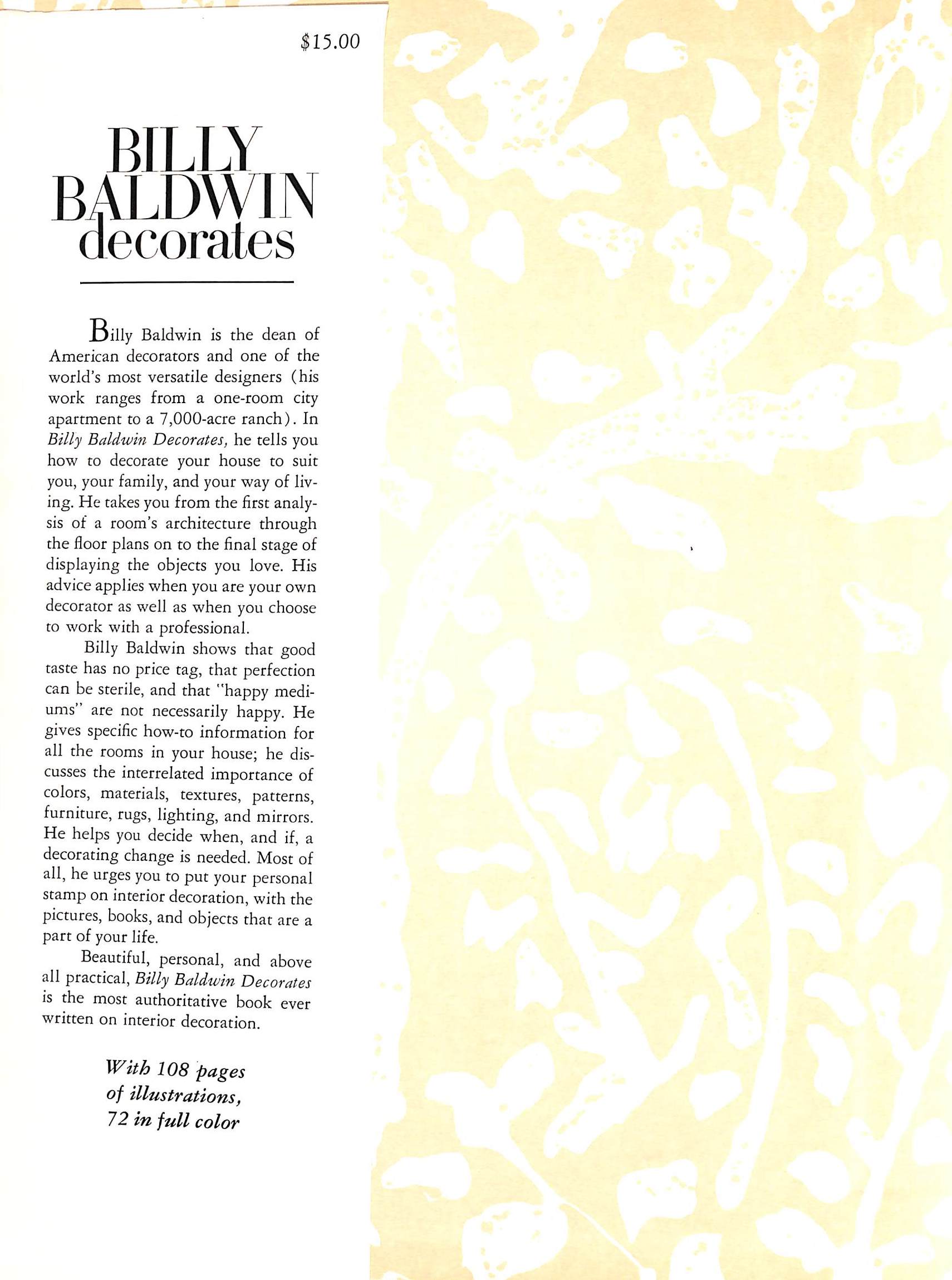 "Billy Baldwin is the dean of American decorators and one of the world's most versatile designers. Here, he tells you how to decorate your house to suit you, your family, and your way of living. He takes you from the first analysis of a room's architecture through the floor plans on to the final stage of displaying the objects you love. The most authoritative book ever written on interior decoration, with 108 pages of illustrations, 72 in full color." - dust jacket. Chapters include: Taste and Logic in Decorating; Rooms to Live in; How to Work with a Decorator; The Bones of a Beautiful Room; Decorating for How and Where You Live; Your Own Personal Stamp; The Big Question of Change.