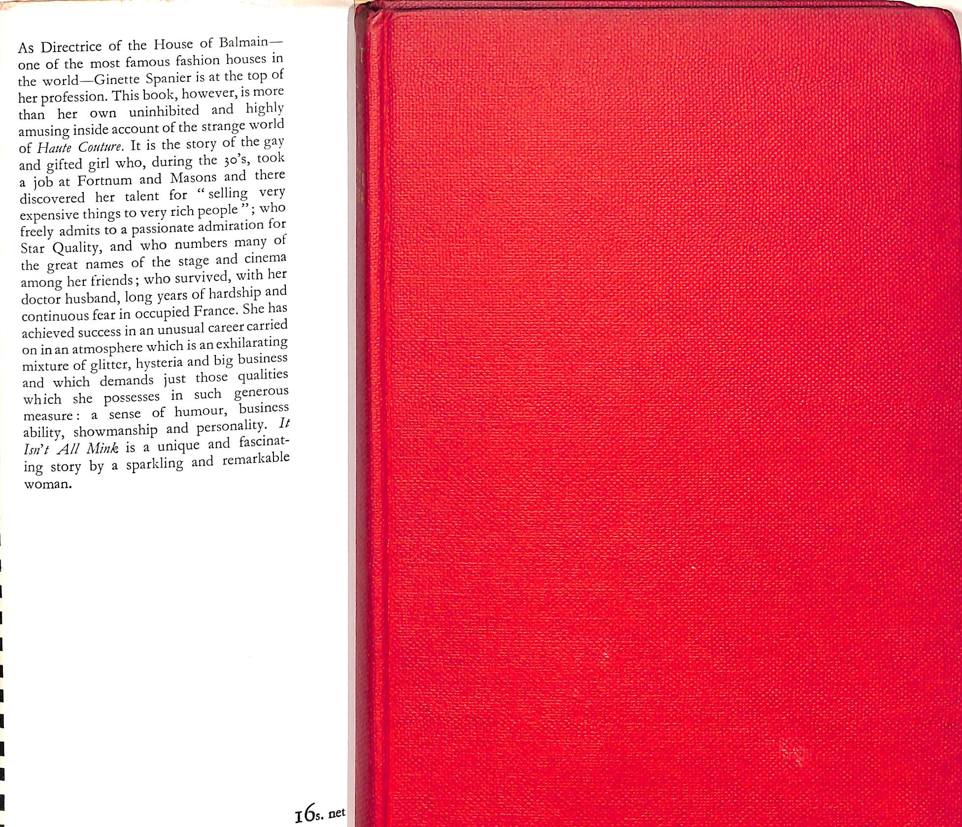 It Isn't All Mink is the 1959 autobiography of Ginette Spanier, the director of the House of Balmain, detailing her glamorous and adventurous life, from her experiences in occupied France during WWII to her rise in the high-fashion world, befriending stars like Laurence Olivier and Marlene Dietrich, and offering a behind-the-scenes look at 1950s haute couture. The book, subtitled The Sparkling Autobiography of a Woman of Style, is known for its witty and uninhibited account of her life and career, and was published with an introduction by Noël Coward.