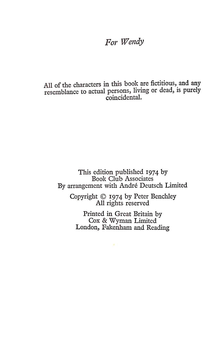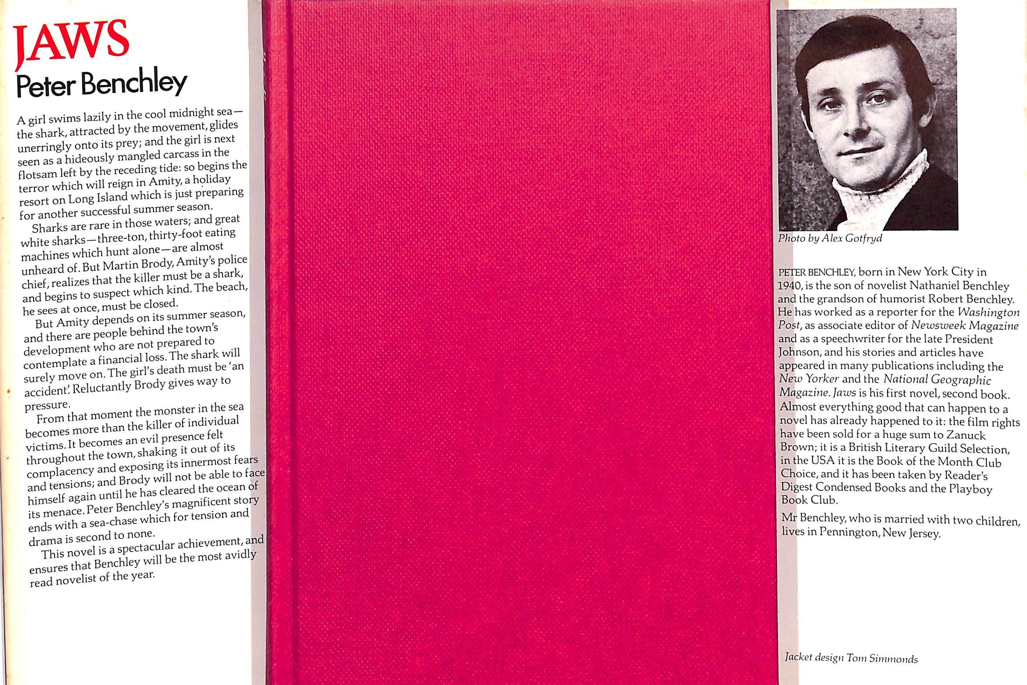 Jaws is a novel by American writer Peter Benchley, published by Doubleday in 1974. It tells the story of a large great white shark that preys upon a small Long Island resort town and the three men who attempt to kill it. The novel grew out of Benchley's interest in shark attacks after he read about the exploits of Frank Mundus, a shark fisherman from Montauk, New York, in 1964. Doubleday commissioned Benchley to write the novel in 1971, a period when the writer worked as a freelance journalist.