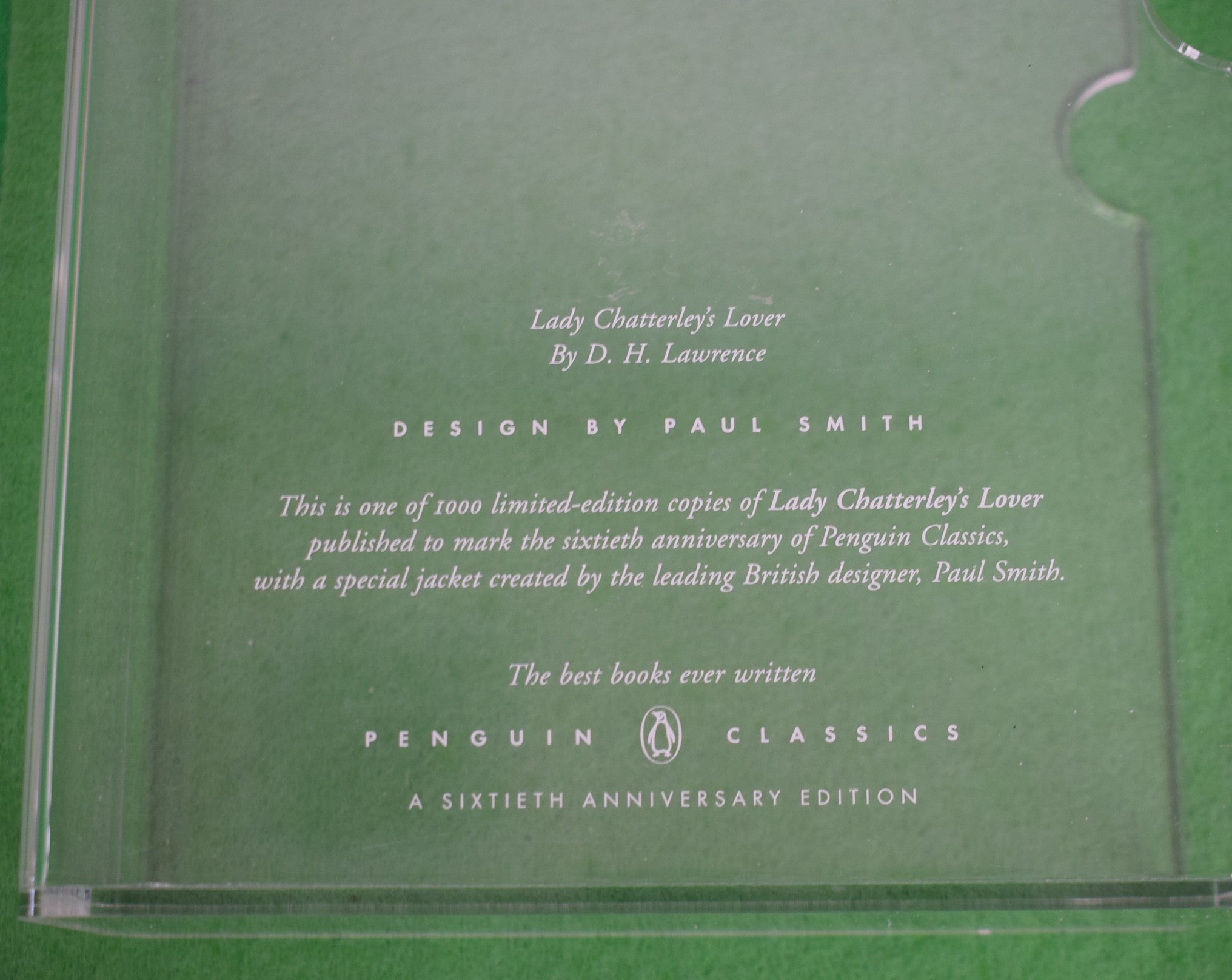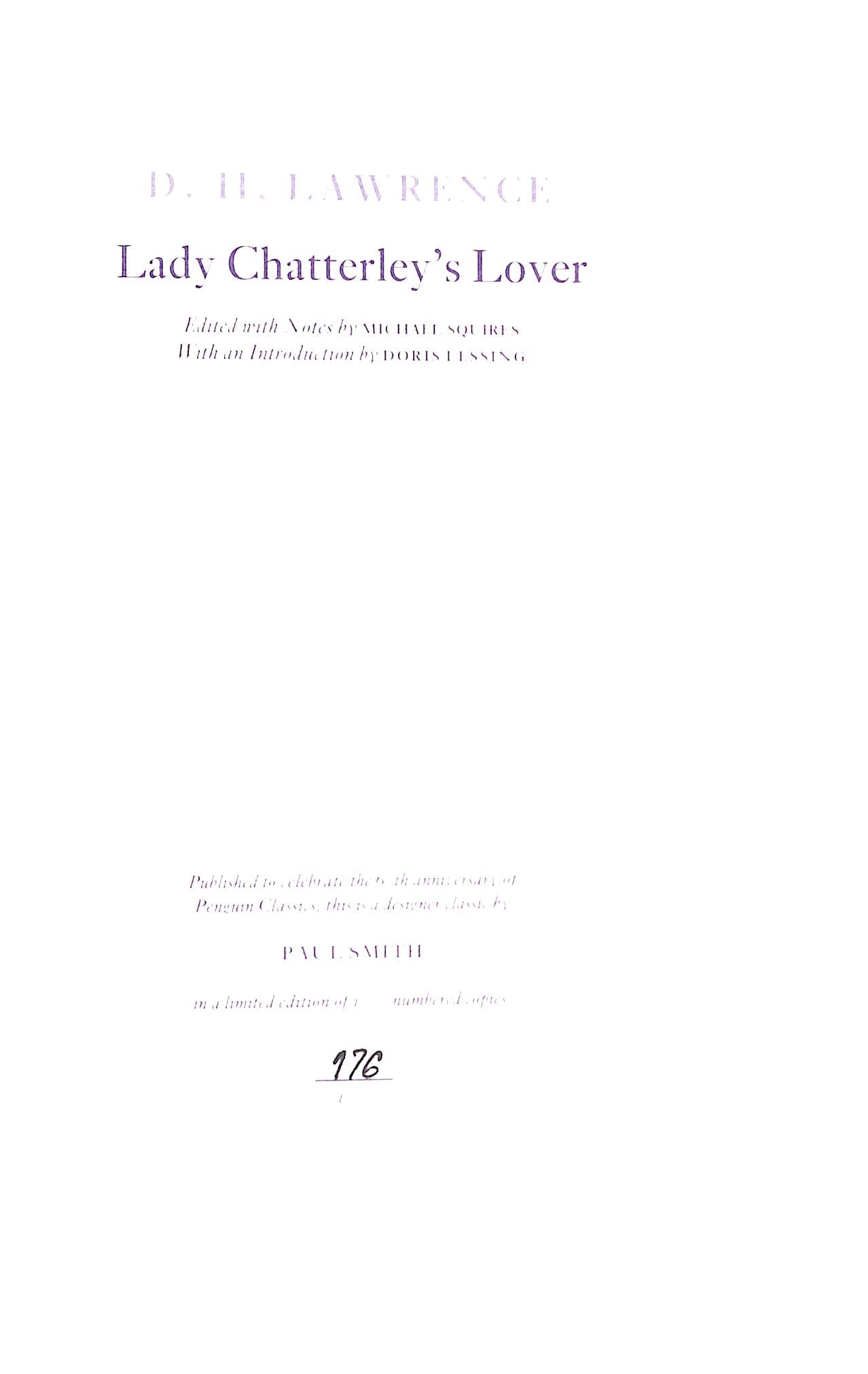 London: Penguin, 2006, 2006. Large octavo. Original purple boards, titles to spine in white, floral patterned endpapers, multi-coloured silk page marker. With the white silk dust jacket embroidered with titles in black and flowers in blue and yellow. Housed in the original printed perspex slipcase. In the original cardboard packaging. A fine copy. Limited edition, number 176 of 1,000 copies. To celebrate the sixtieth anniversary of the Penguin Classics the firm commissioned five prominent artists to design bindings for limited runs of influential books previously published in the series. The embroidered Paul Smith design for Lady Chatterley's Lover is one of the most popular of the series. Lady Chatterley's Lover was first published in the UK, by Penguin, in 1960 after a well-publicised legal battle in November of that year. Penguin's successful defence of the work is acknowledged as a milestone for the liberalisation of British publishing, and a gateway to the permissive social attitudes of the 1960s.