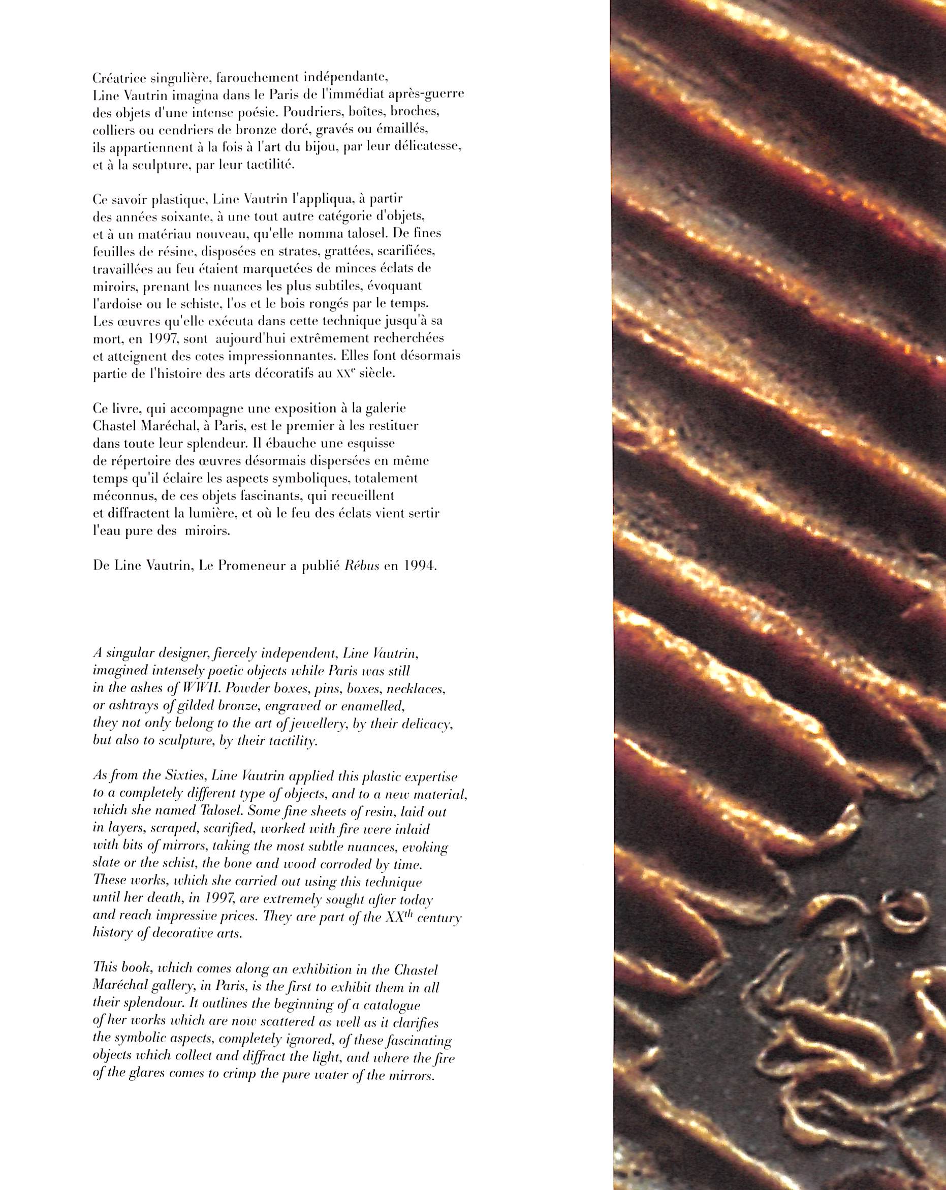 A book on the sculptural and poetic mirrors created by the French designer Line Vautrin. Vautrin's mirrors were formed using a material she created called Talosel, a plastic based on cellulose acetate. The Talosel base was shaped, scraped and encrusted with multi-coloured pieces of mirror. Her works are instantly recognisable and are widely collected. Line Vautrin Miroirs was published to coincide with an exhibition at the Galerie Chastel Marechal and acts as a foundation catalogue of Vautrin's mirrors.