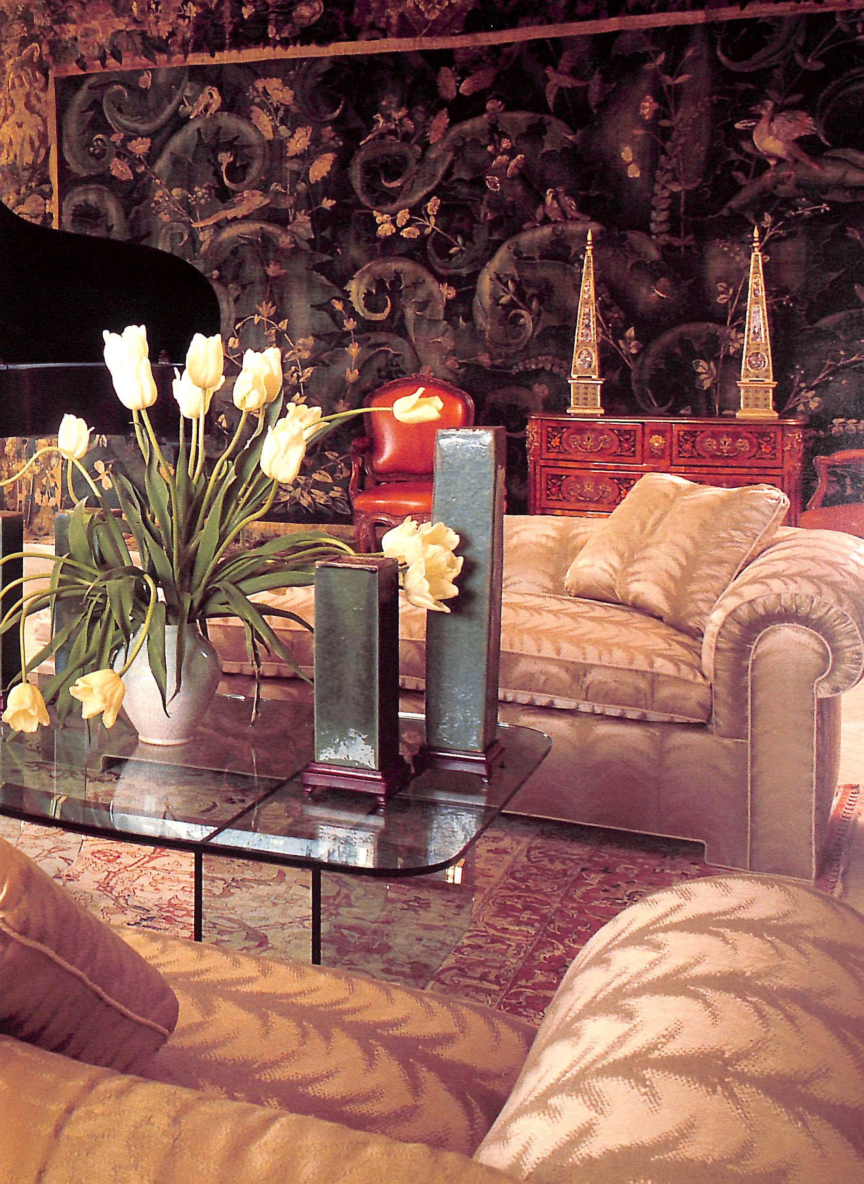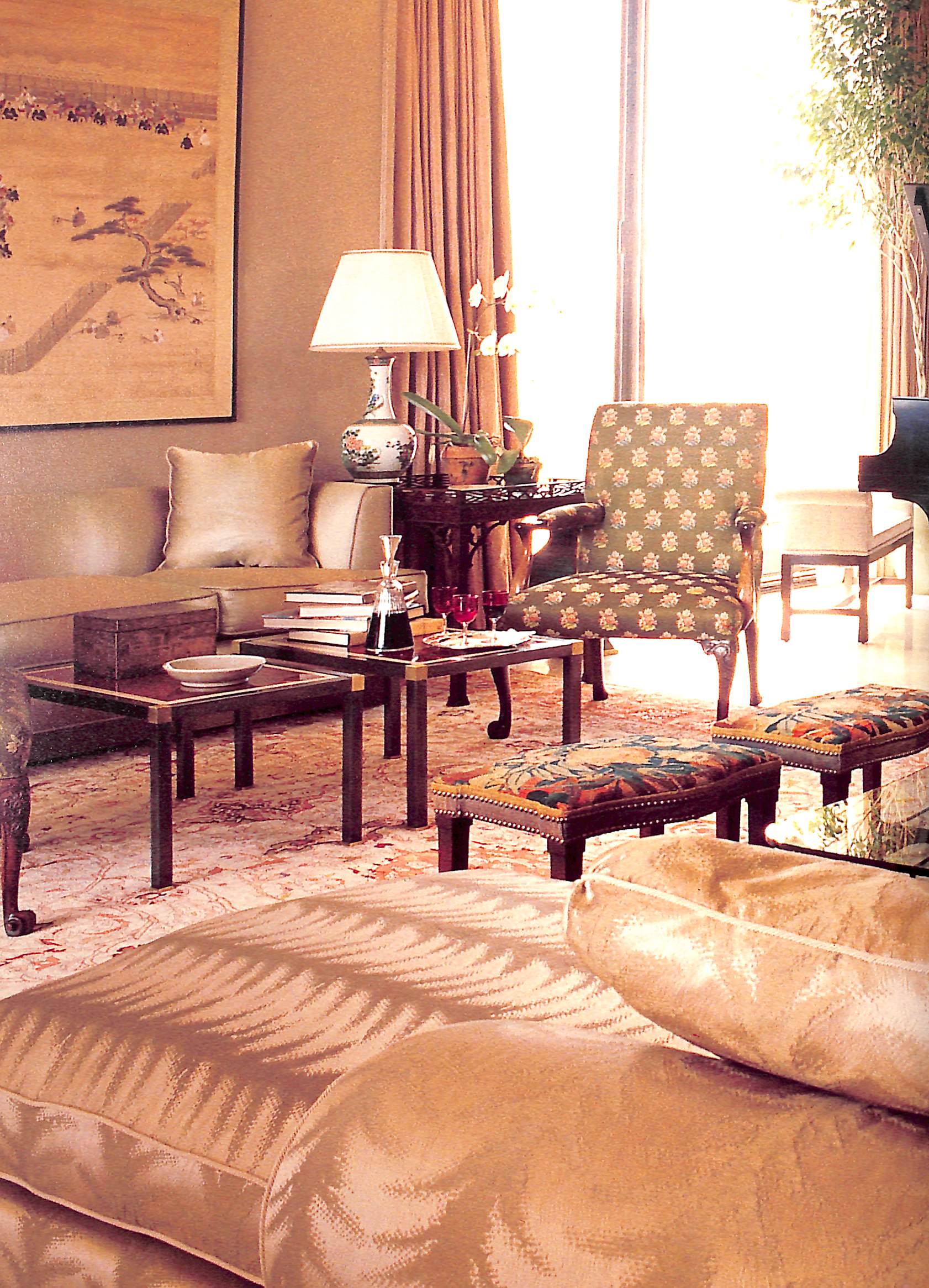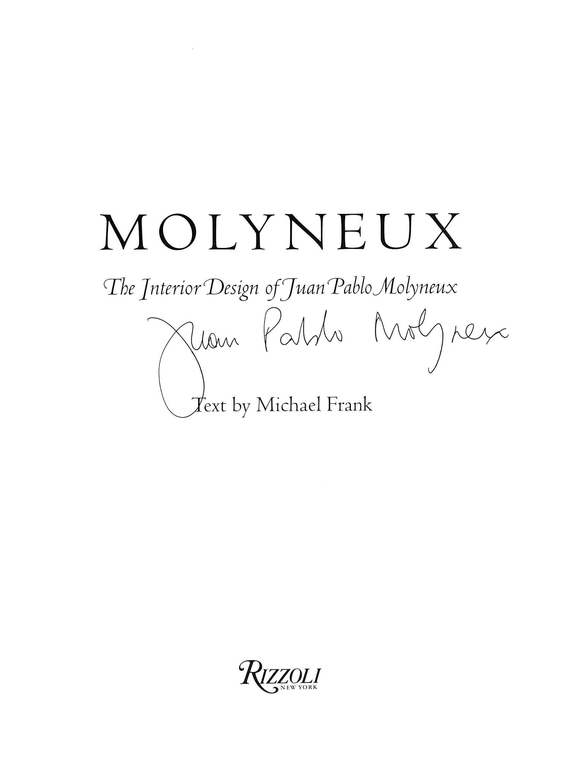 Showcases some of the work of Chilean-born designer Juan Pablo Molyneux (b. 1946). "This volume, the first devoted to the New York-based designer's work, presents more than a dozen of his most recent projects, from a Beaux-Arts mansion in the heart of Buenos Aires to a Park Avenue penthouse. Superb color photographs illustrated these varied homes, providing a personally guided tour replete with insights into Molyneux's structural strategies and furniture selections. Highlighted are features of ornamentation, geometric floor patterns, and trompe l'oeil, the latter regarded by Molyneux as 'a fantasy that provokes reality.'" (dj) Contents as follows: A Park Avenue penthouse -- Molyneux meets Mizner: Palm Beach -- A pied-à-terre on Manhattan's upper West side -- The invention of an interior: Buenos Aires -- Remaking a town house on Manhattan's upper East side -- Molyneux at home -- Transforming an apartment on Park Avenue -- A bicultural journey in Laguna Beach -- Vail revisited -- Trump Tower aerie -- A Fifth Avenue flat -- Molyneux at Kips Bay and at large.