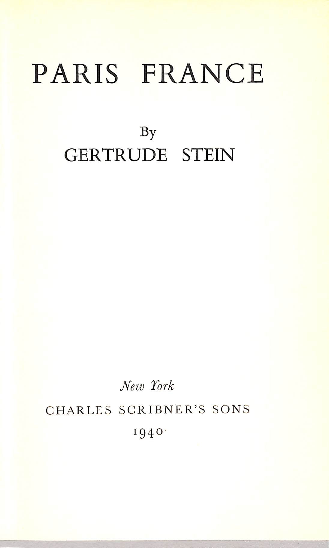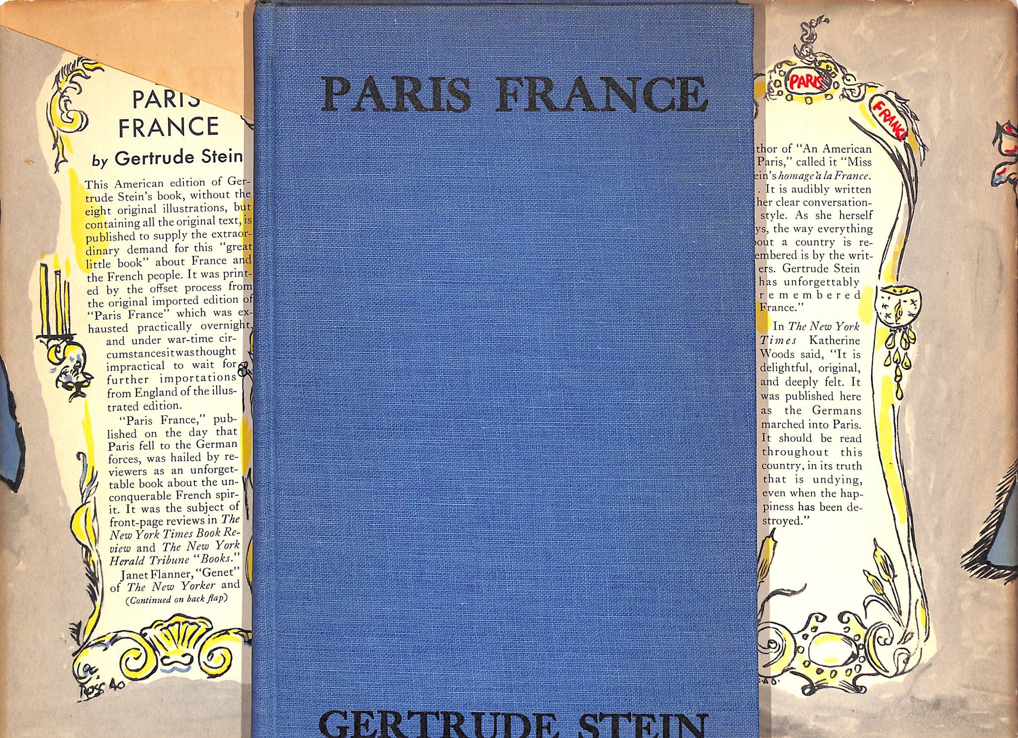 Paris France is a memoir written by Gertrude Stein and published in 1940 on the day that Paris fell to Germany during World War II. The book blends Stein's childhood memories with a commentary on French people and culture.