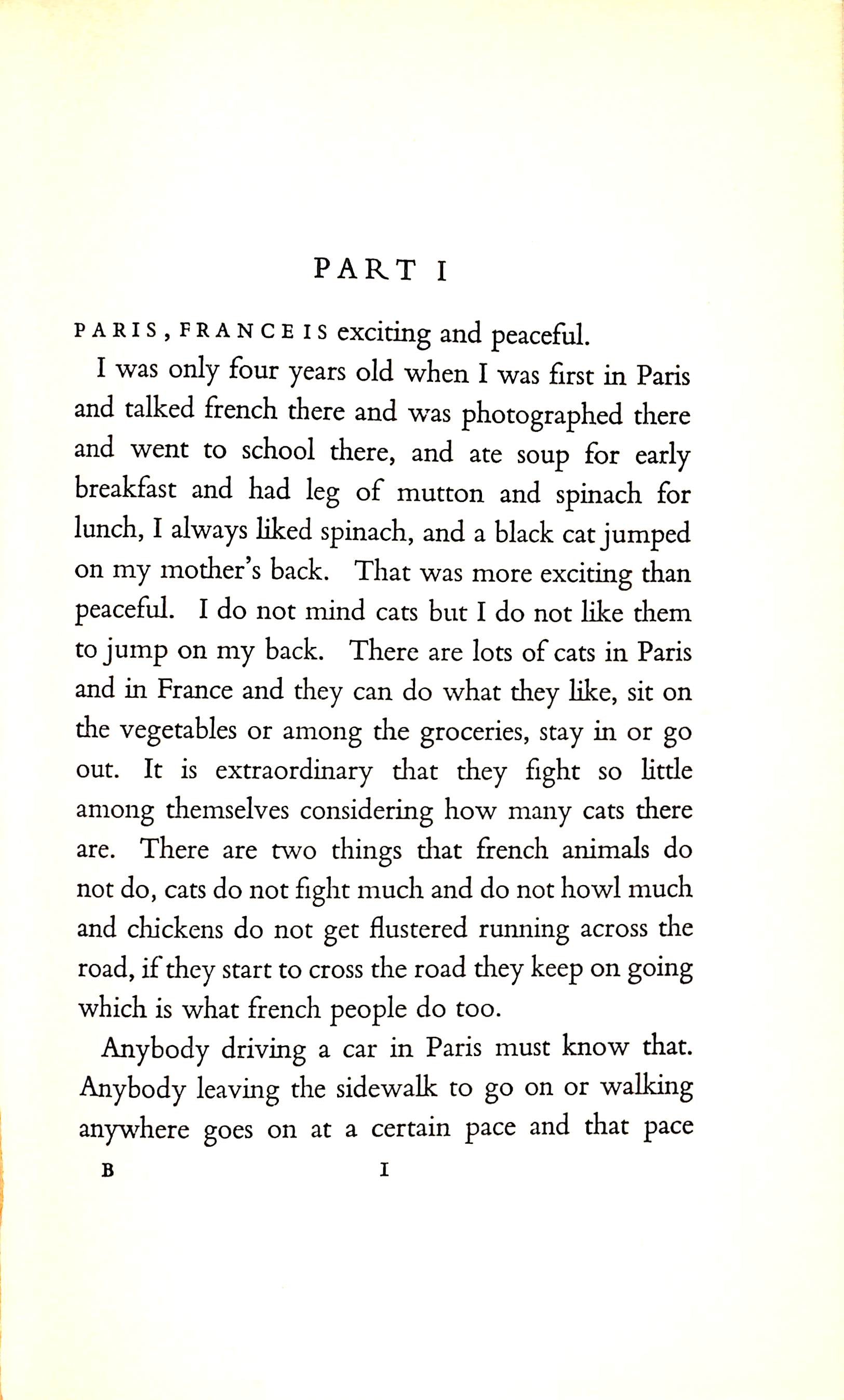 Paris France is a memoir written in a “stream of consciousness” style. It is interpreted as Gertrude Stein’s personal view of France as a country, and the French people. She observes the French eating, drinking, crossing the street, and carrying out their day in no other way that deviates from their "Frenchness." The word "French" quickly becomes a state of being or state of existence.