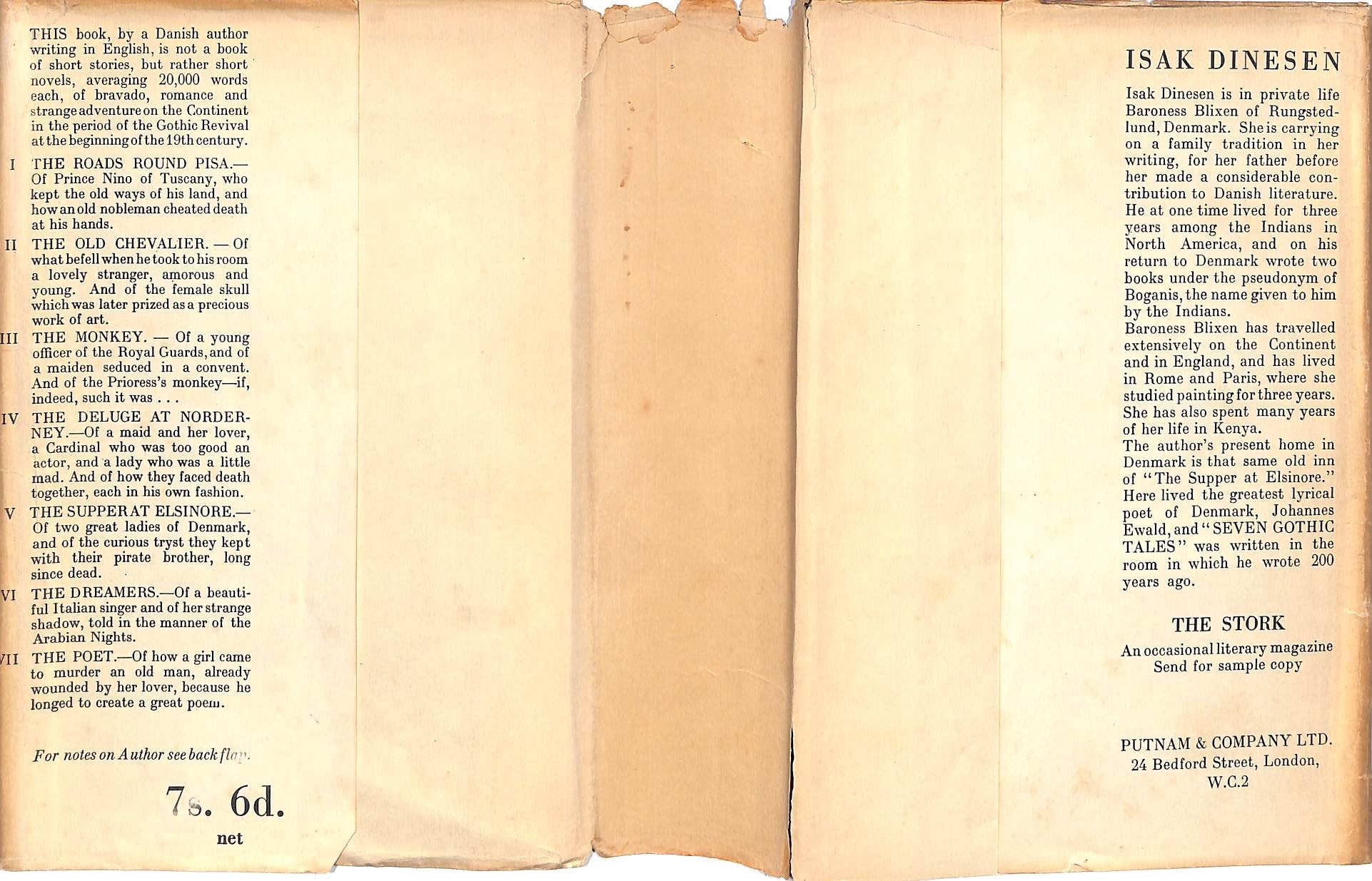 Blixen's first book, published first in the United States under the pseudonym Isak Dinesen. These intricate and imaginative tales, all set in the nineteenth century, won wide acclaim in America and soon appeared in this edition in Britain and then in Denmark (as Syv fantastiske fortællinger). "Since her pseudonym was quickly penetrated, she published under her own name in every country, except the United States, where 'Isak Dinesen' swiftly became a valuable brand. Among the main stylistic influences on Blixen's tales can be counted the English gothic novel, German Romanticism, Boccacio's Decameron, and The Arabian Nights. When asked why she set her tales over a hundred years in the past, Blixen responded that the past could be more easily recompounded in her imagination, and she would not be forced to resort to realism.