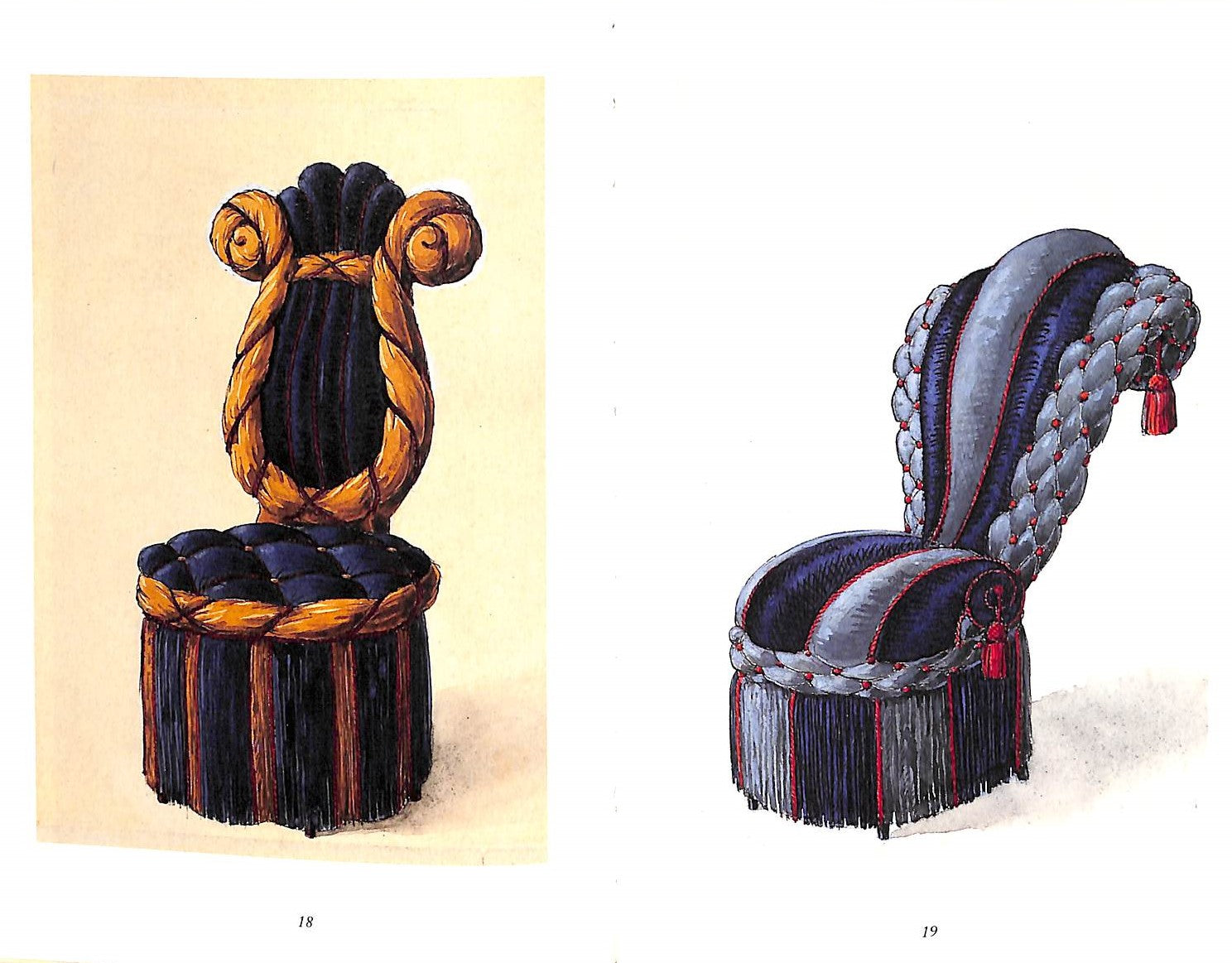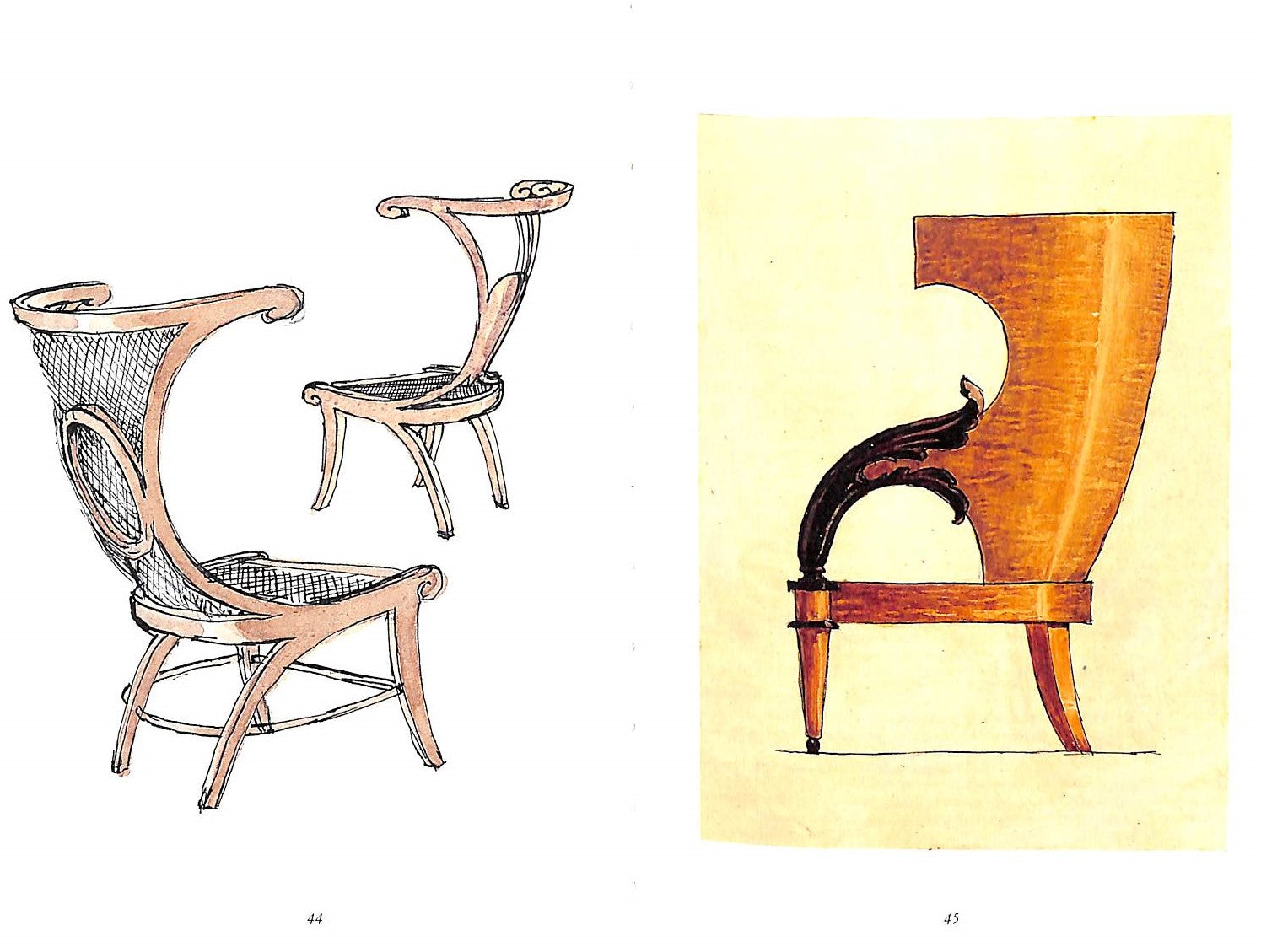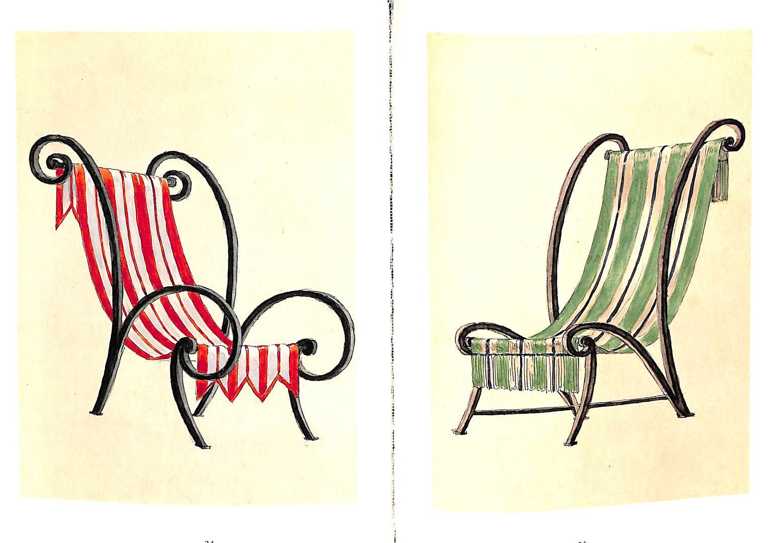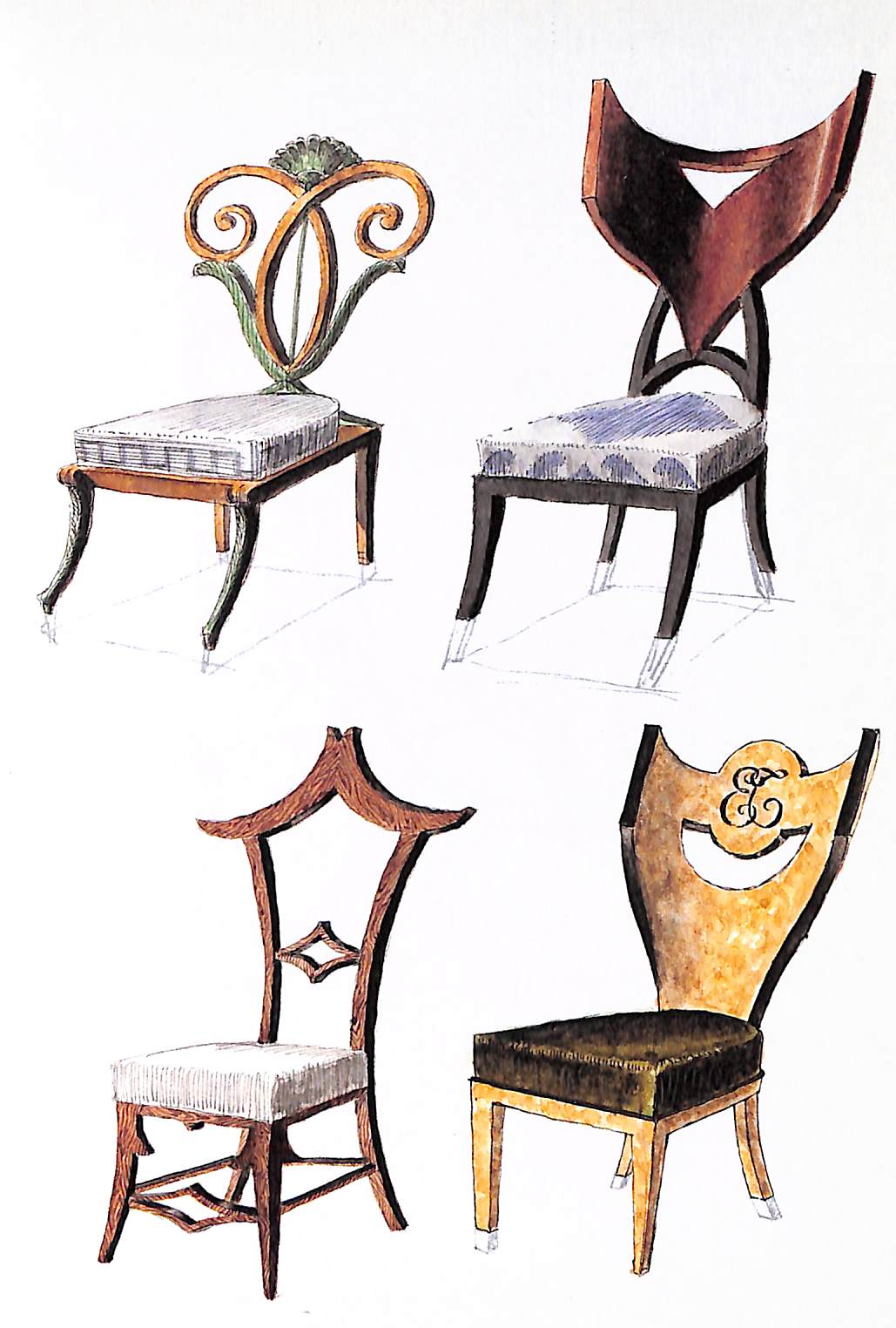 A small study of the chair designs of Emilio Terry. Terry's style is hard to classify, a mix of baroque and neo-classicism. His creative designs for chairs are a mix of unusual shapes and materials, and his original drawings are reproduced here.