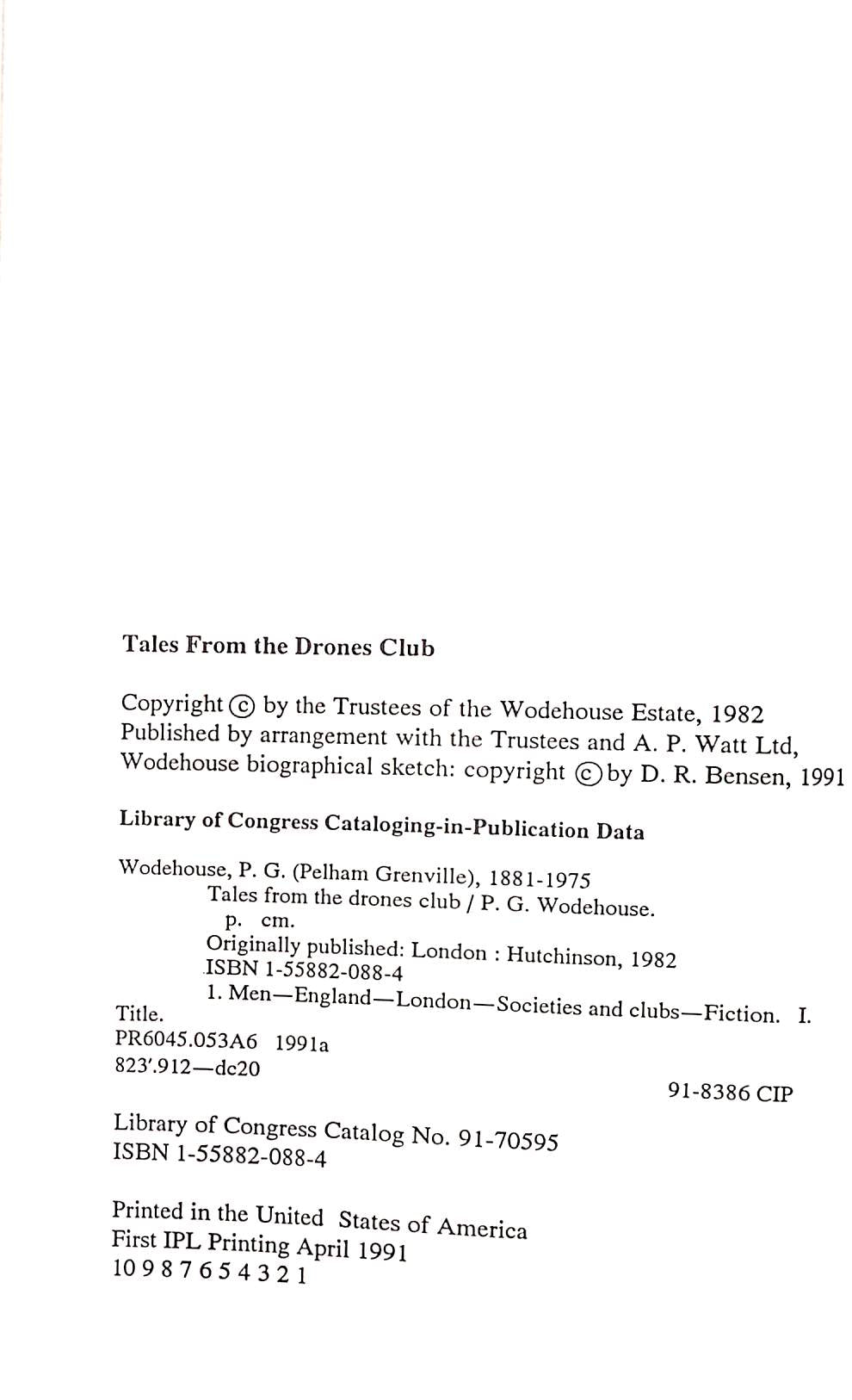 Tales from the Drones Club is a collection of humorous short stories by P.G. Wodehouse, focusing on the misadventures of the idle, wealthy members of London's Drones Club, known as "Eggs, Beans, and Crumpets". The book features stories about the club's members, who are typically young, well-to-do men, and their comical escapades, often involving romance, misunderstandings, and eccentric characters.