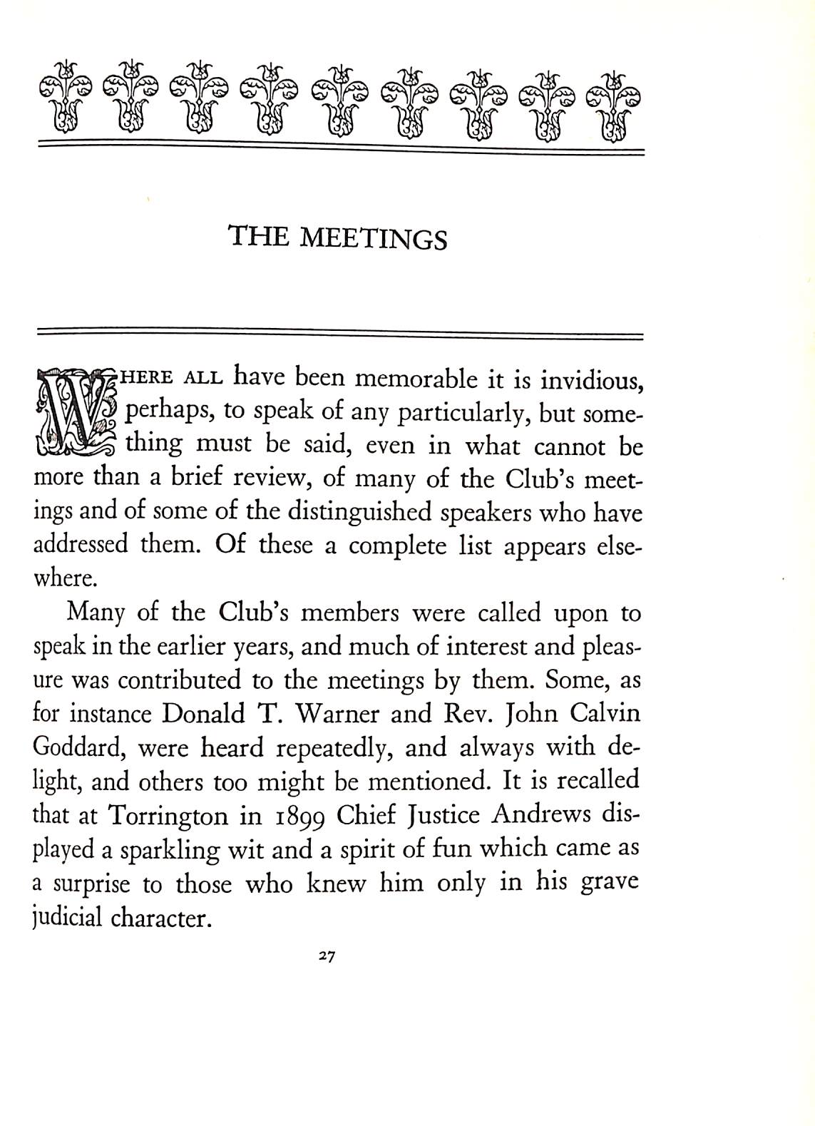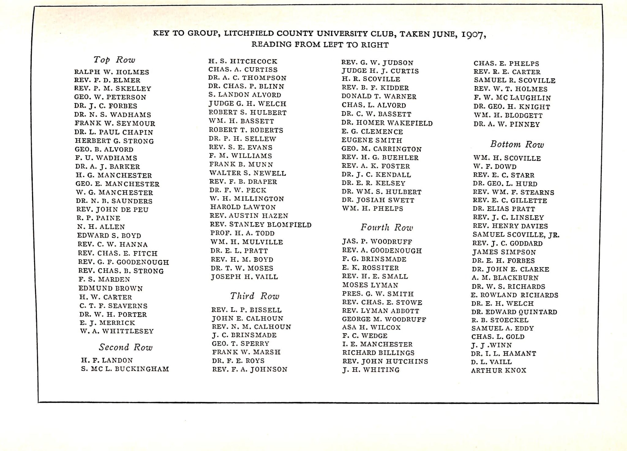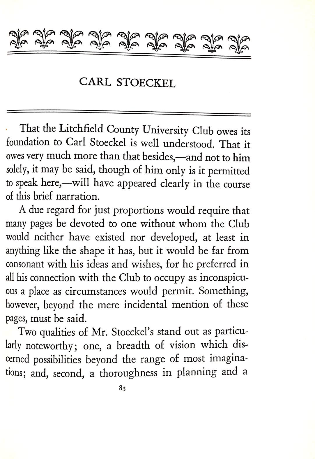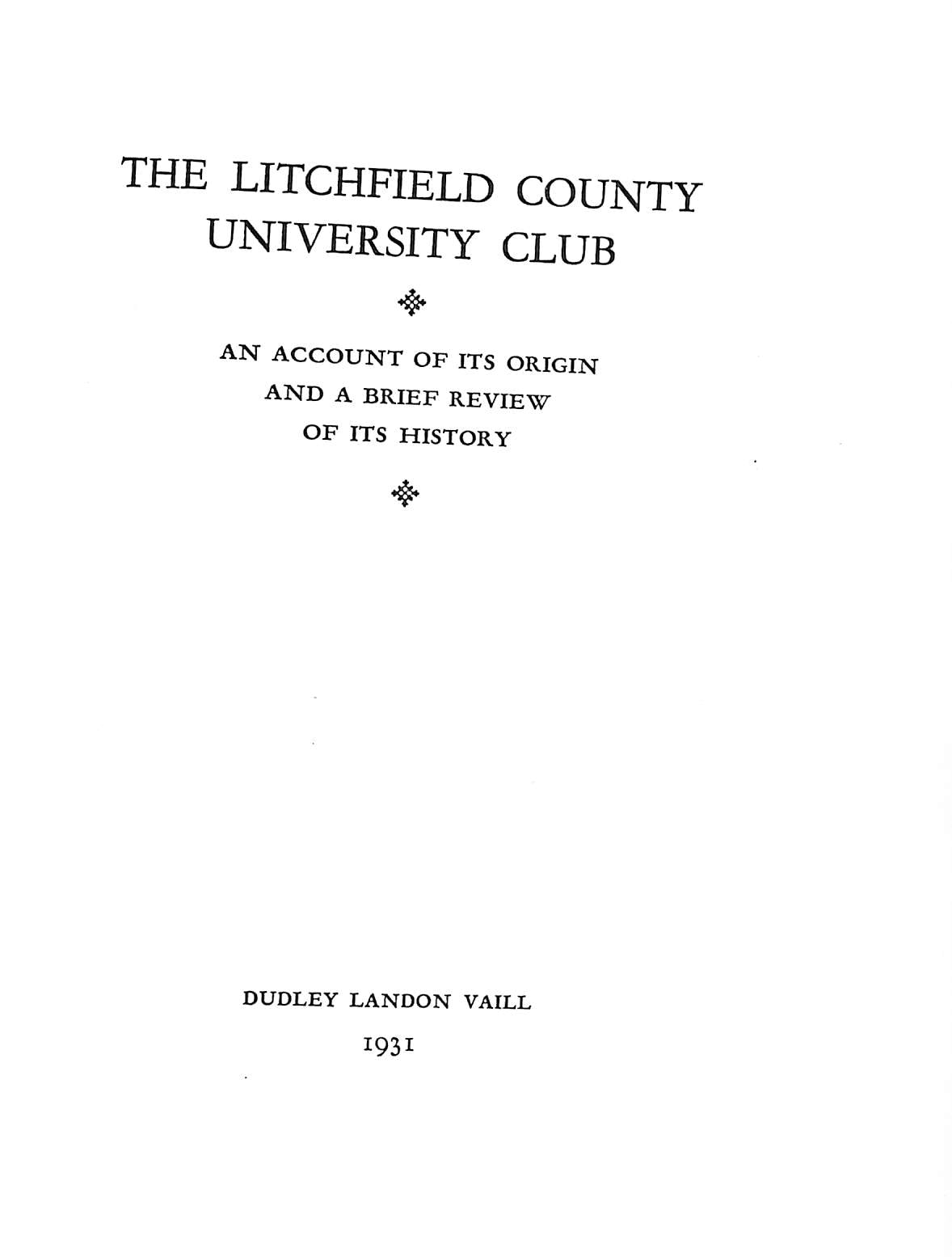 The Litchfield County University Club was conceived by Carl and Ellen Battell Stoeckel, wealthy patrons of the arts, and founded at a meeting on May 29, 1896 at Whitehouse, their home in Norfolk. It grew out of a concern that those who had enjoyed the advantages of a liberal education were so scattered and isolated in the northwest corner of Connecticut as to rarely come into contact with each other. The idea met with resounding success and the first Annual Meeting, 55 members present, was held at the Stoeckels' home in Norfolk called "Whitehouse" on June 16, 1897.