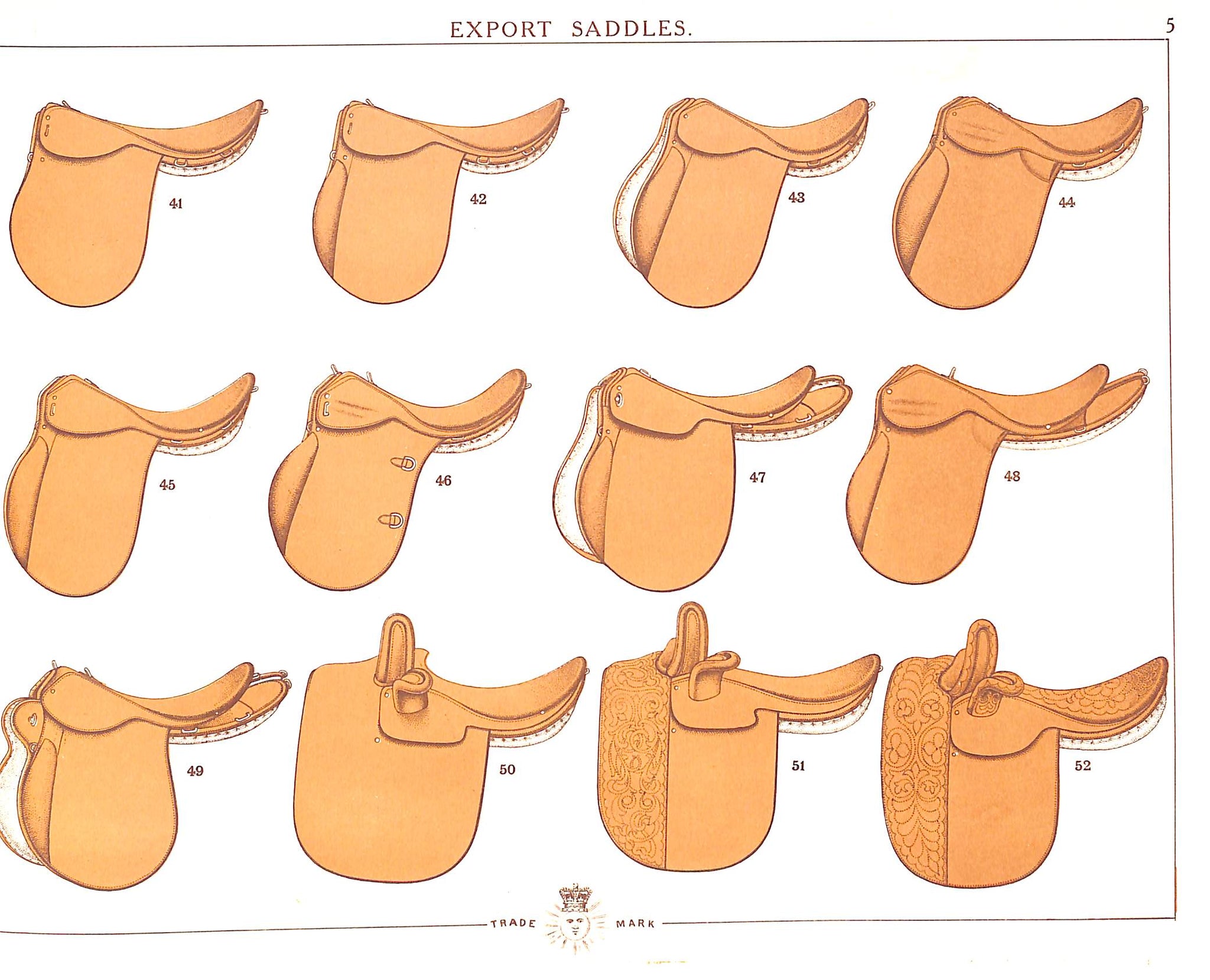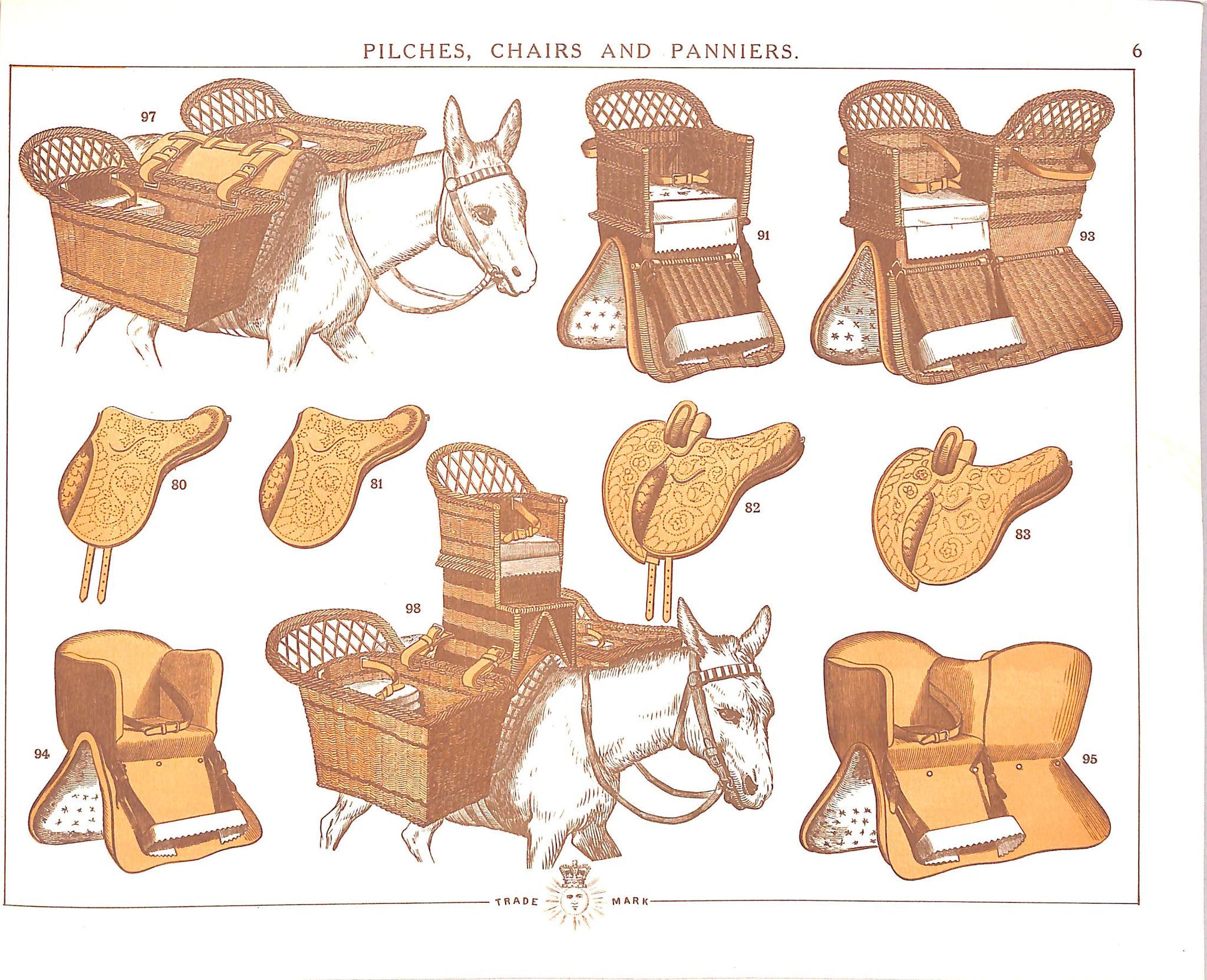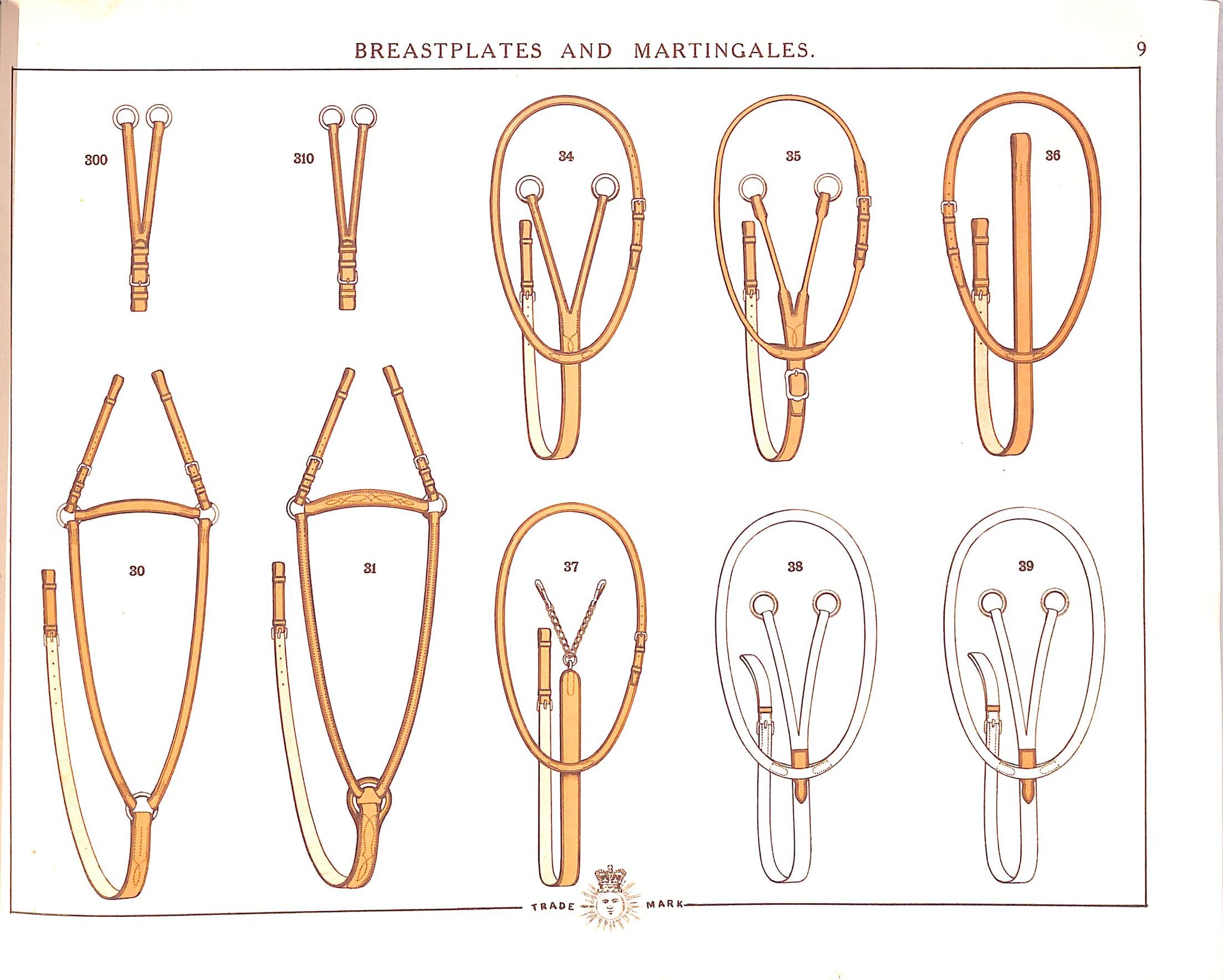 Plates include: saddles, sidesaddles, basket saddles, bridles, muzzles, boots, harness, bits, stirrups, spurs, whips, hunting flasks, horns, buckles, rosettes & stable clothing.