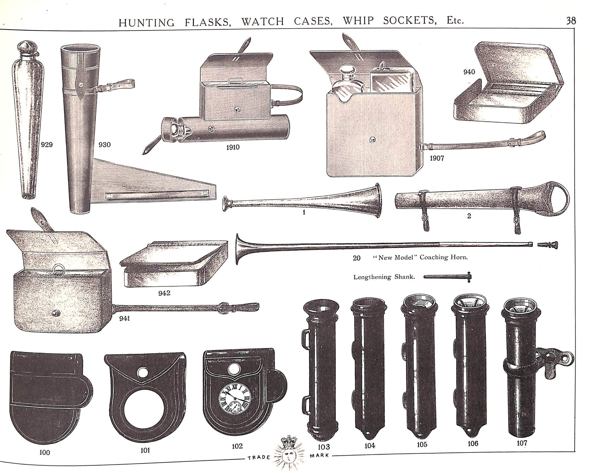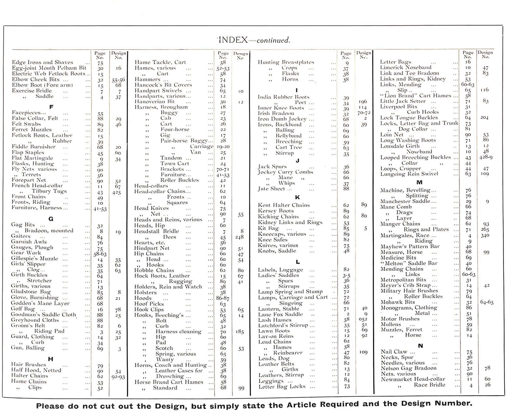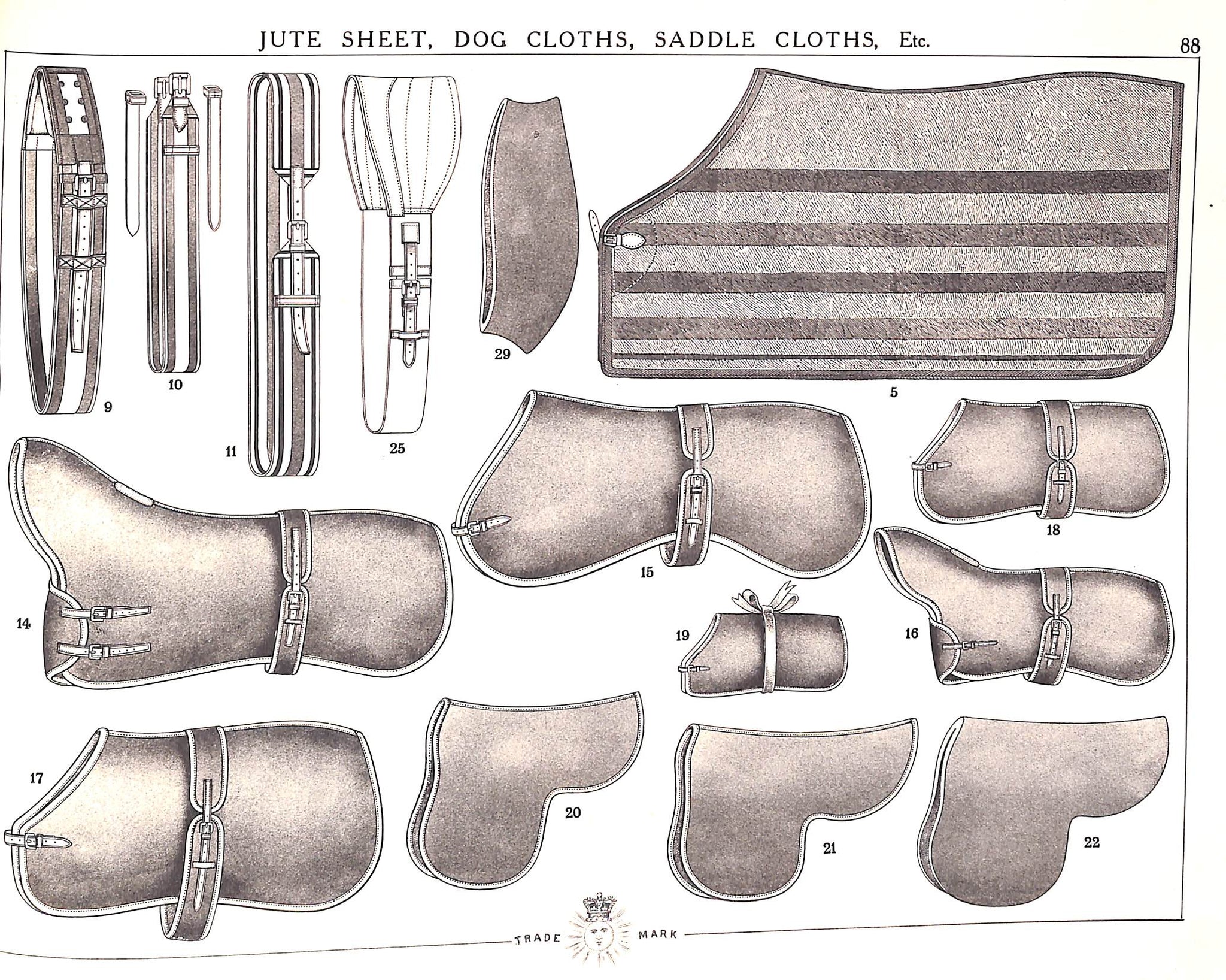 Plates include: saddles, sidesaddles, basket saddles, bridles, muzzles, boots, harness, bits, stirrups, spurs, whips, hunting flasks, horns, buckles, rosettes & stable clothing.