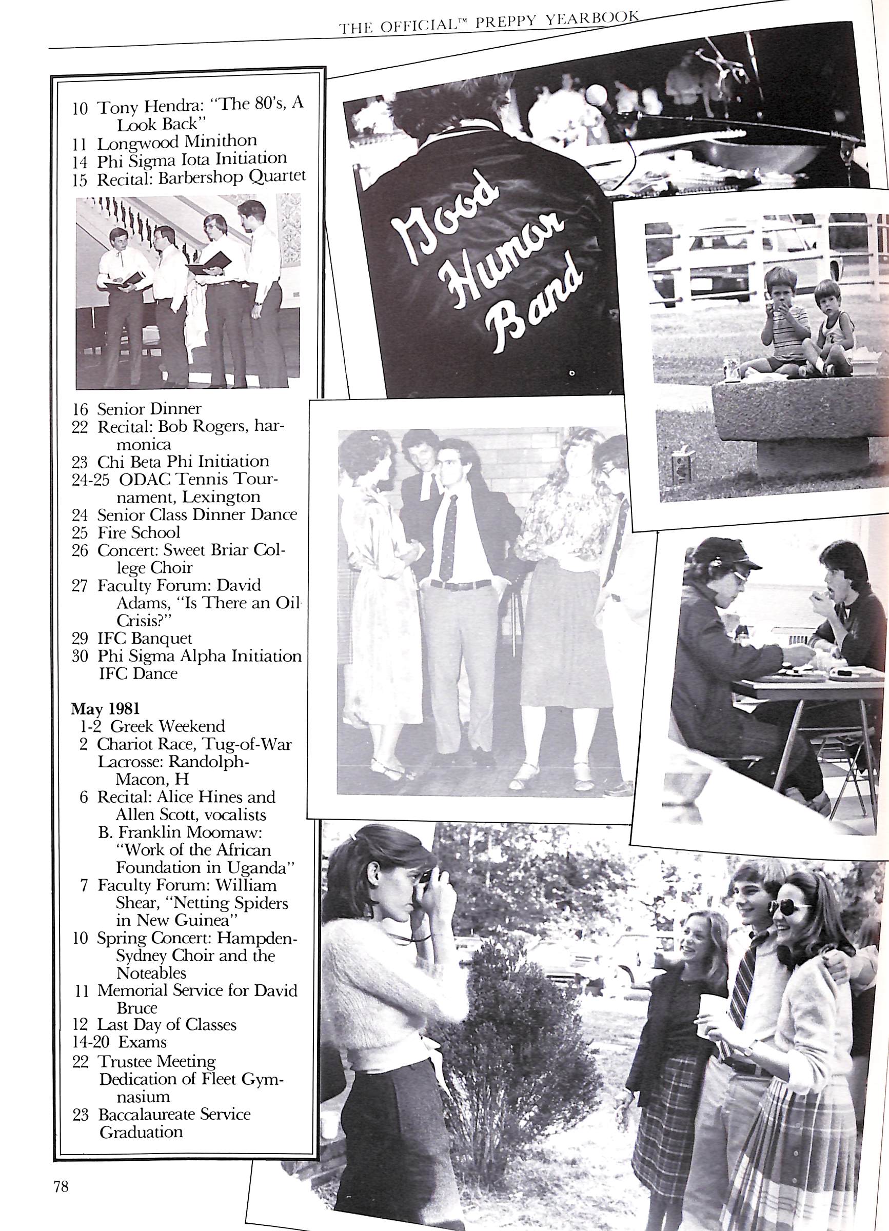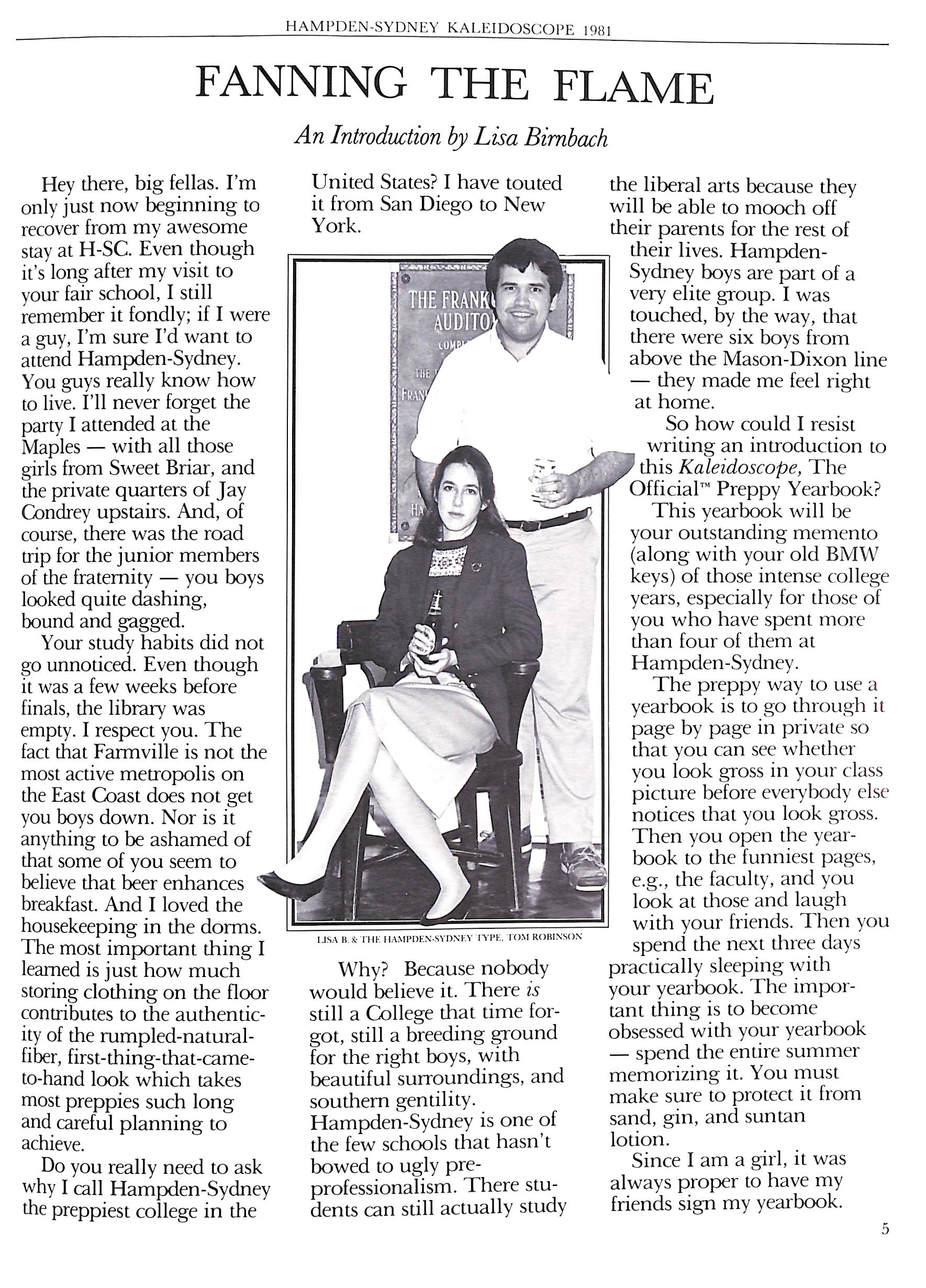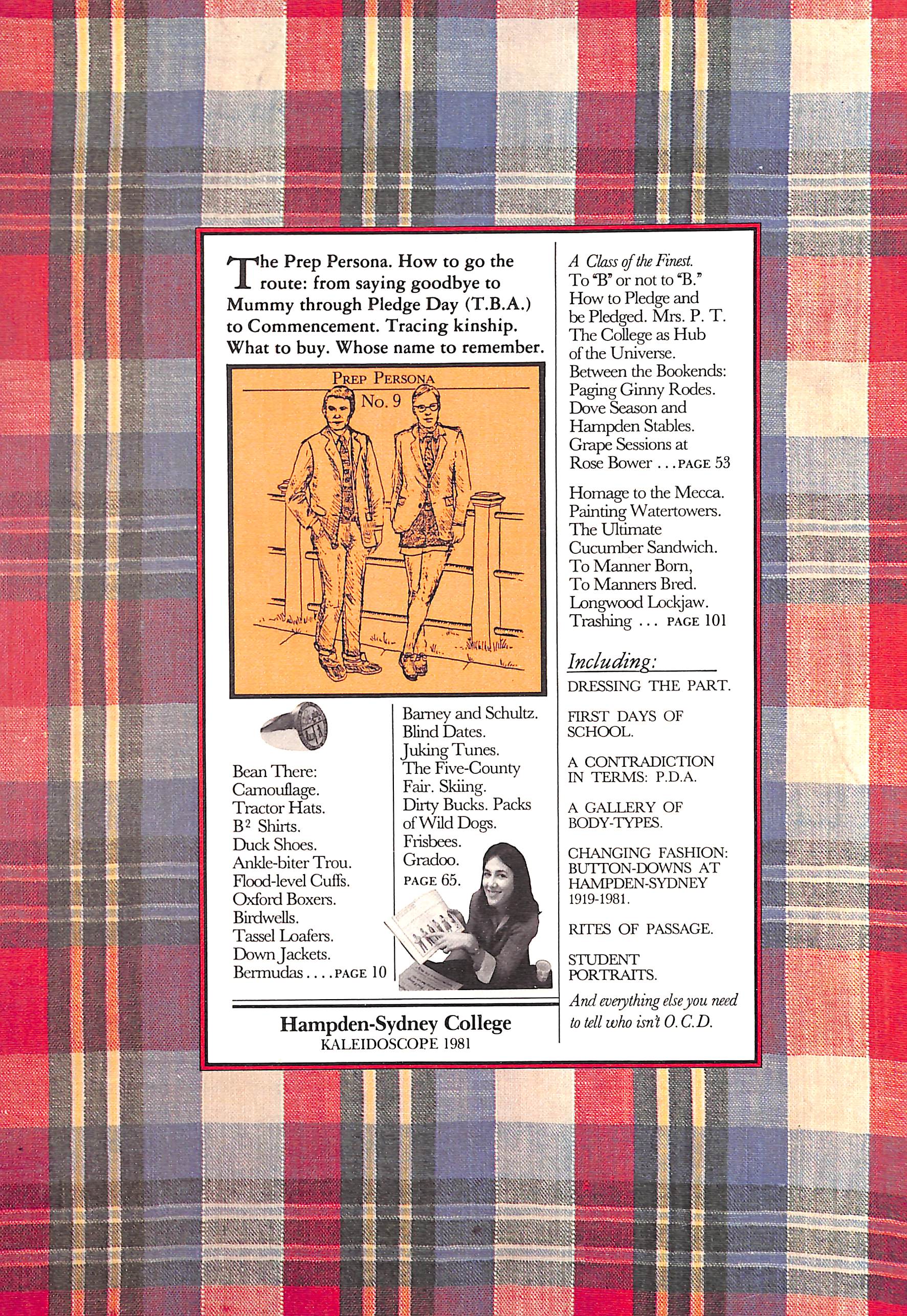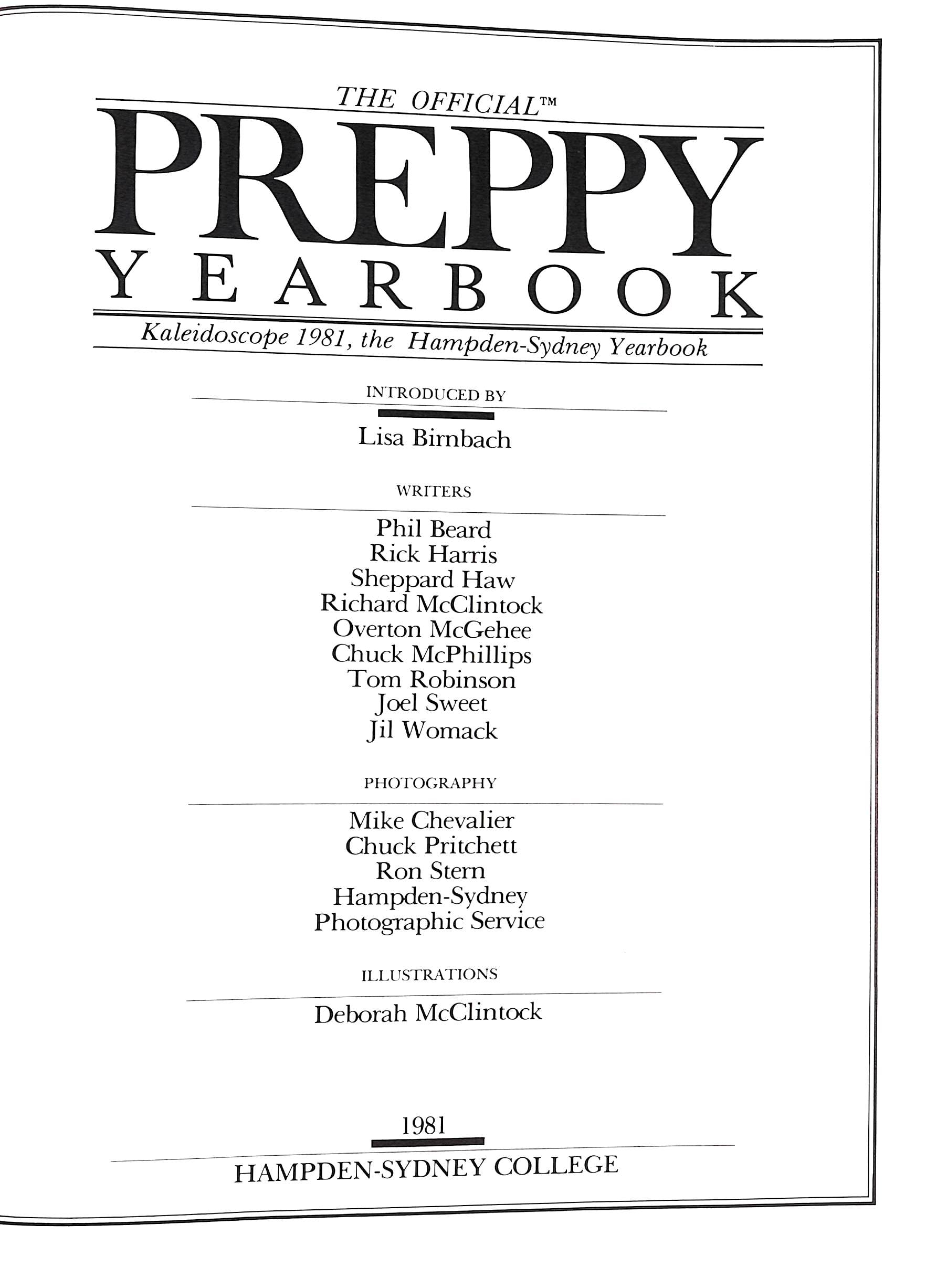 The dress code is khakis, sport shirts bearing the Lacoste Izod alligator and Sperry Topsiders, well-known white-soled boat shoes. So it was only fitting that the 1981 edition of Kaleidoscope came not only three years after graduation, but covered in madras plaid and bearing the title, "The Official Preppy Yearbook." "The wait has proved worthwhile, for showcased in this madras-bound yearbook is Hampden-Sydney life as it is meant to be," Robinson said. The cover is styled after "The Official Preppy Handbook" and the yearbook's introduction is written by the handbook's author, Lisa Birnbach. In her introduction, Ms. Birnbach praises Hampden-Sydney as "a College that time forgot, still a breeding ground for the right boys, with beautiful surroundings, and southern gentility.