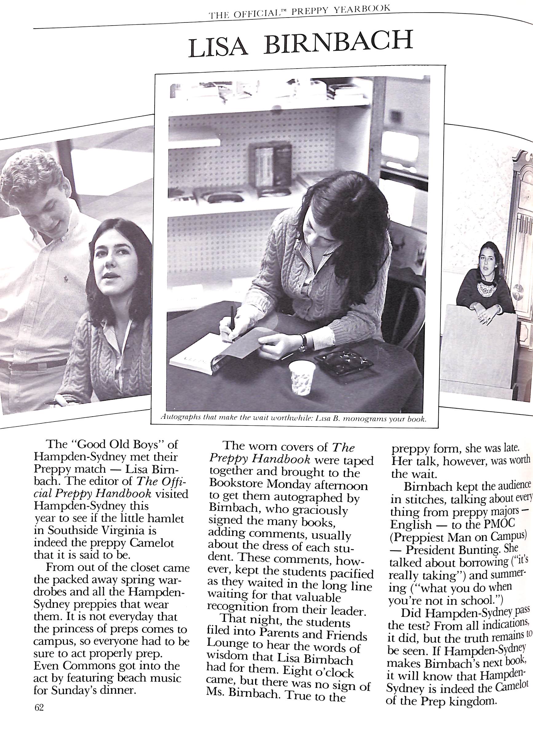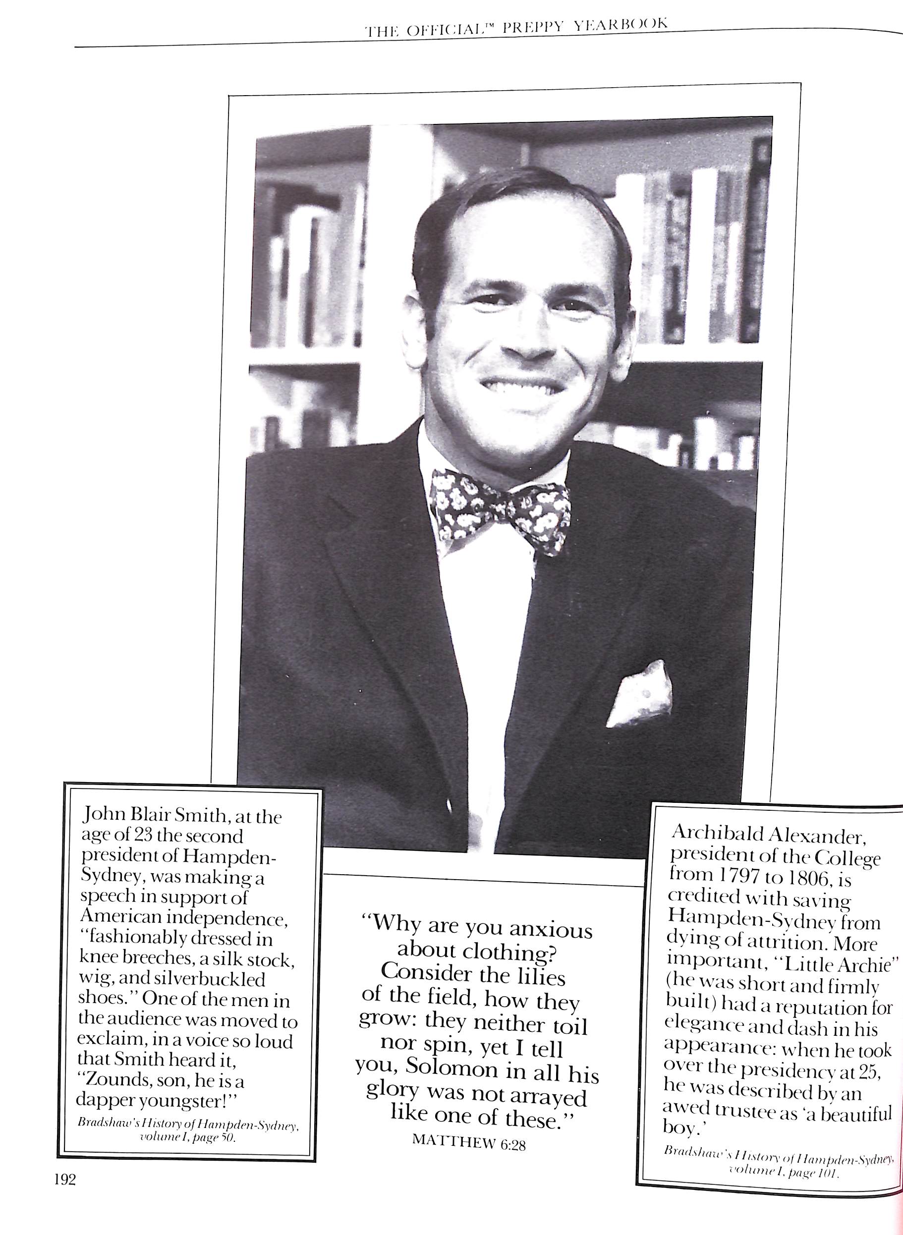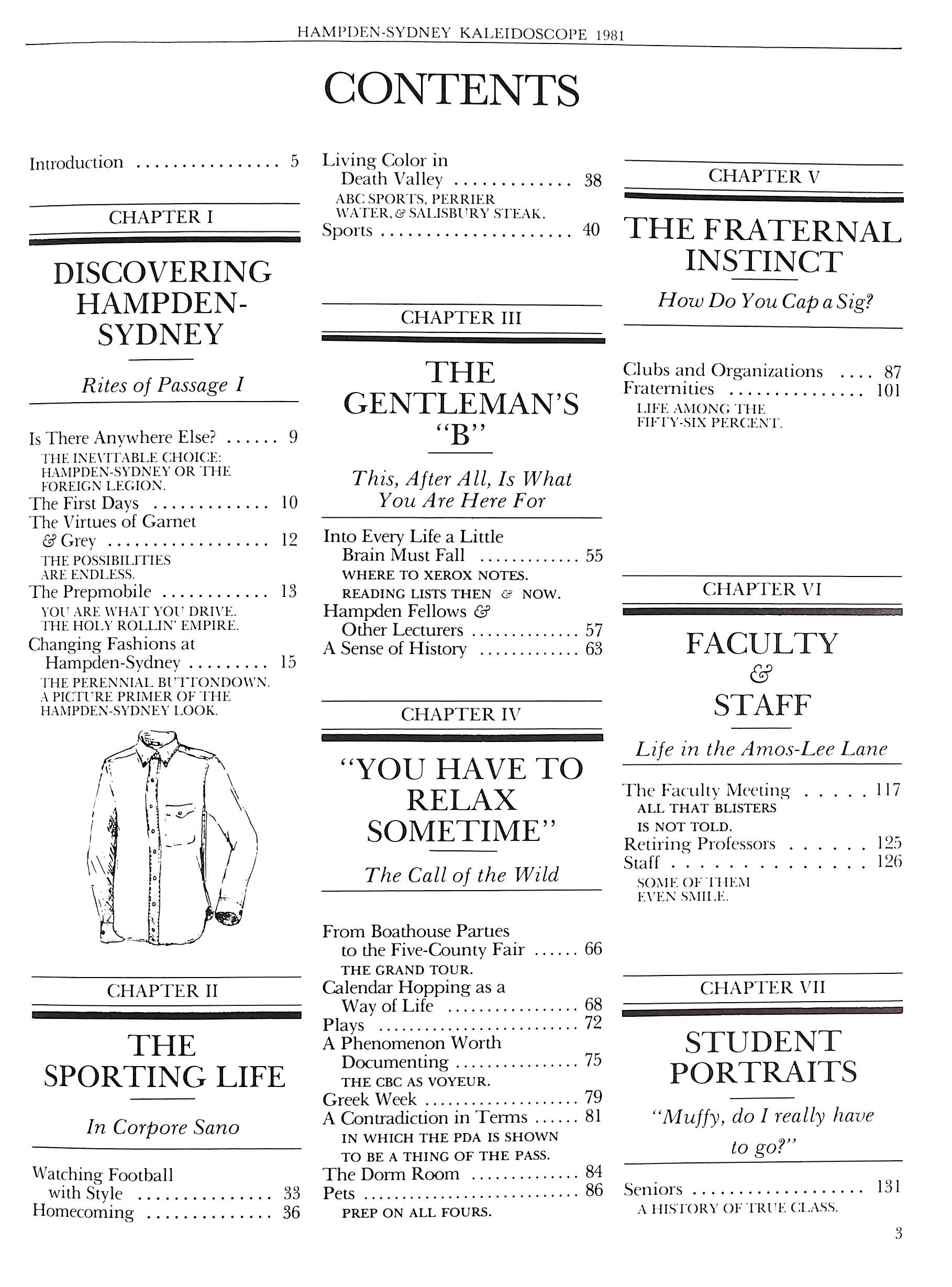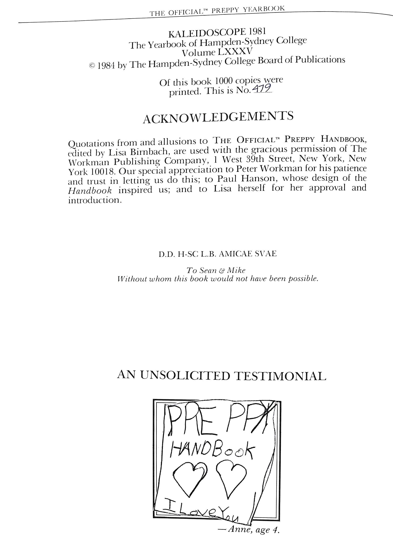 The dress code is khakis, sport shirts bearing the Lacoste Izod alligator and Sperry Topsiders, well-known white-soled boat shoes. So it was only fitting that the 1981 edition of Kaleidoscope came not only three years after graduation, but covered in madras plaid and bearing the title, "The Official Preppy Yearbook." "The wait has proved worthwhile, for showcased in this madras-bound yearbook is Hampden-Sydney life as it is meant to be," Robinson said. The cover is styled after "The Official Preppy Handbook" and the yearbook's introduction is written by the handbook's author, Lisa Birnbach. In her introduction, Ms. Birnbach praises Hampden-Sydney as "a College that time forgot, still a breeding ground for the right boys, with beautiful surroundings, and southern gentility.