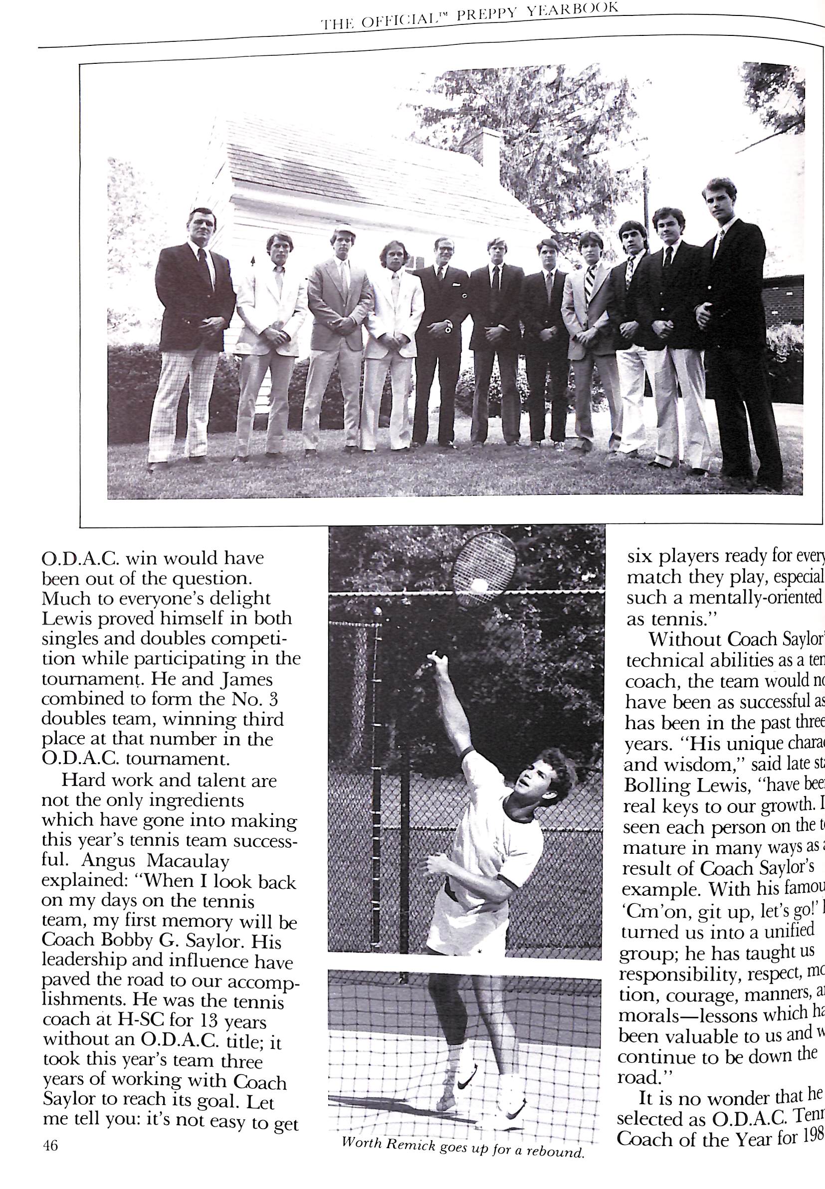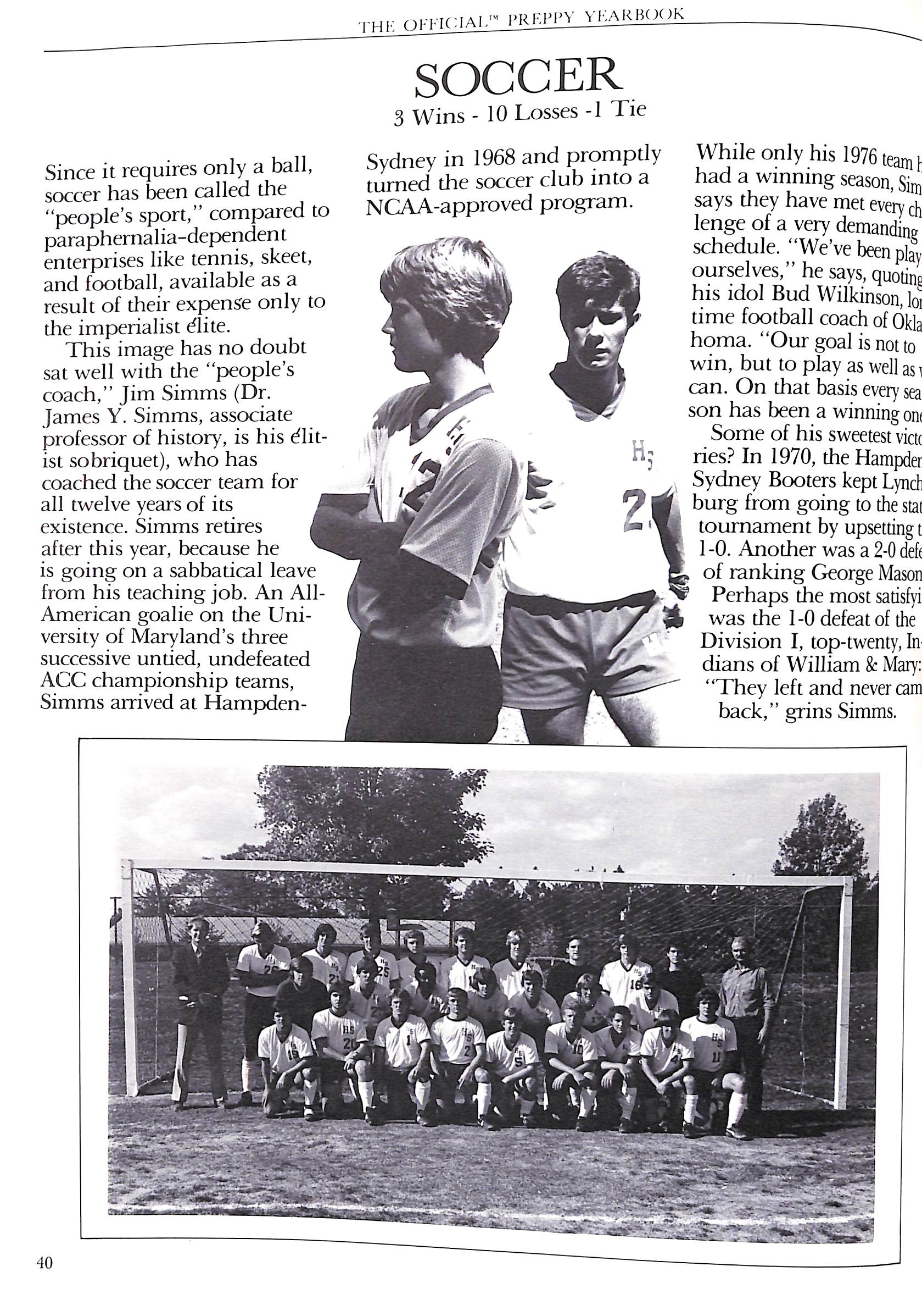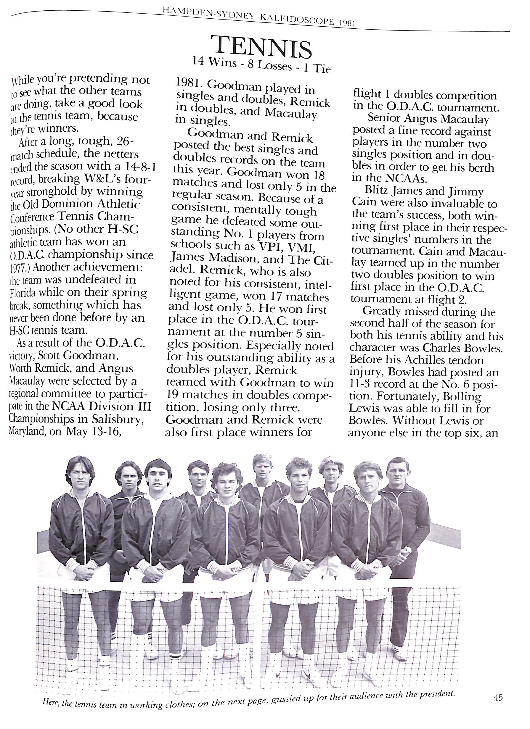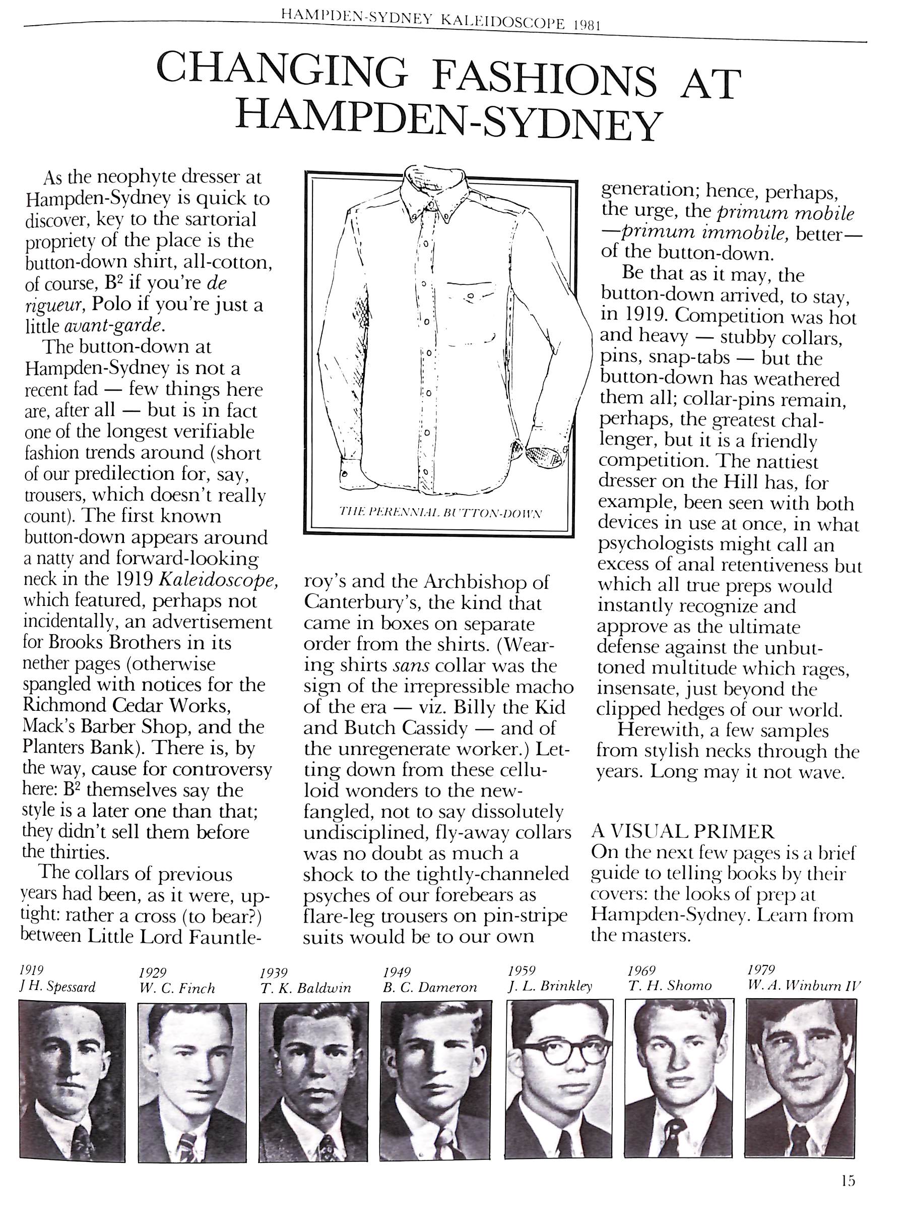 The dress code is khakis, sport shirts bearing the Lacoste Izod alligator and Sperry Topsiders, well-known white-soled boat shoes. So it was only fitting that the 1981 edition of Kaleidoscope came not only three years after graduation, but covered in madras plaid and bearing the title, "The Official Preppy Yearbook." "The wait has proved worthwhile, for showcased in this madras-bound yearbook is Hampden-Sydney life as it is meant to be," Robinson said. The cover is styled after "The Official Preppy Handbook" and the yearbook's introduction is written by the handbook's author, Lisa Birnbach. In her introduction, Ms. Birnbach praises Hampden-Sydney as "a College that time forgot, still a breeding ground for the right boys, with beautiful surroundings, and southern gentility.