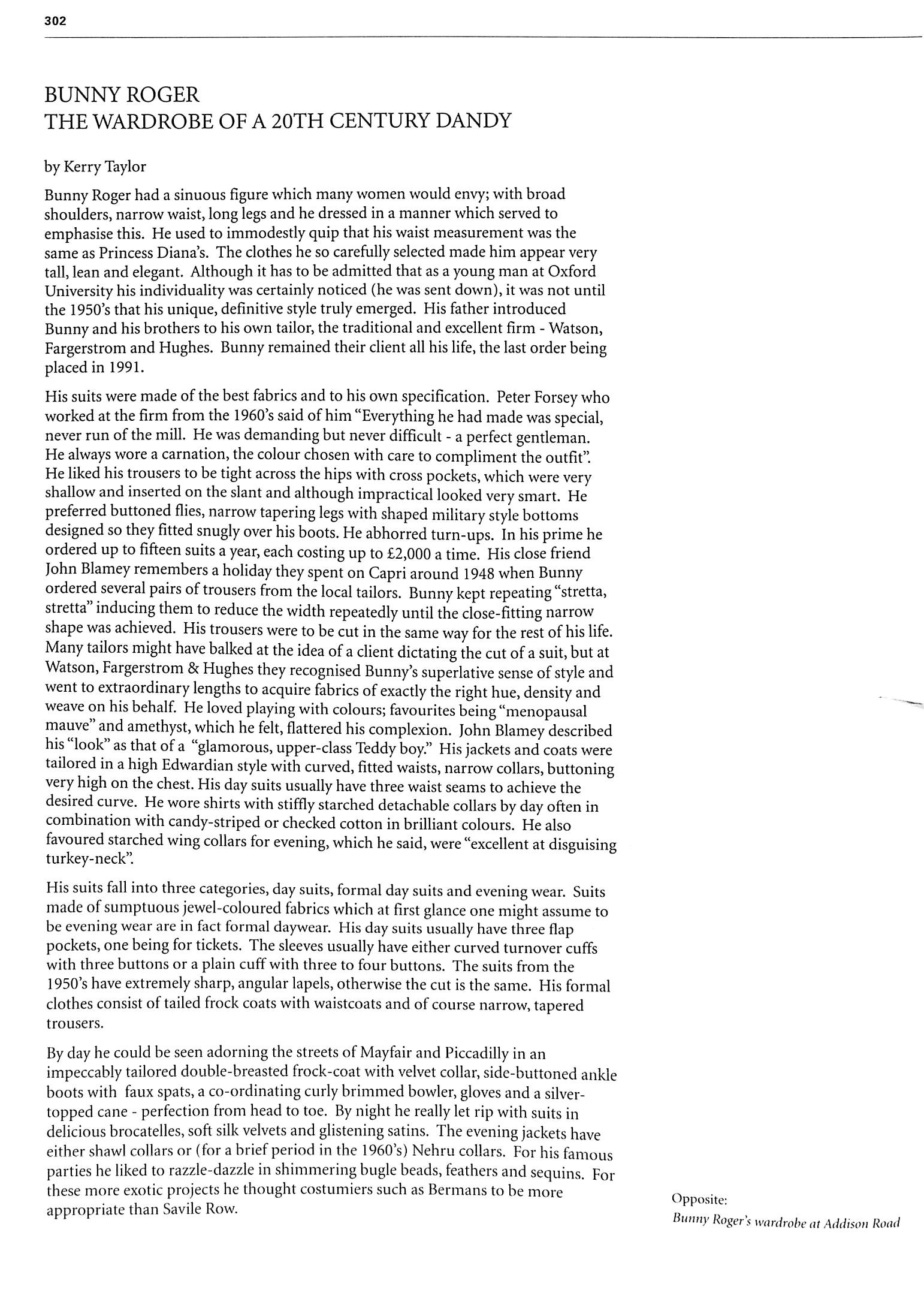 The catalogue for the sale of the contents of the London and Scottish homes of Bunny (Neil), Alan and Alastair Roger. The three bachelor brothers amassed a huge collection of furniture, decorative objects and pictures which were auctioned by Sotheby's in 1998. Photographs of their furnished houses in London and the Scottish Dundonnell estate are included. A selection of items from Bunny Roger's wardrobe are listed, including a couple of extraordinary sequinned cat-suits.