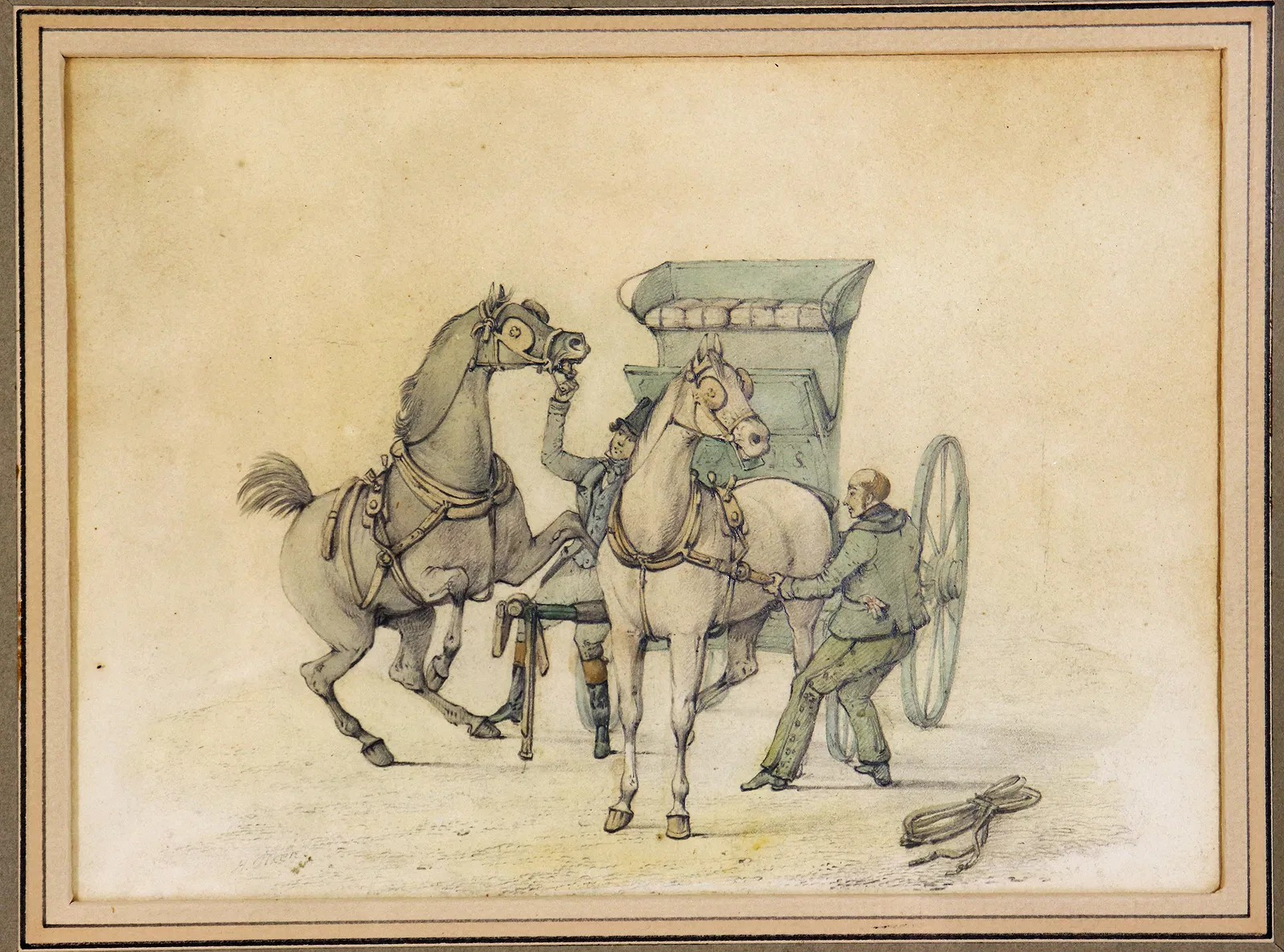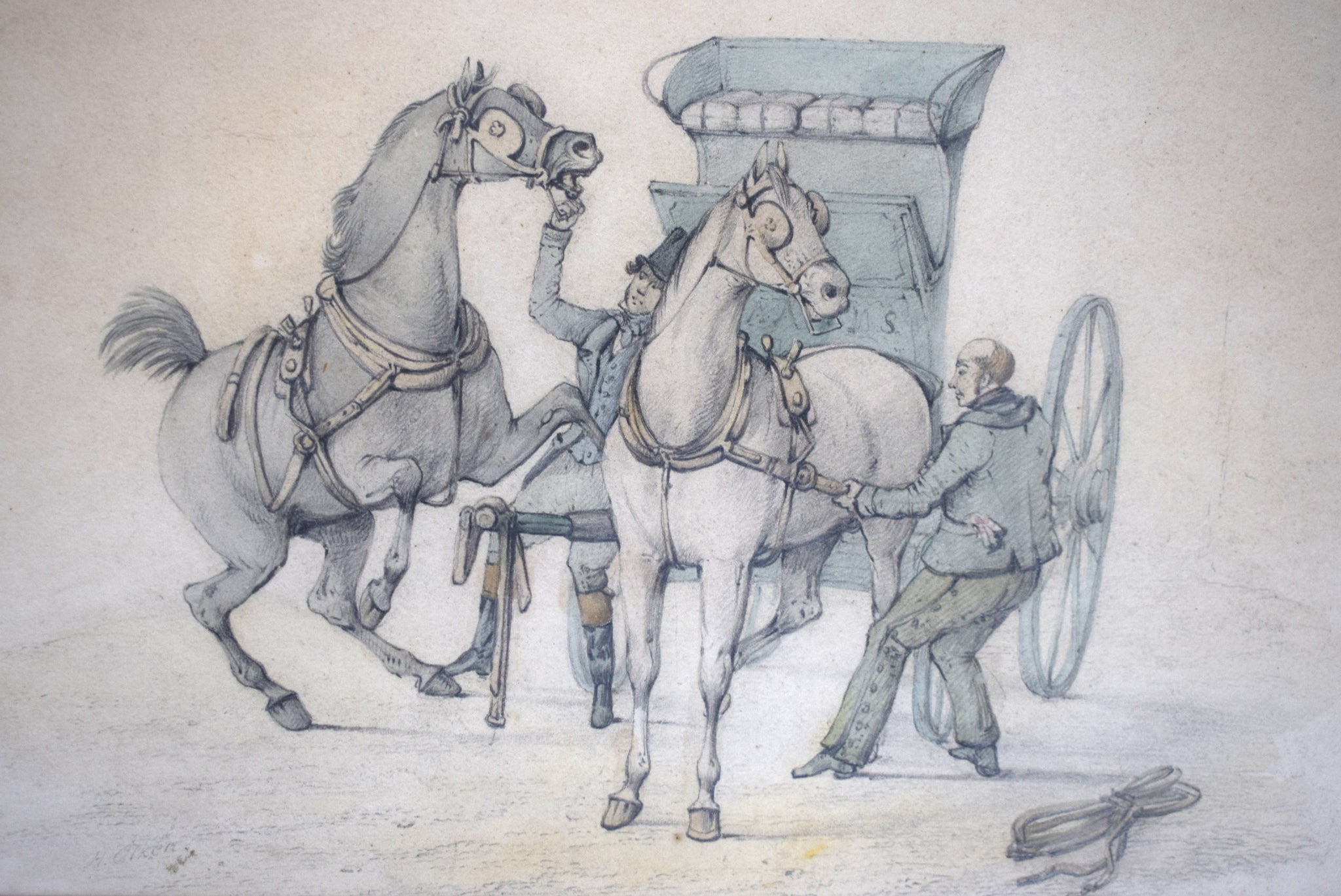 Putting a Pair to a Horse-Breakers Skeleton Brake" 18th C. Watercolour by Henry T. Alken Sr.