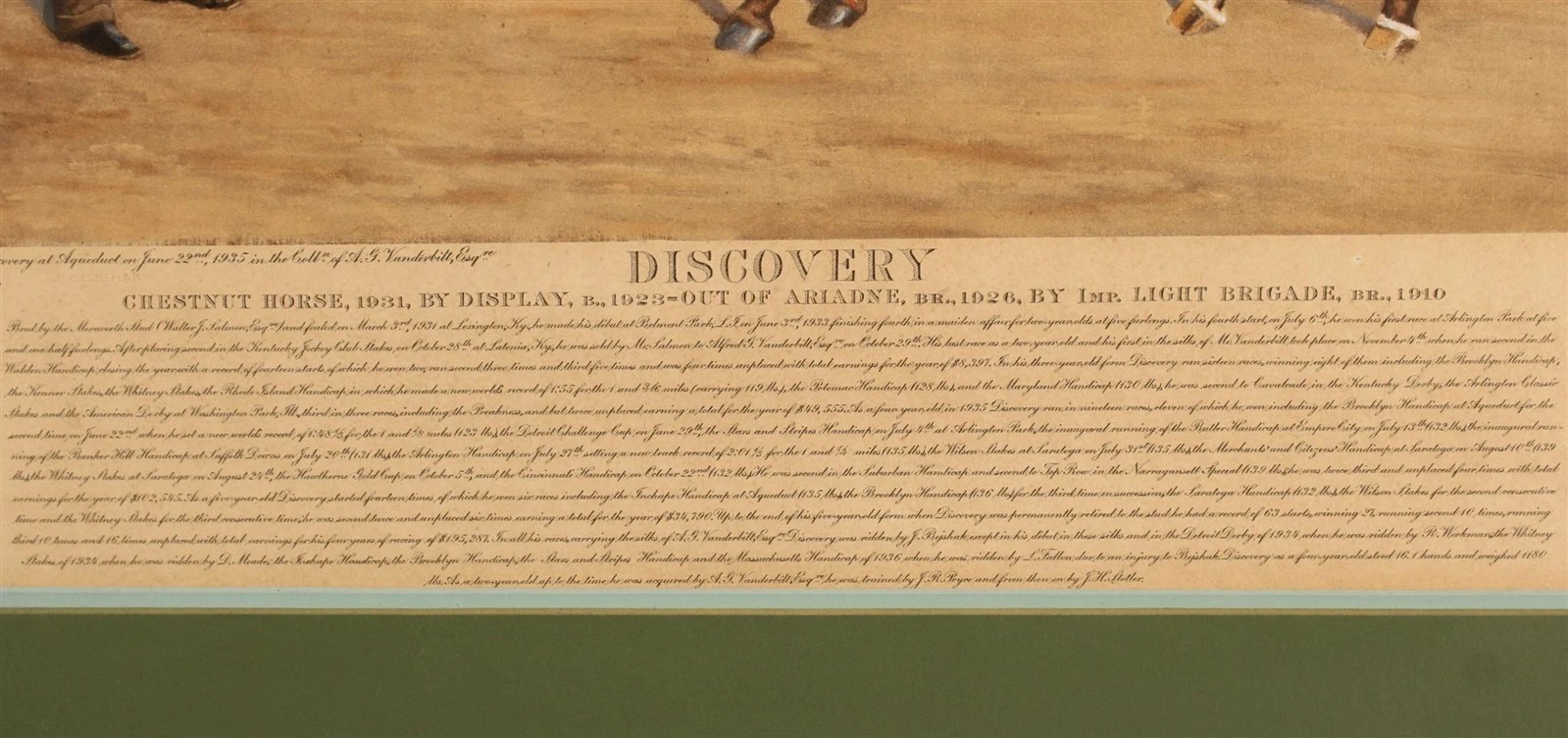 Hand-signed and numbered by Franklin Brooke Voss, this 1936 limited edition Chromolithograph is after his original 1935 painting depicting the racehorse, Discovery, standing with his groom and Jockey, John Joseph Bejshak (1909-1969).