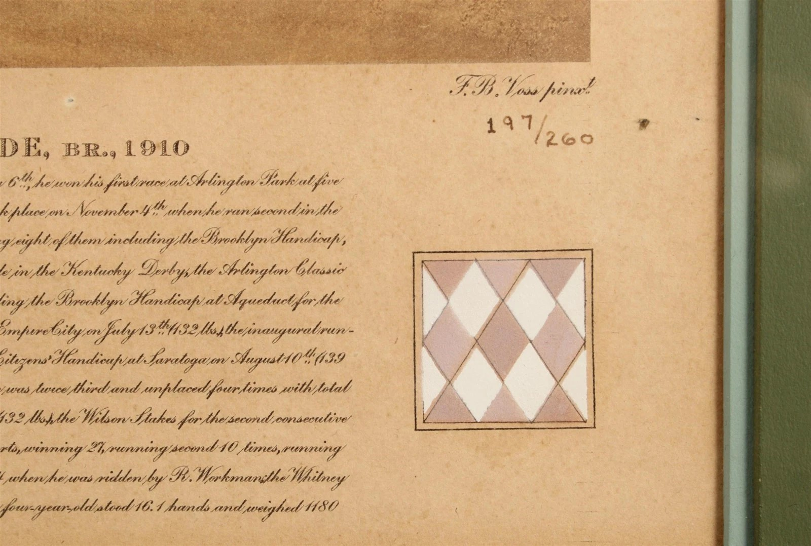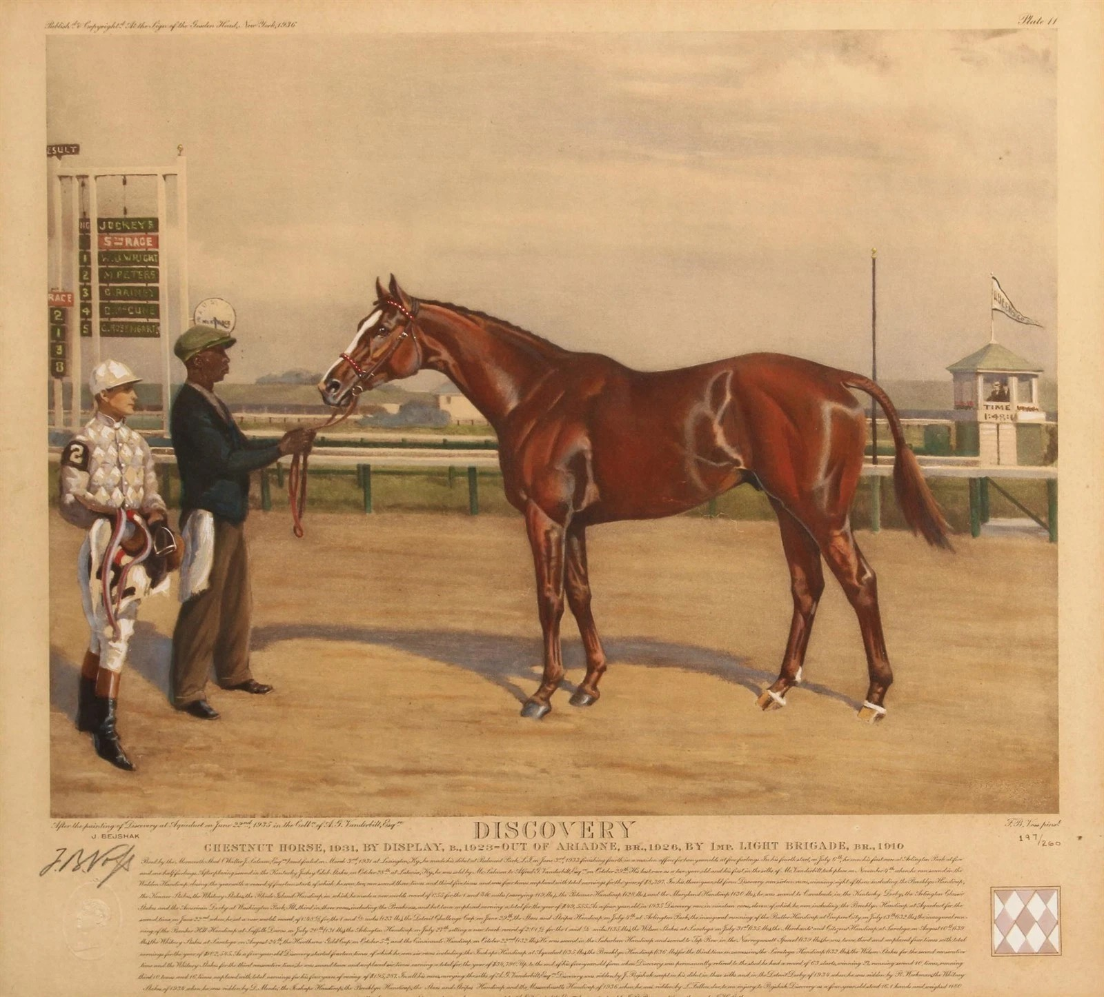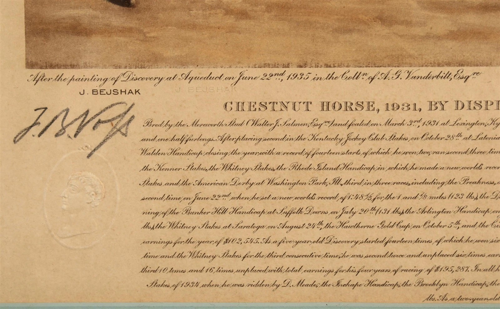 The Jockey's Name, “J. Bejshak,” is blind stamped into the paper, as well as a blind stamp of a Roman head beneath the pencil signature of Voss.