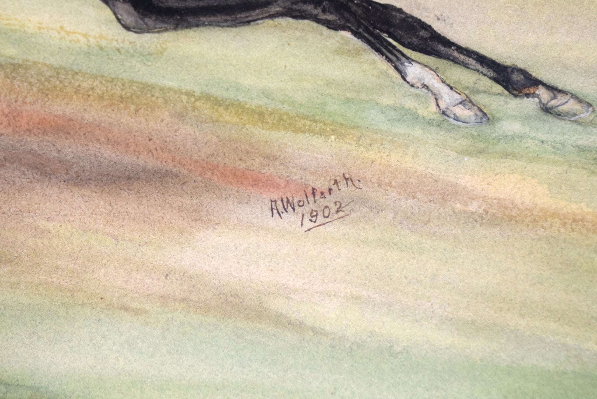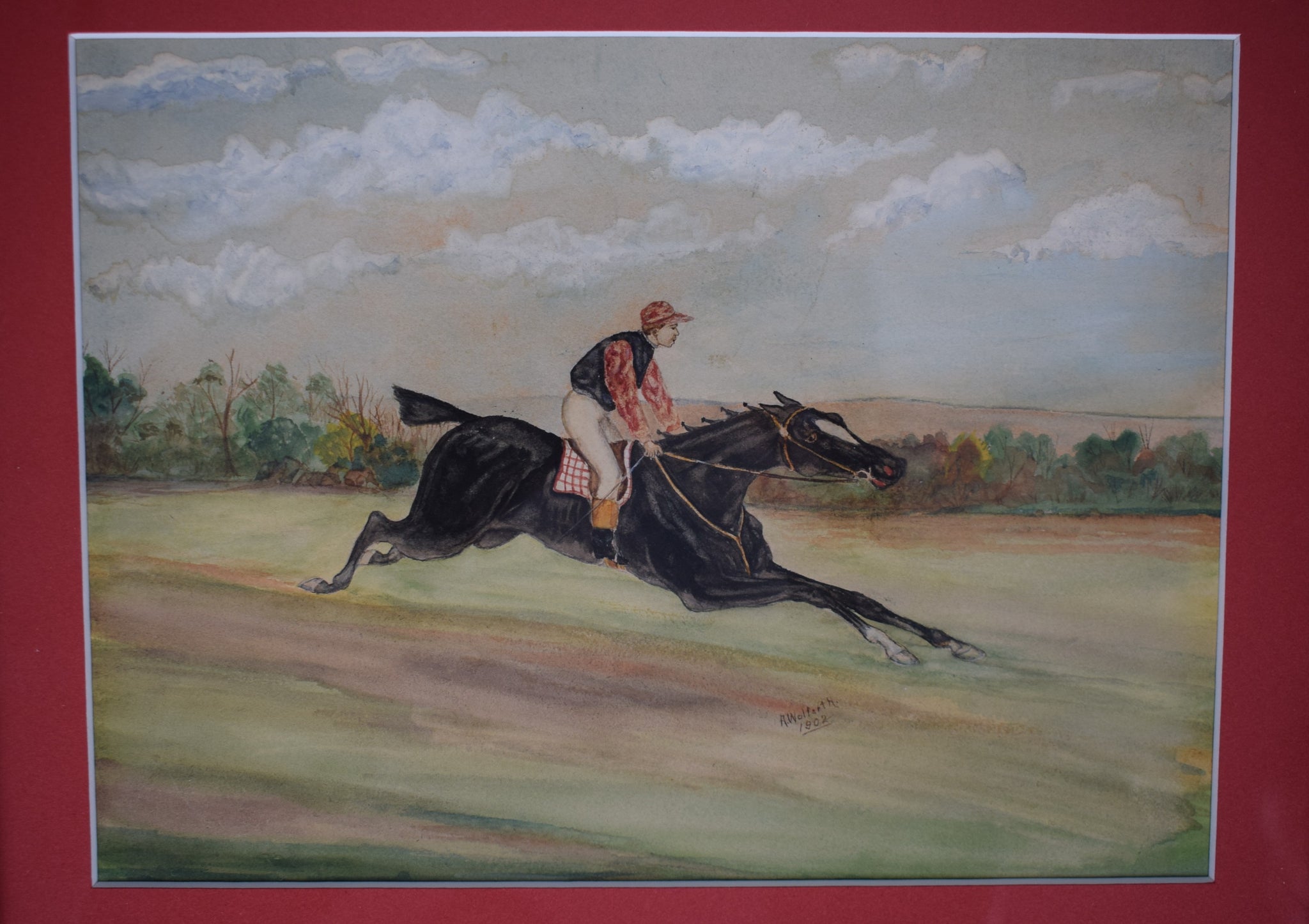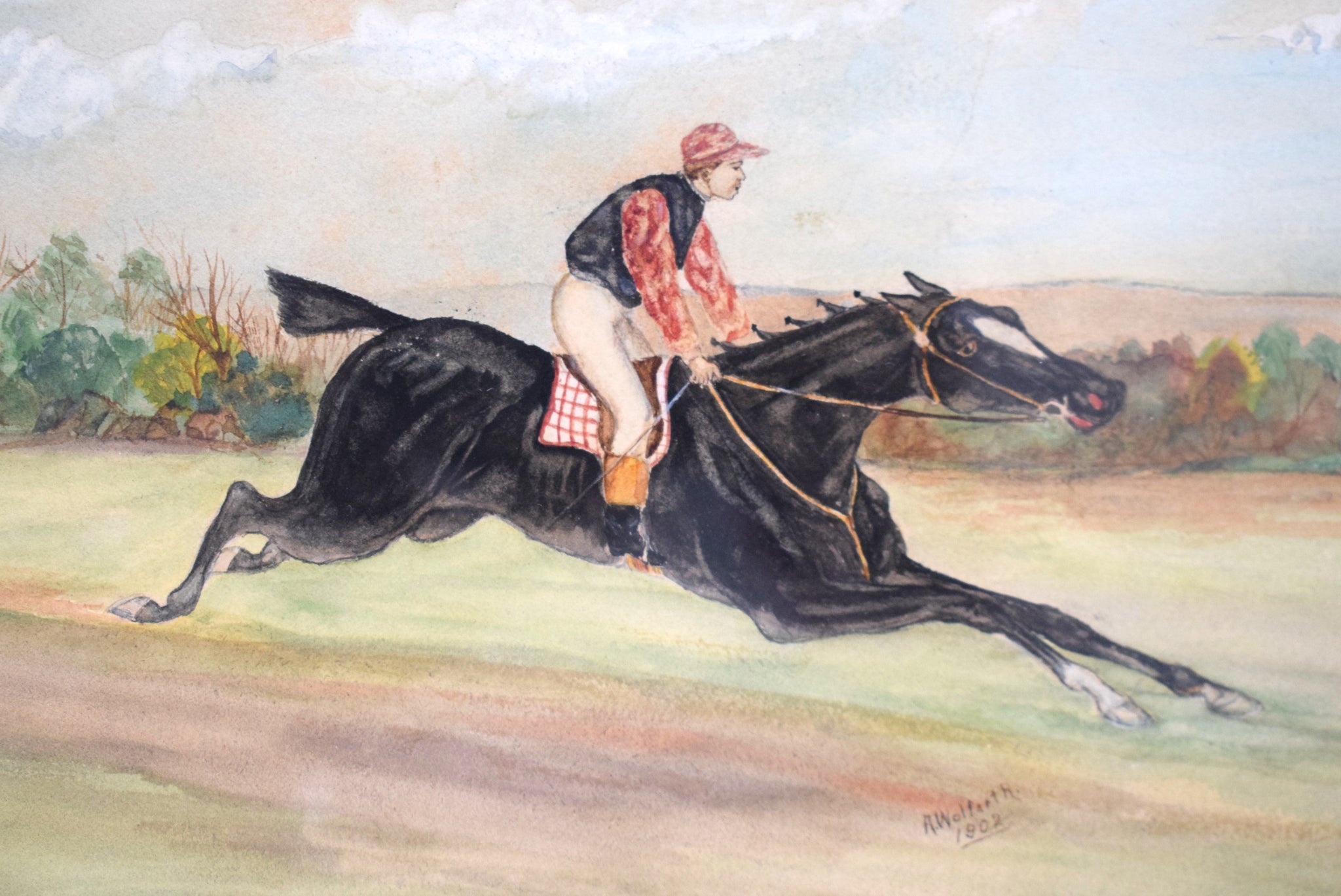 Jockey Astride Racehorse 1902 Watercolor by A. Wolfarth