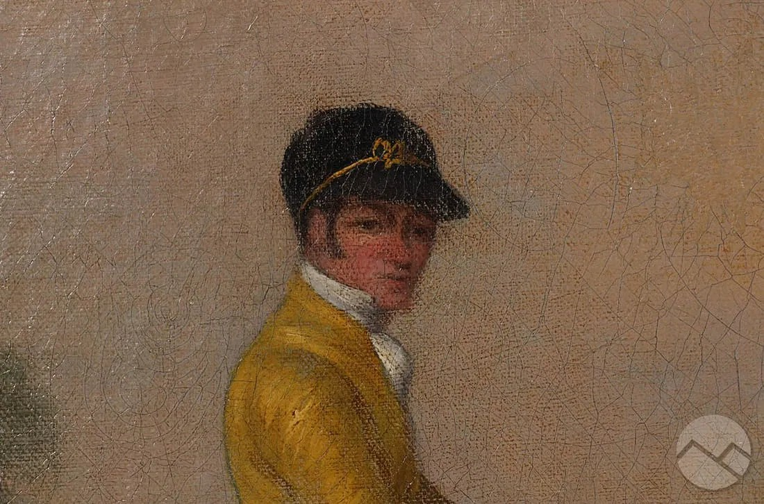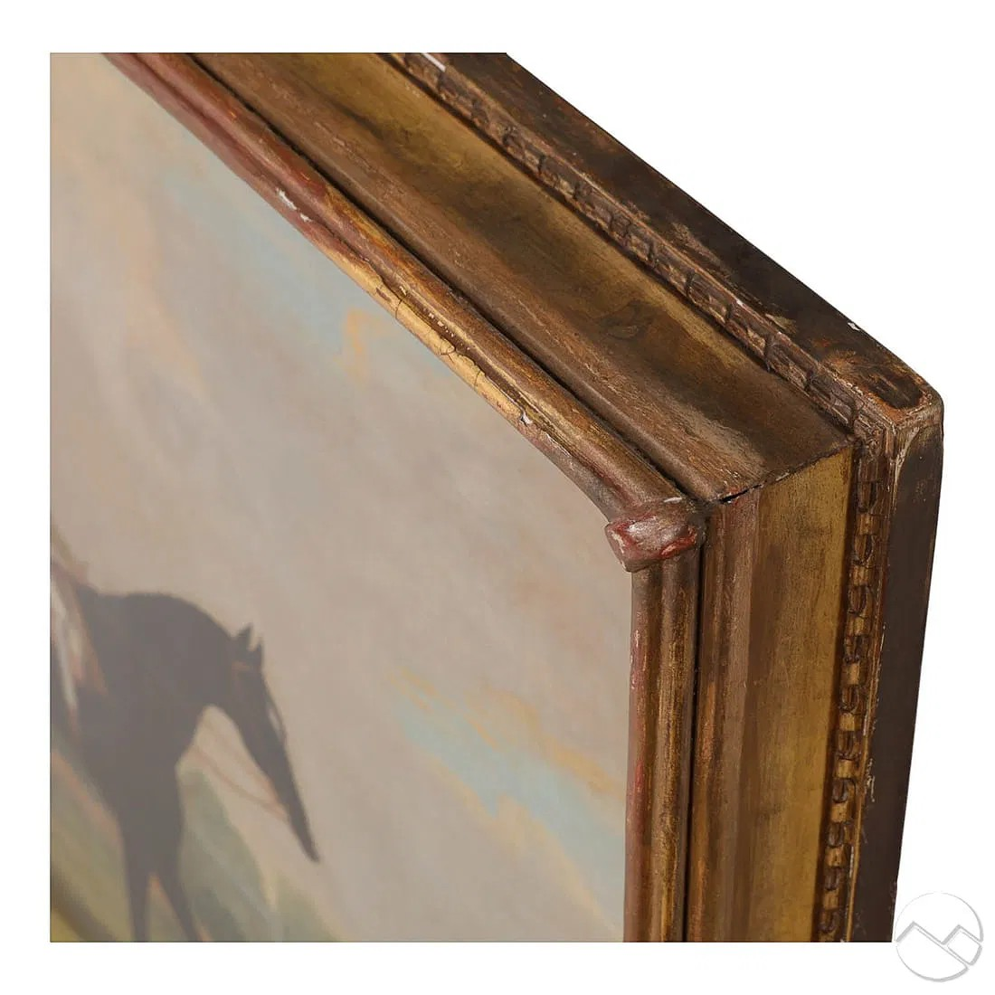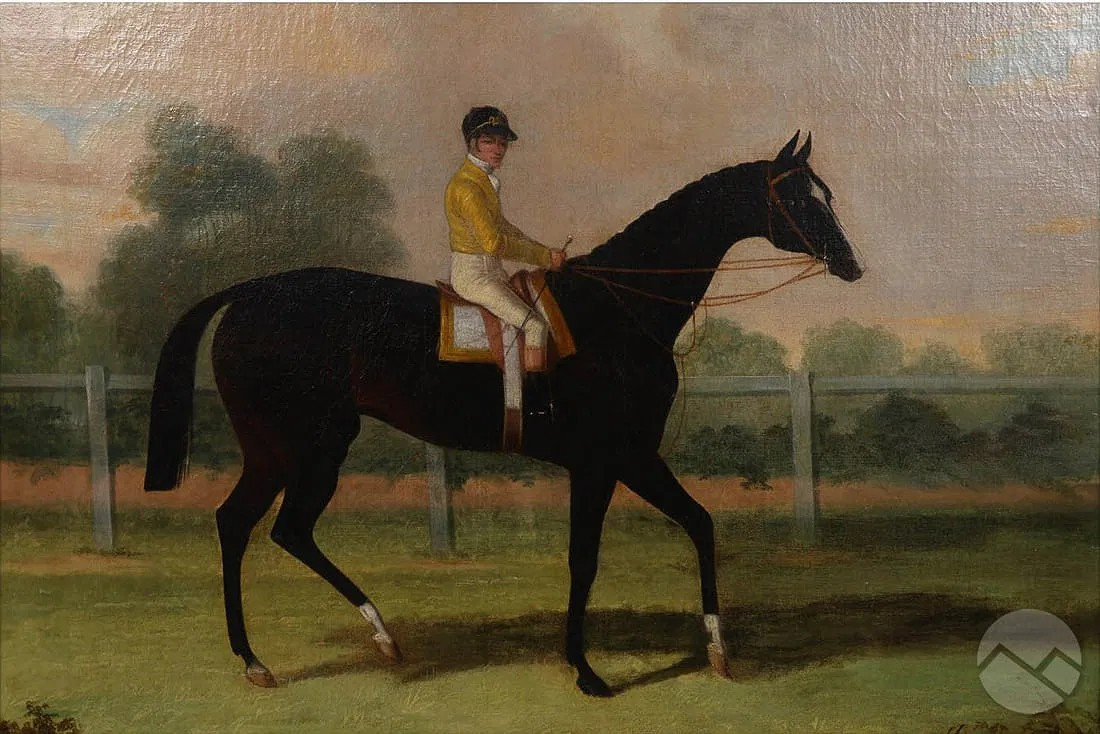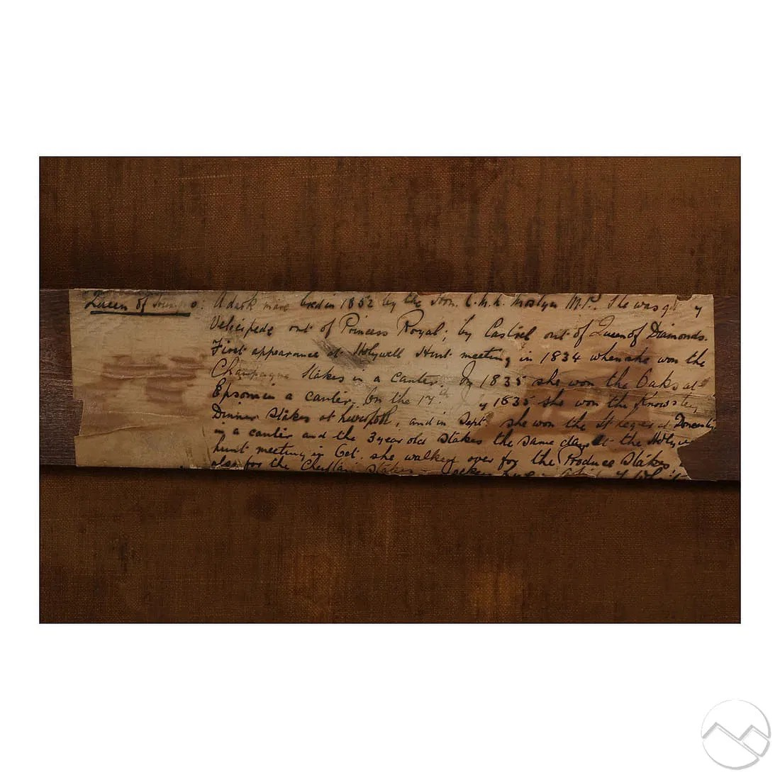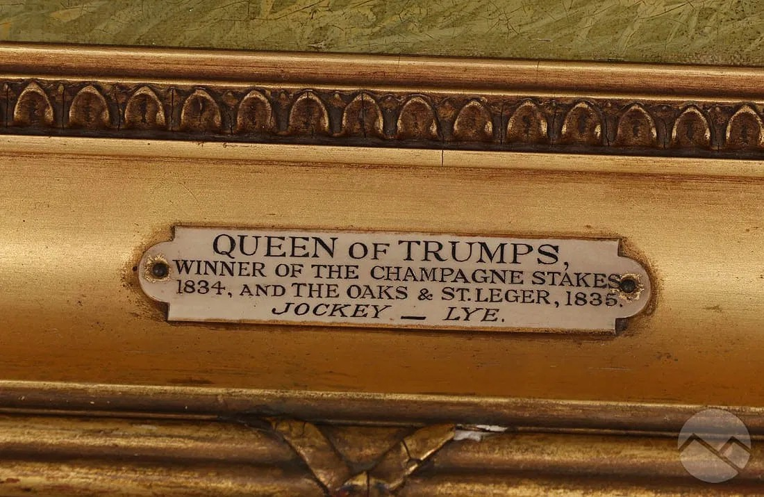 Antique English equestrian themed oil on canvas depicting the celebrated racehorse Queen of Trumps with jockey Lye in yellow silks. Signed by the artist at lower left. Presented in a gilt frame with a titled plaque. The reverse bears an aged handwritten inscription detailing the horse's lineage, breeder, trainer, and racing accomplishments. According to the inscription, "Foaled in 1832, bred by Lord Stamford and trained by John Scott, Queen of Trumps won the Champagne Stakes (1834), the Oaks, and the St. Leger Stakes (1835)."