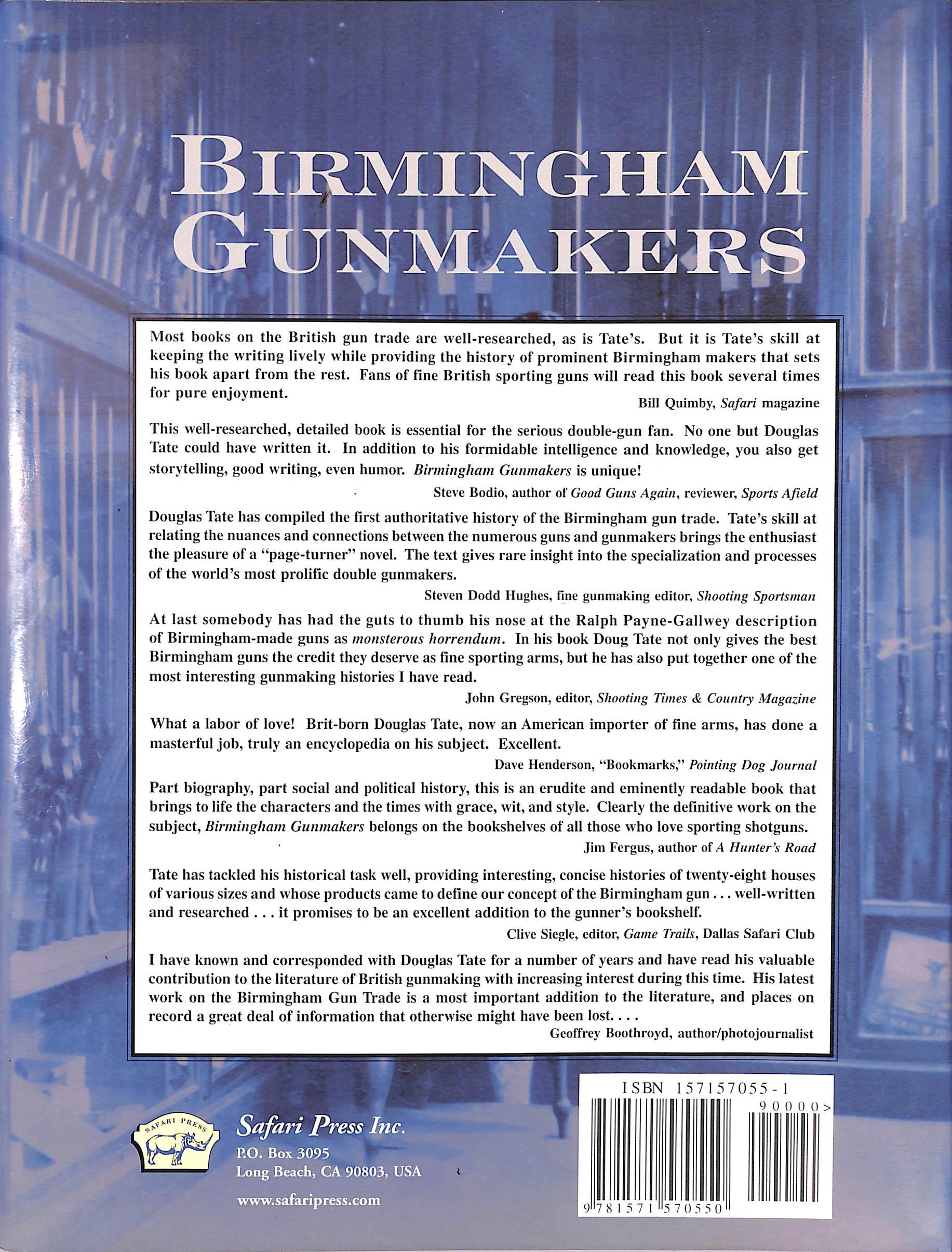 Birmingham Gunmakers is the most complete work ever published on this famous British gunmaking city. Tate gives a thorough overview of the origins of the Birmingham gun trade as well as a history of how the city came to the foreground as one of the sporting-gun manufacturing centers of the world. He covers the well-known makers as well as the obscure-those who have long since ceased production and vanished into the mists of time. Birmingham has produced some of the most famous names in the world of sporting guns such as W.W. Greener, William Powell, Westley Richards, and many others. All these are thoroughly covered, and the book is illustrated with some of the finest examples of their craftsmanship. The Birmingham Gun Barrel Proof House, buying and evaluating a Birmingham gun, as well as a glossary of gunmaker terms are also covered. An invaluable book for anyone interested in fine sporting arms.
