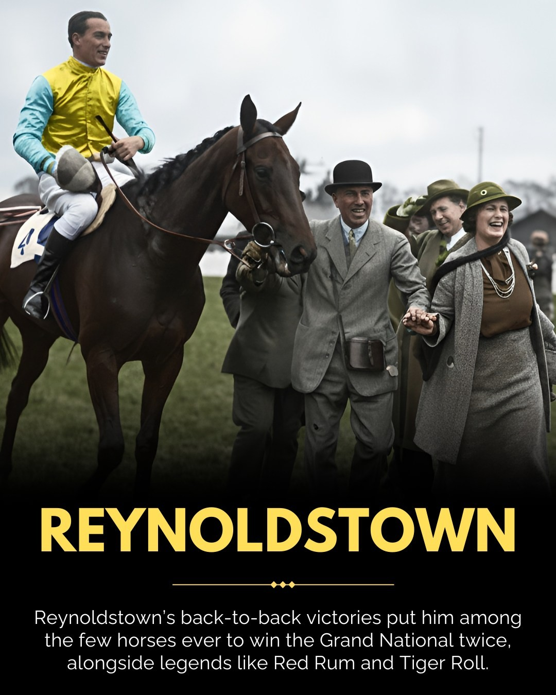 Reynoldstown, a 10/1 shot owned and trained by Major Noel Furlong and ridden by amateur jockey Fulke Walwyn, won the race for the second year in a row after being left clear by Davy Jones running out at the last fence.