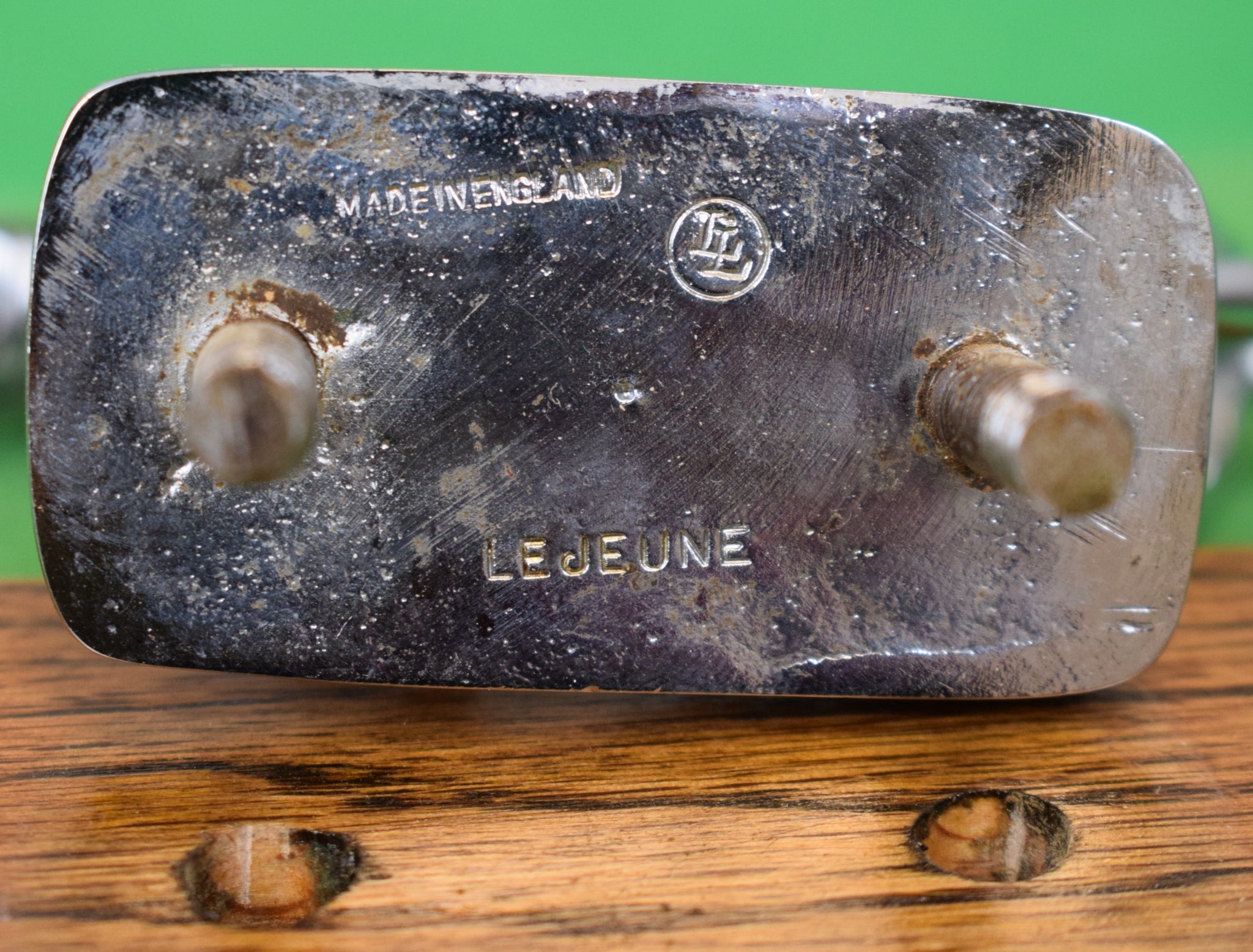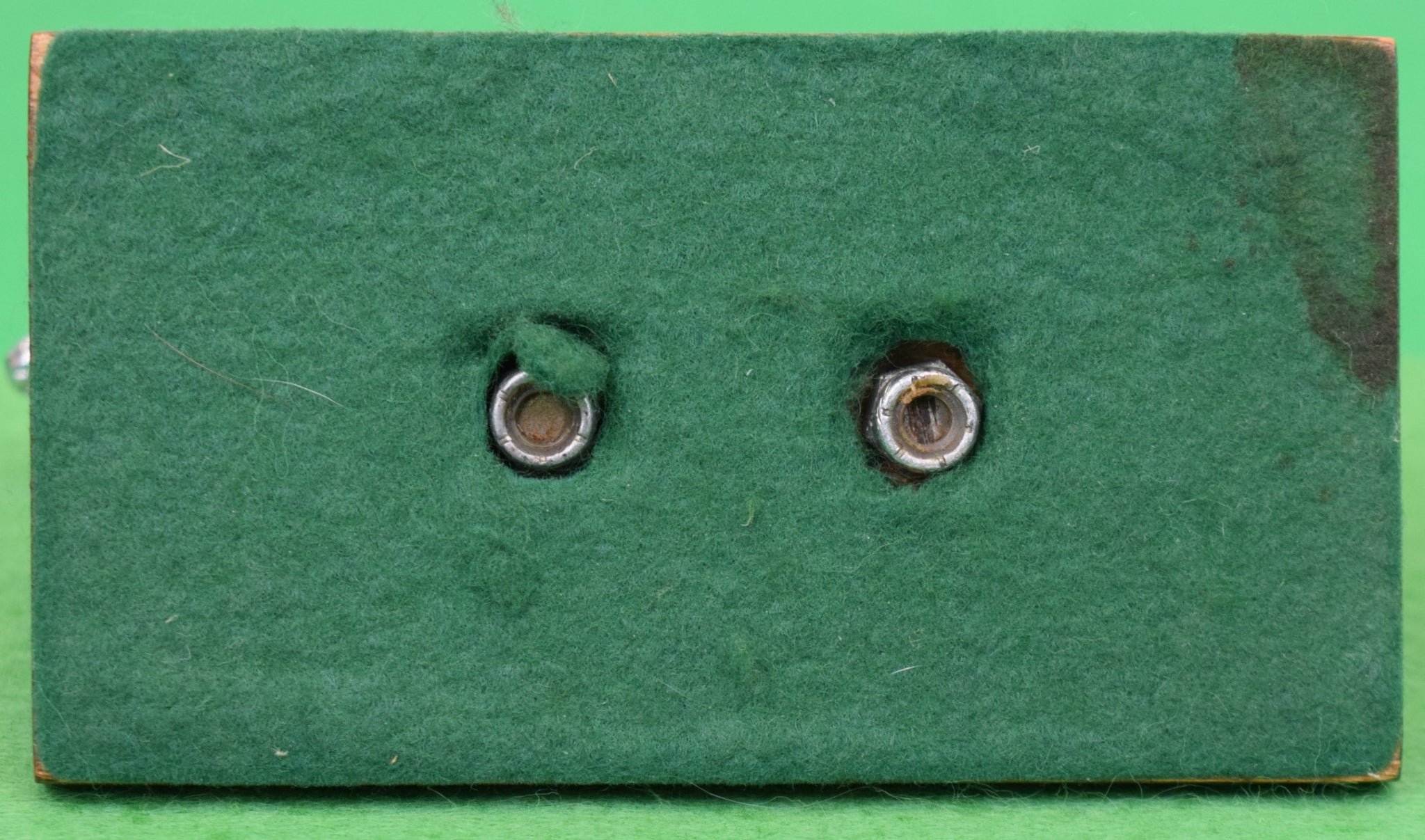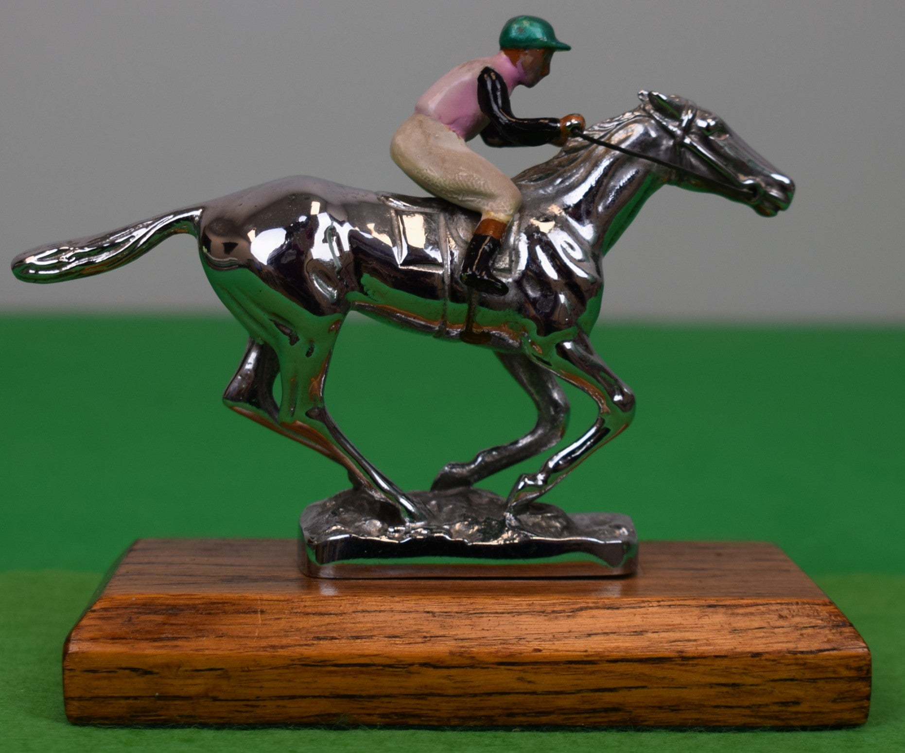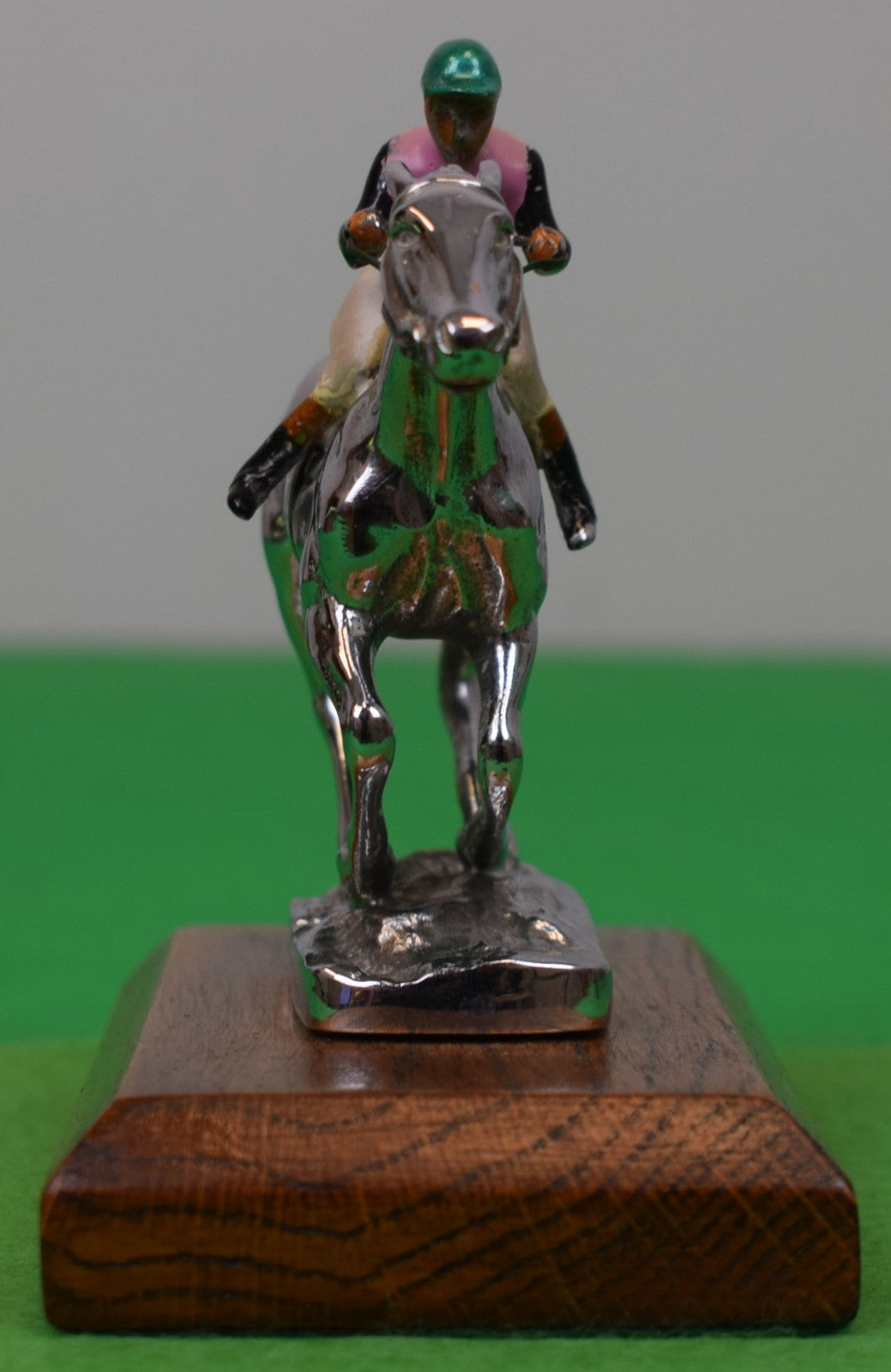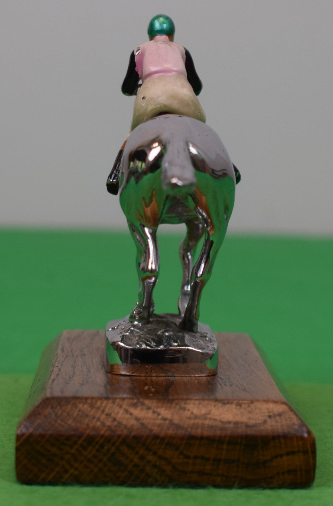 On wood plinth base/ w/ underside bolts for mounting on bonnet
